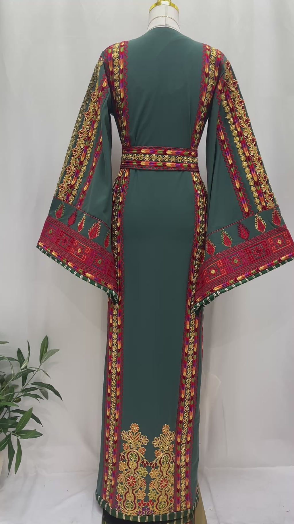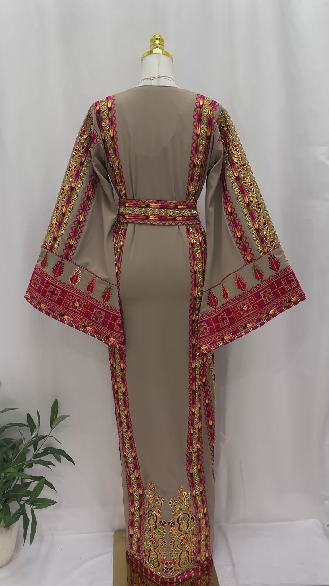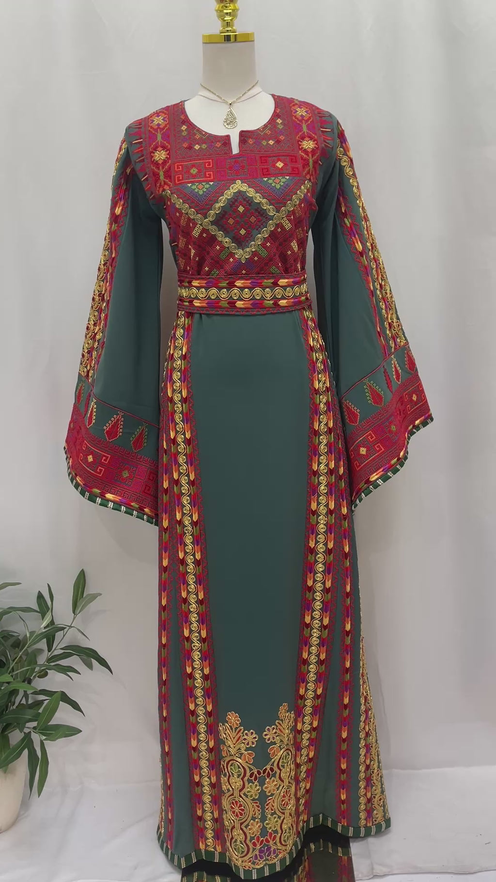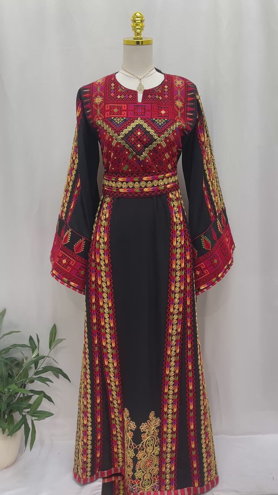 يأتي مع حزام مطرز مماثل ليمنح إطلالة ملكية راقية تجمع بين الفخامة والتراث الفلسطيني الأصيل.