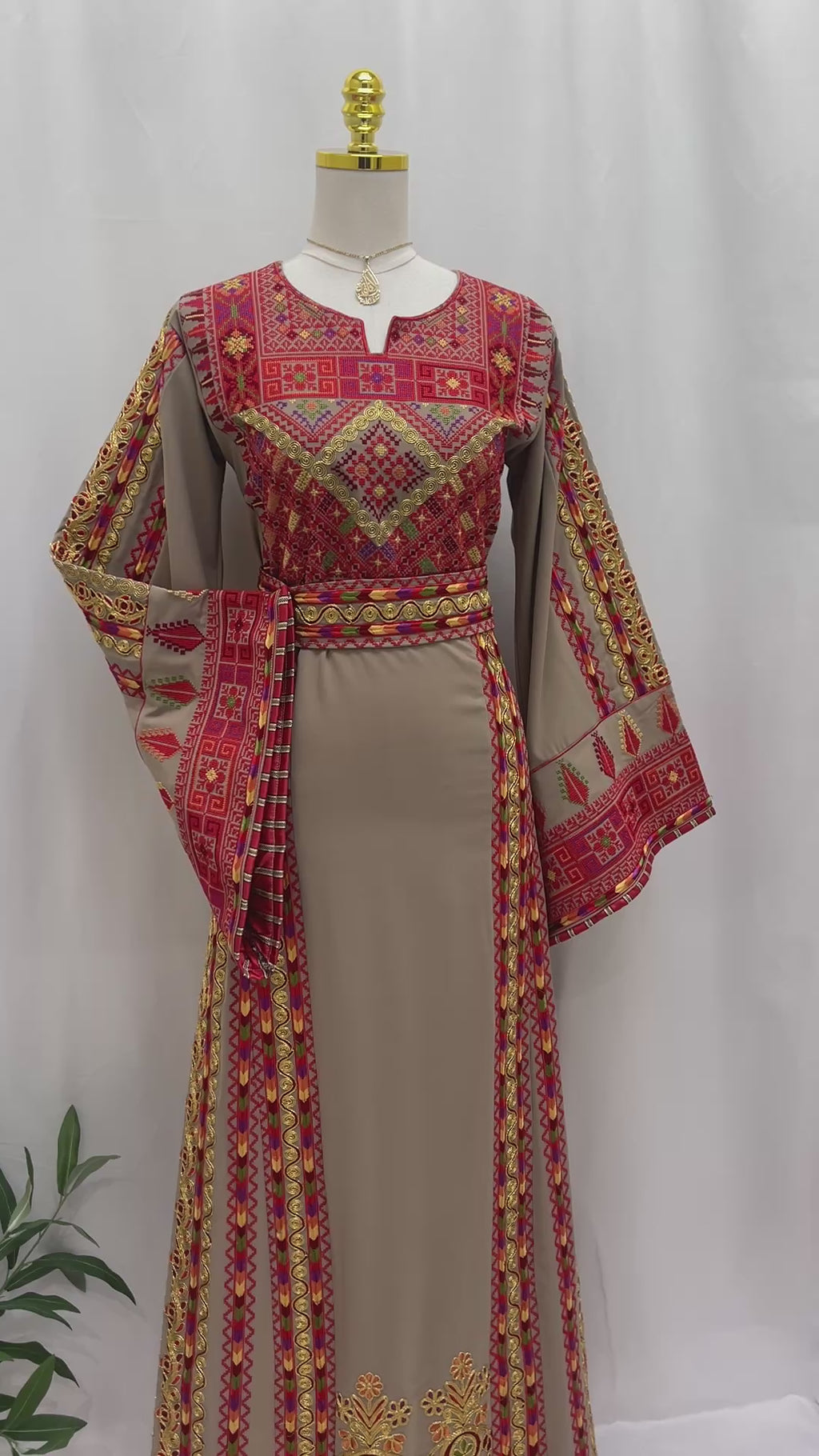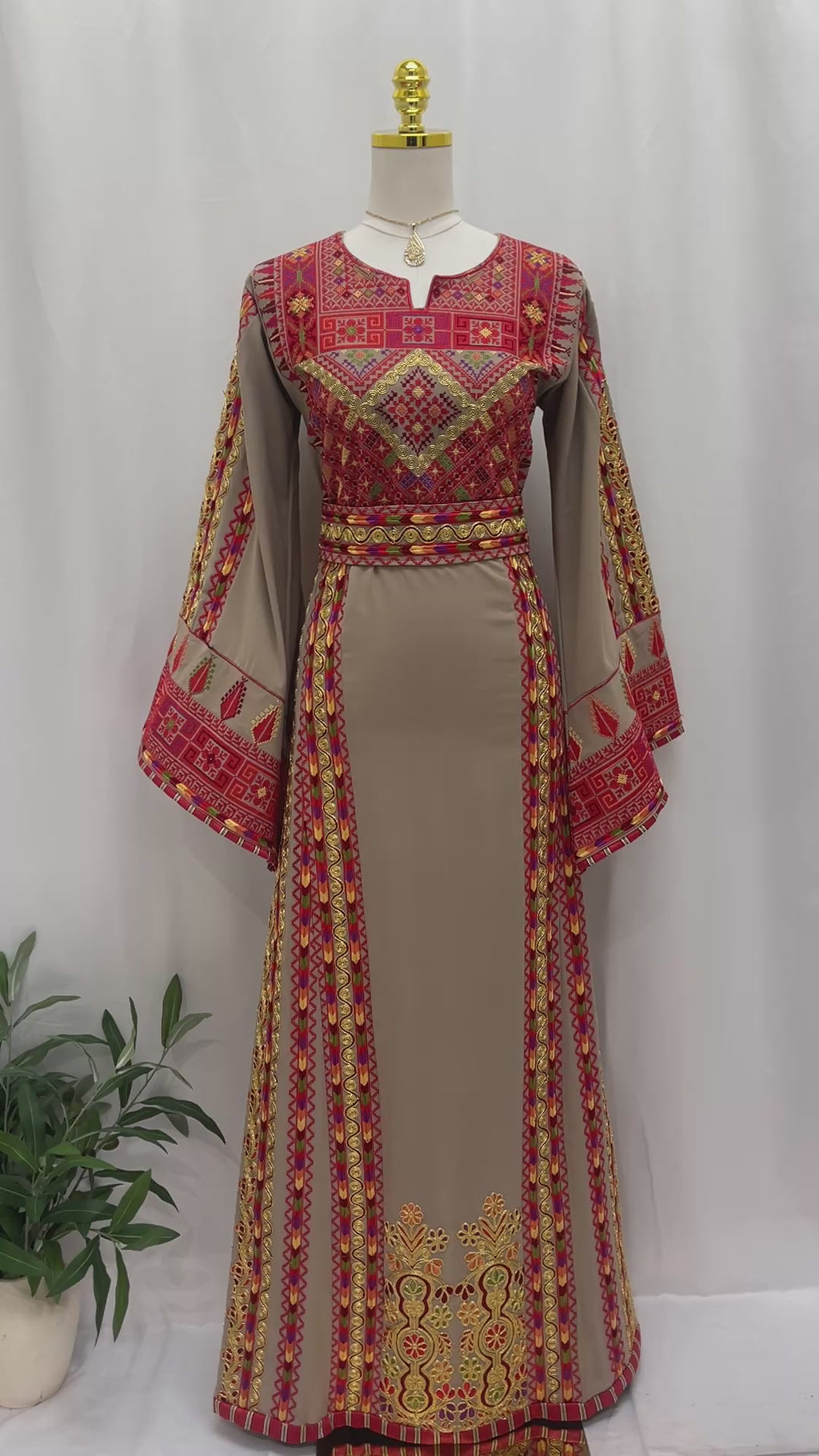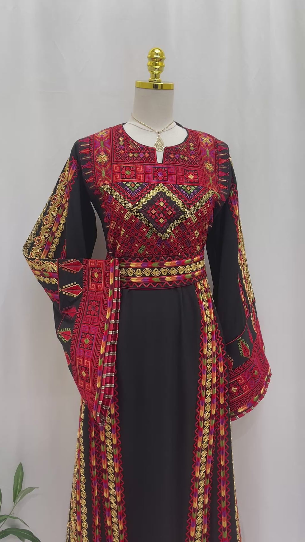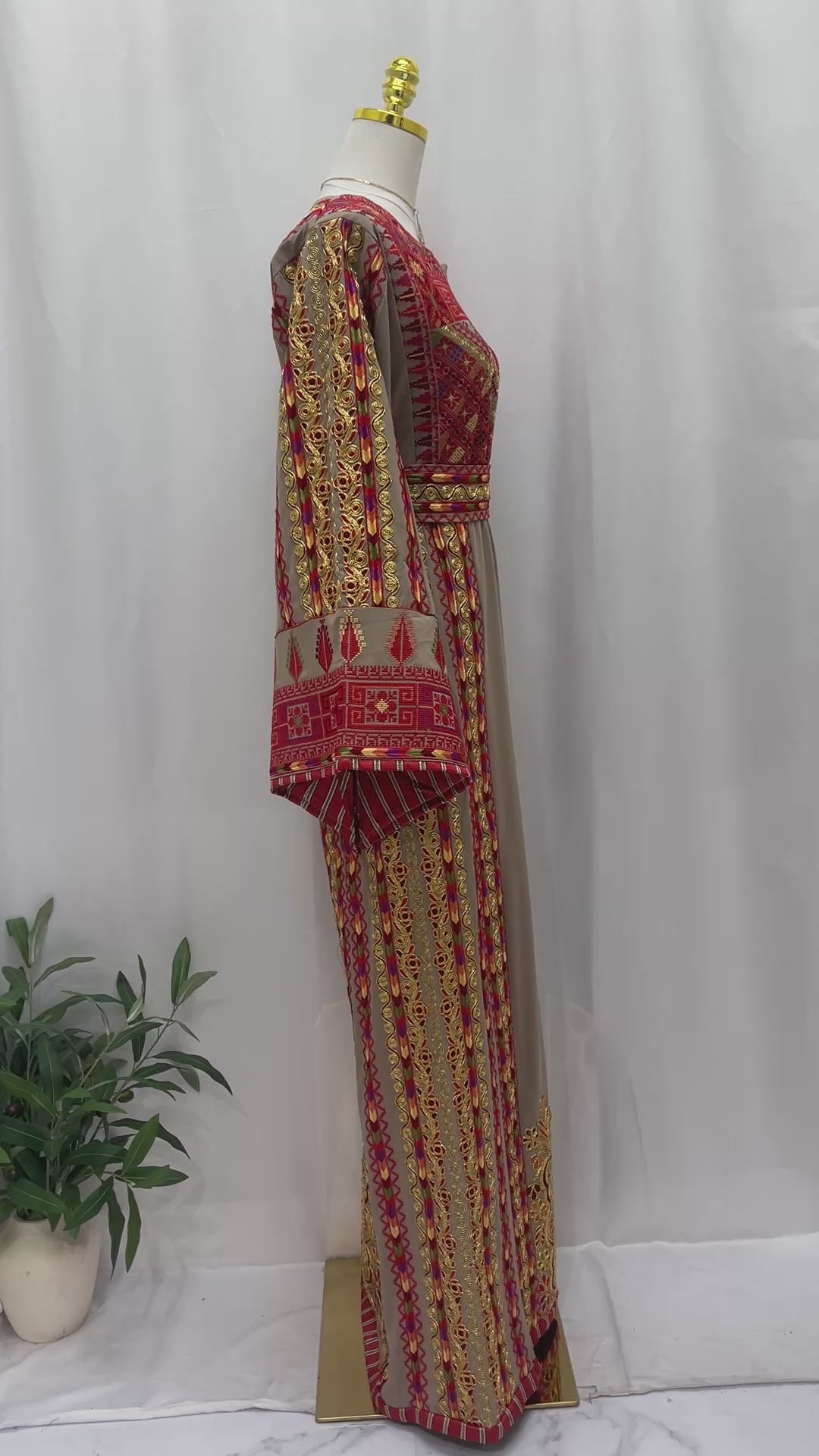 A luxurious Palestinian thobe richly embroidered in shades of red and gold, symbolizing heritage and pride.