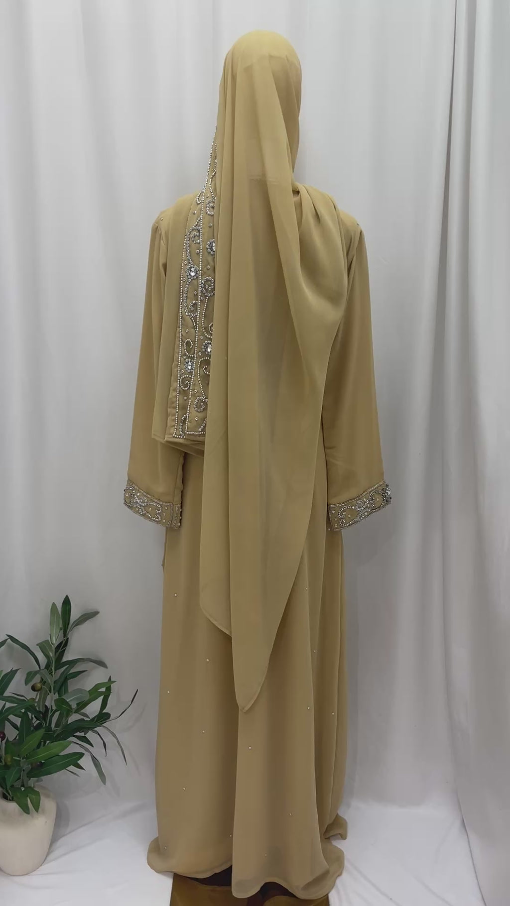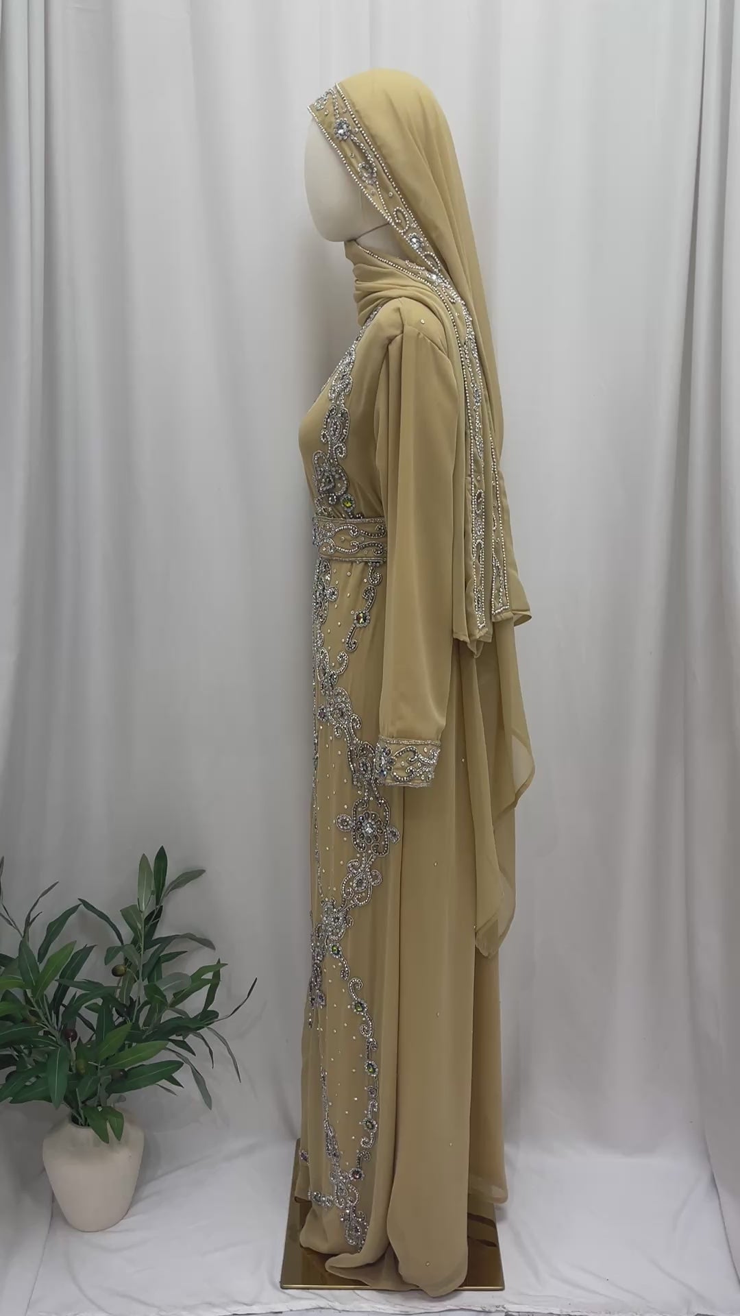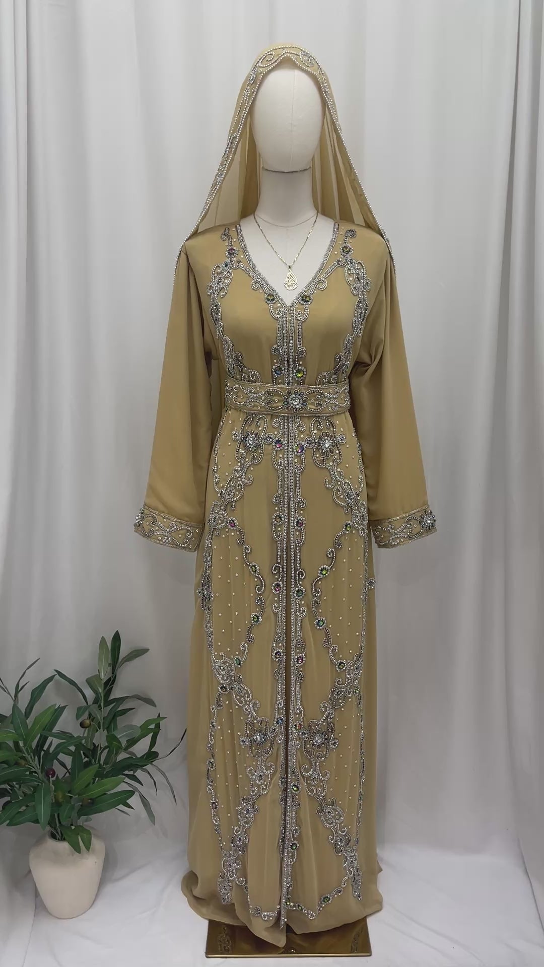 A luxurious amber-toned kaftan, delicately embellished with rich silver embroidery and multicolored crystal stones for a regal, eye-catching finish. Designed with a fully embroidered belt to define the waist, along with a matching veil that completes the look with elegance.