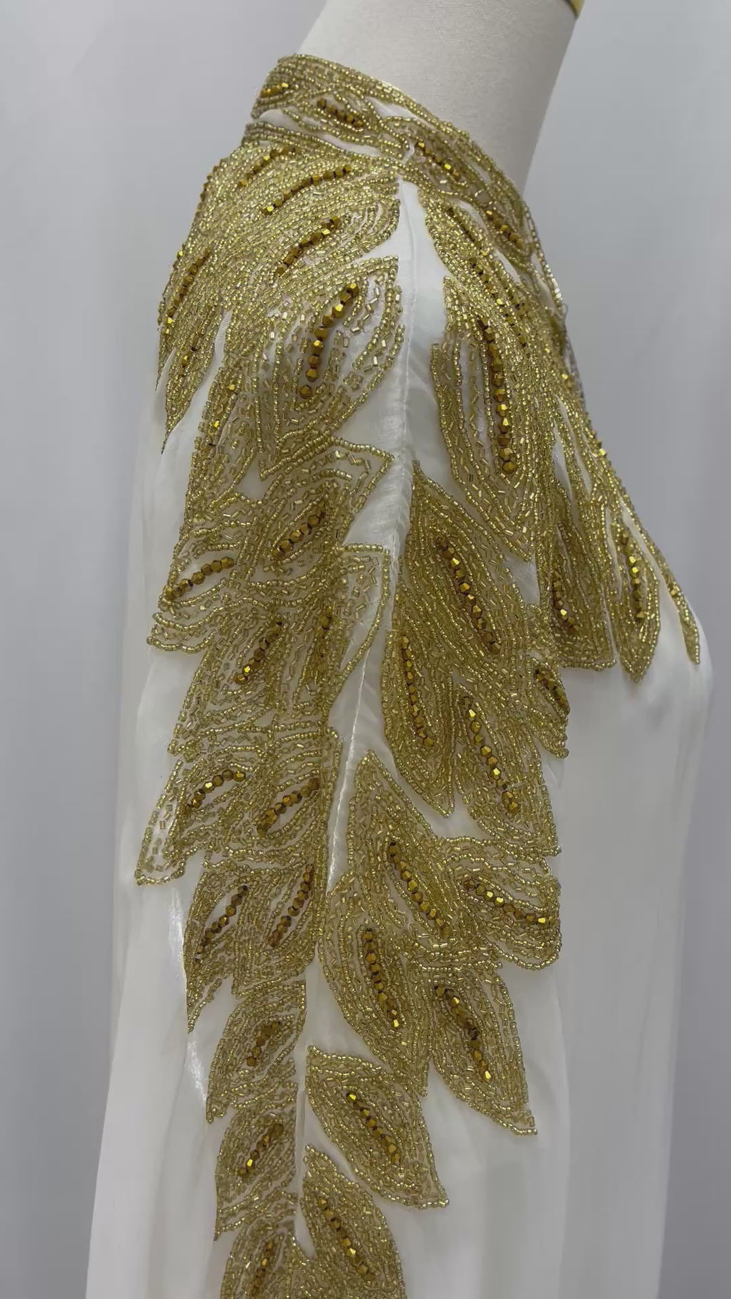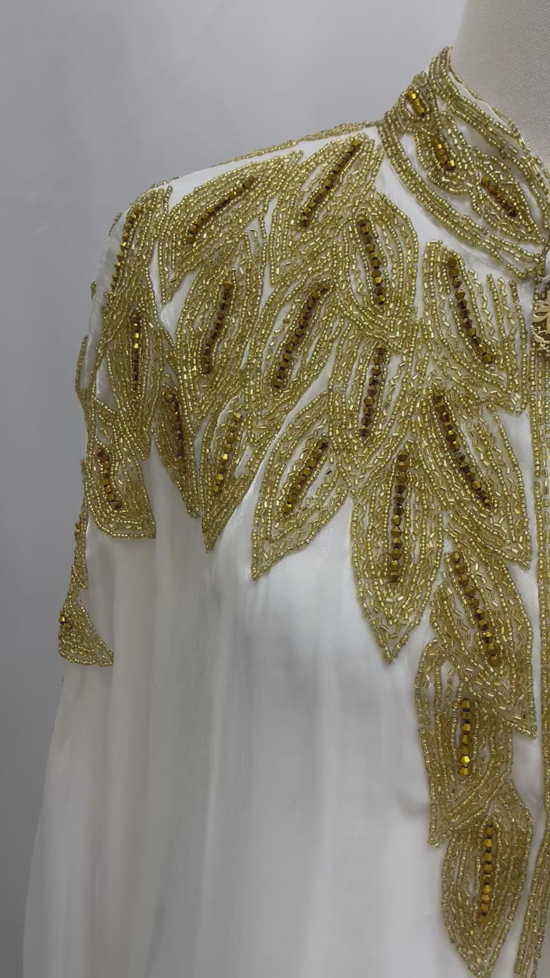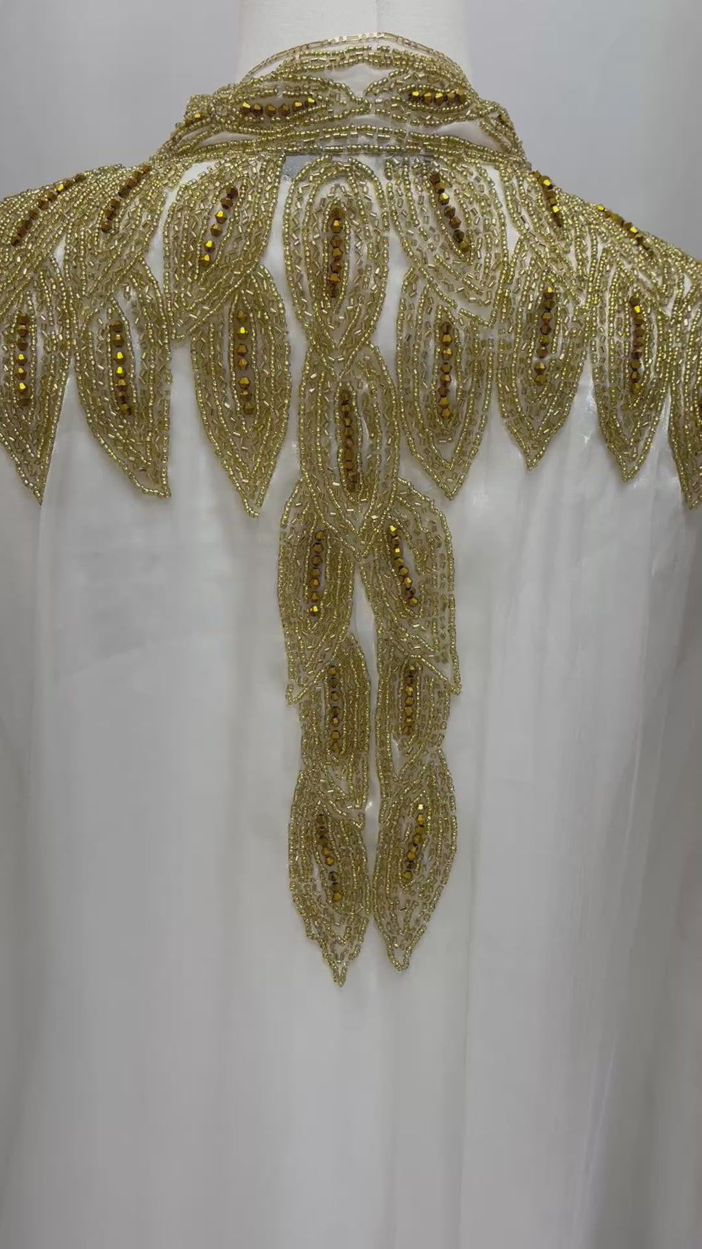 ارتقِ بإطلالتك مع عباءة سارة الفاخرة المزخرفة، إضافة رائعة لأي خزانة ملابس. صُممت هذه العباءة الأنيقة والمحتشمة بإتقان، وتتميز بتصميمها الأبيض العاجي الرائع. تزينها زخارف دقيقة تُبرز جاذبيتها الراقية.