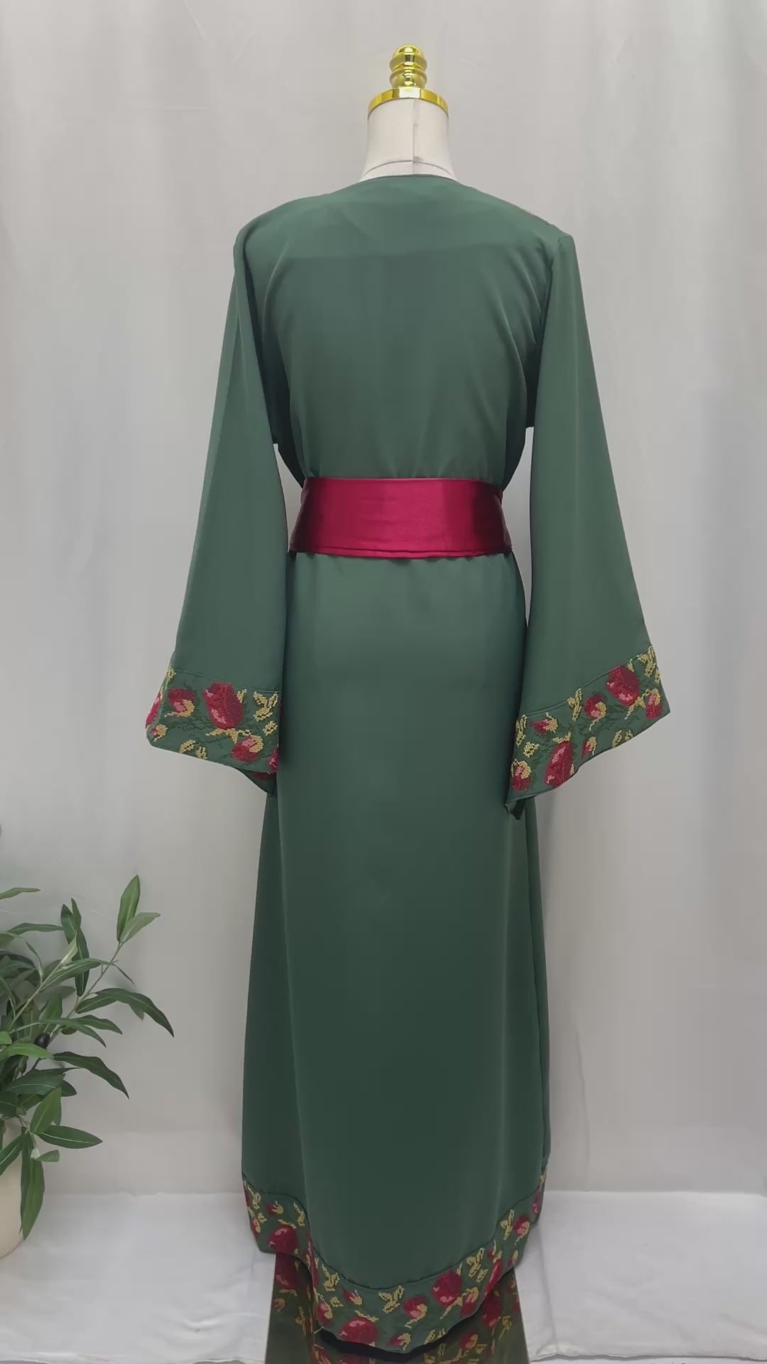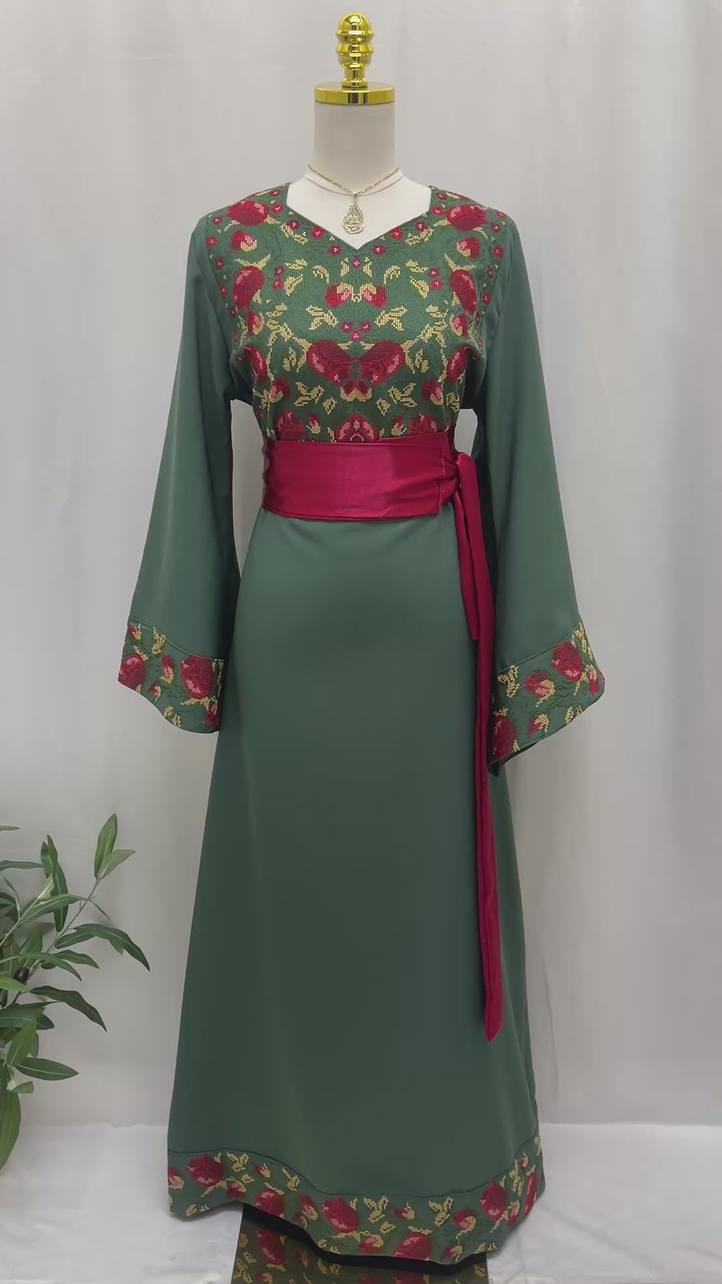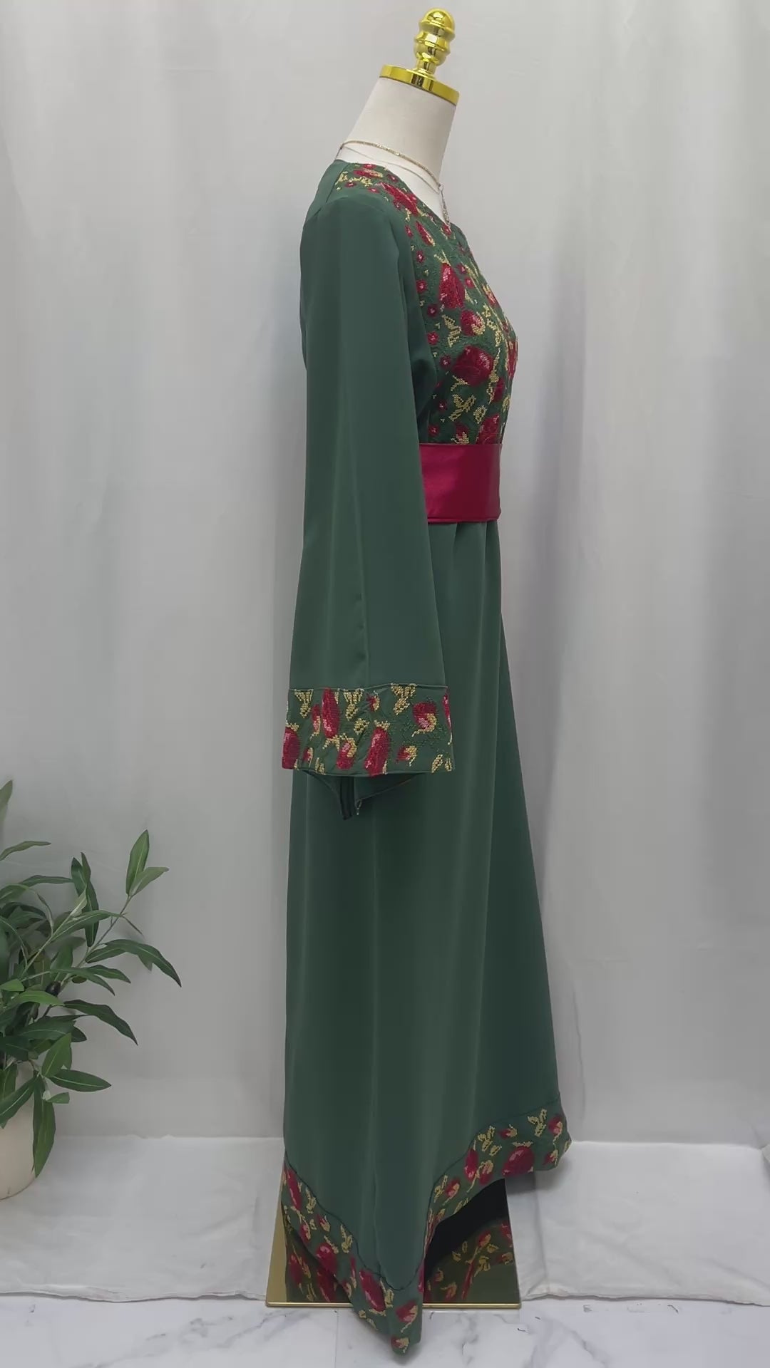 ثوب أنيق باللون الأخضر الزمردي ، مطرز بدقة بنقوش زهرية حمراء ولمسات ذهبية. مصمم بأسلوب بسيط وأنيق، مع حزام ساتان عريض بلون عنابي لإبراز جمال الخصر.