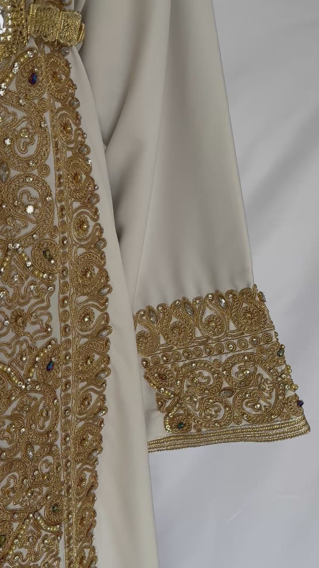 The silk crepe fabric in this kaftan is chosen for softness and quality. Its weight provides an impressive drape, enhancing the garment's flow. This kaftan embodies grace and tradition with beads and sequins meticulously applied by hand, adding to the shimmering effect.