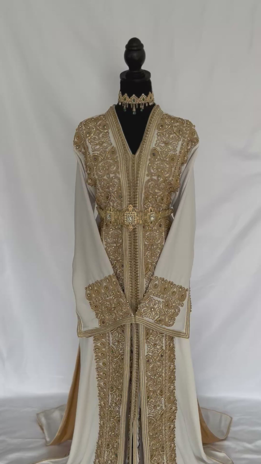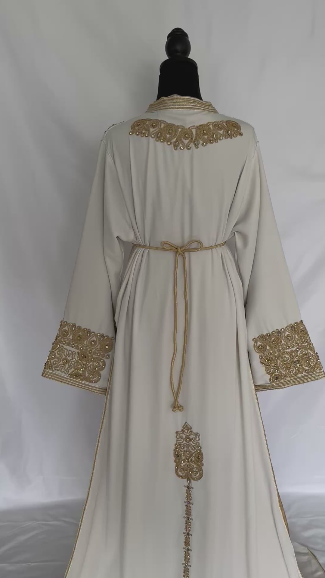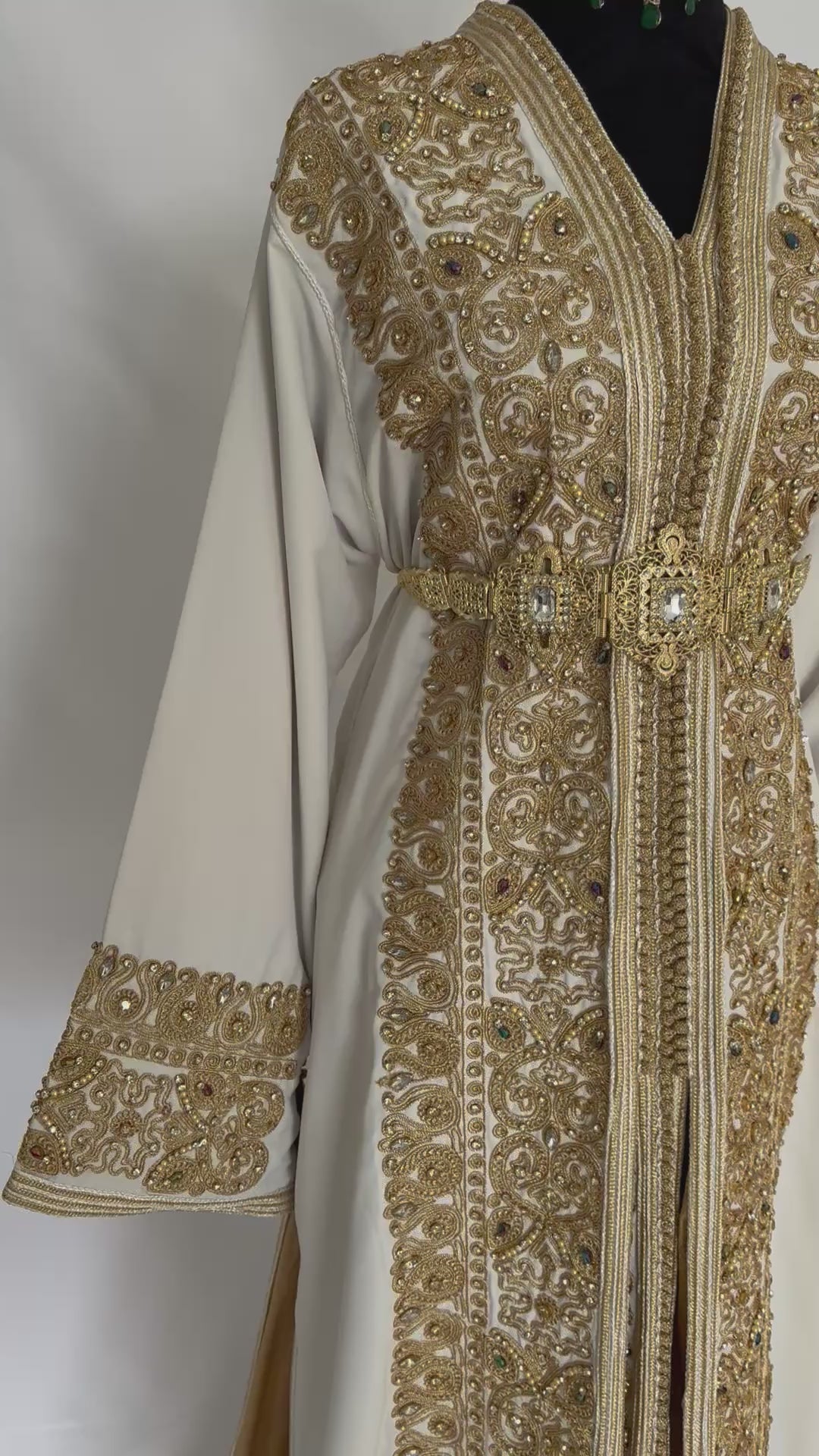 Handmade Silk Crepe Moroccan Kaftan: Gold Thread Embroidery, Belted Takchita