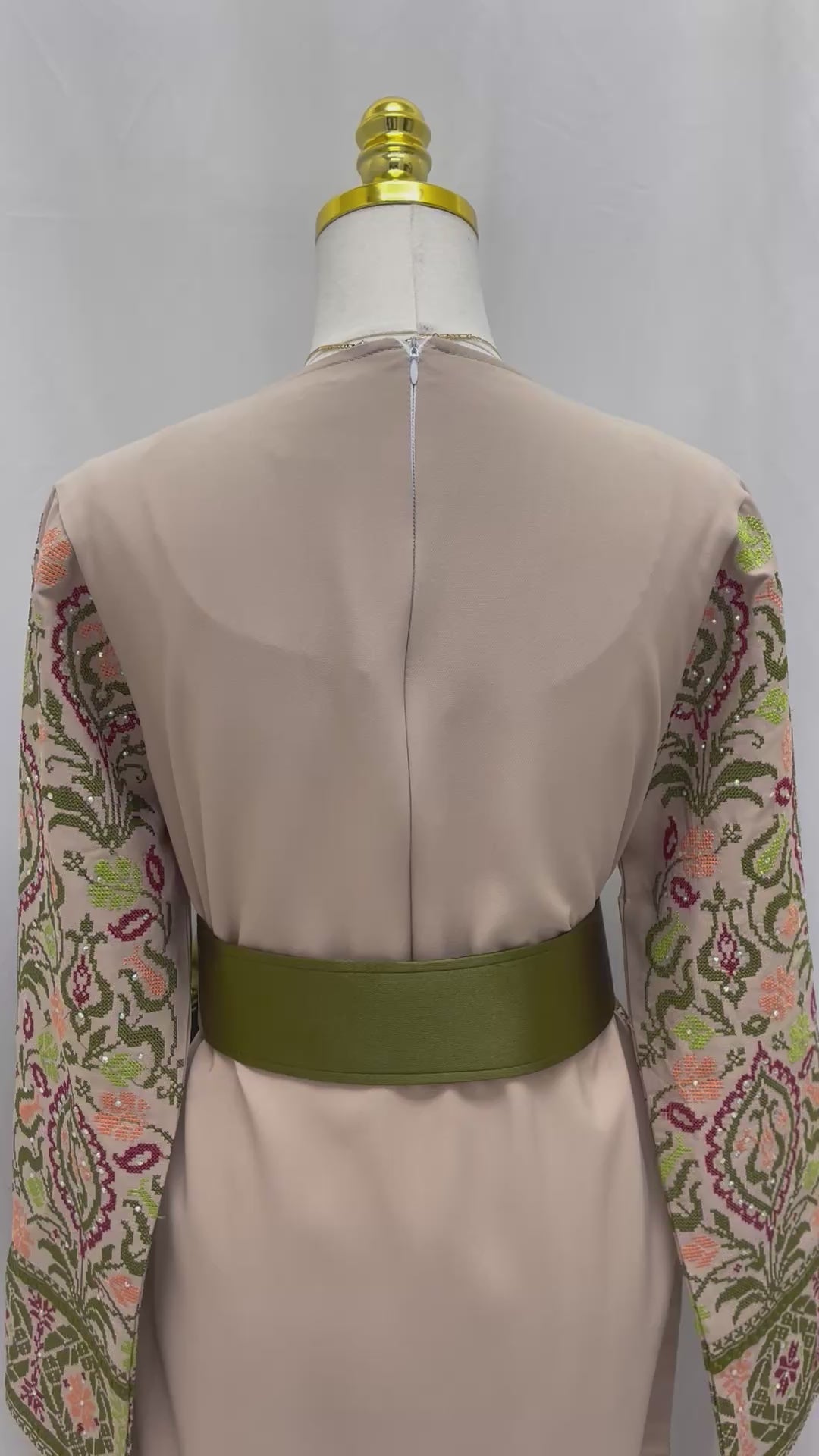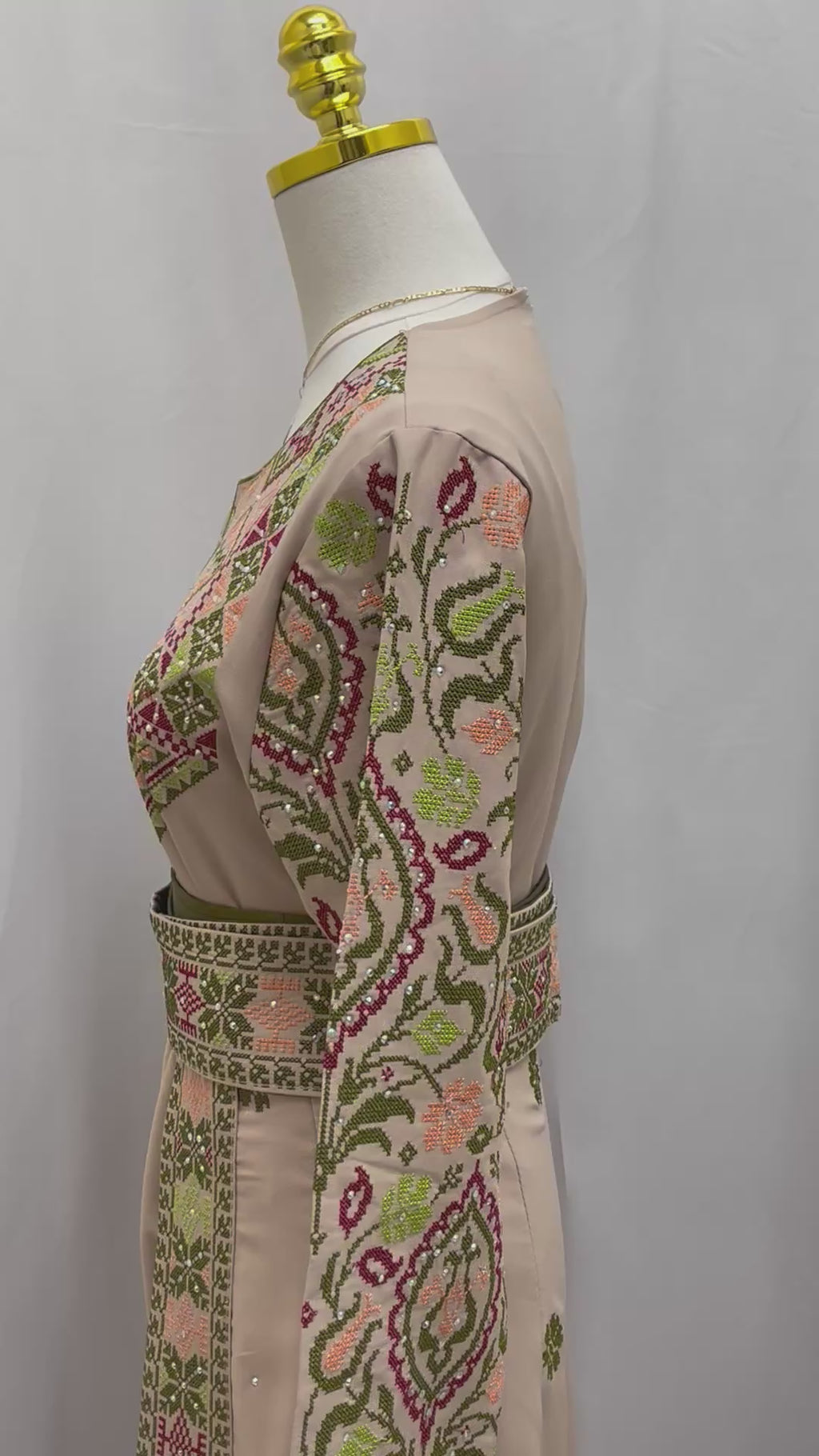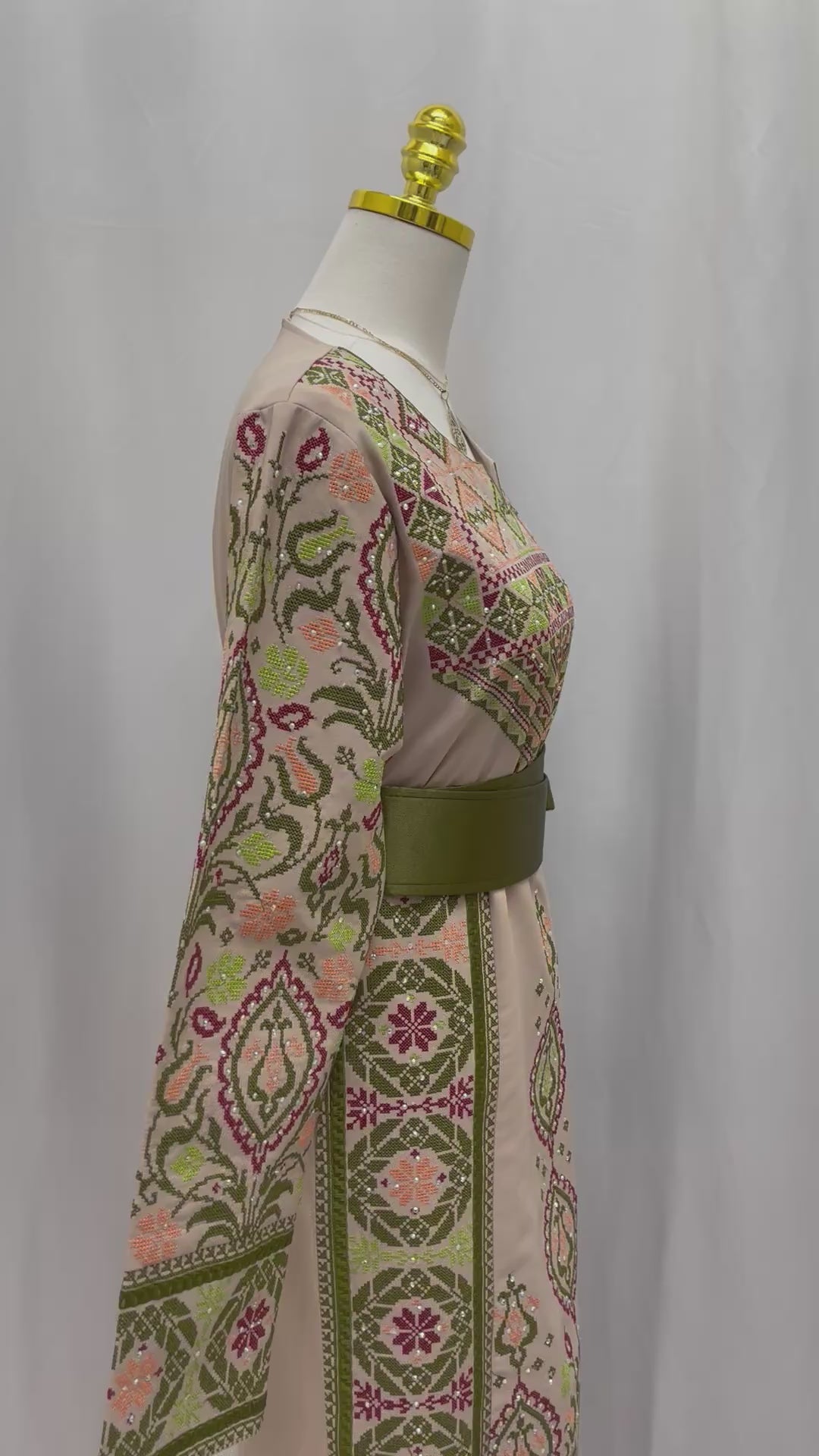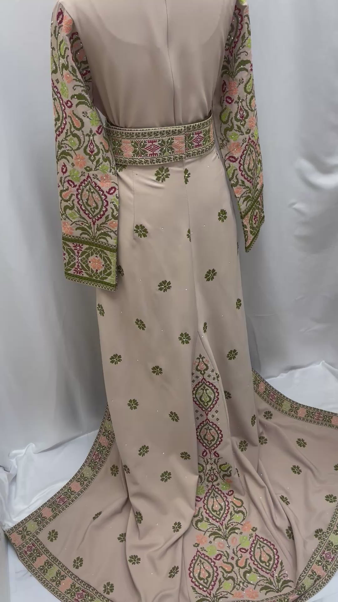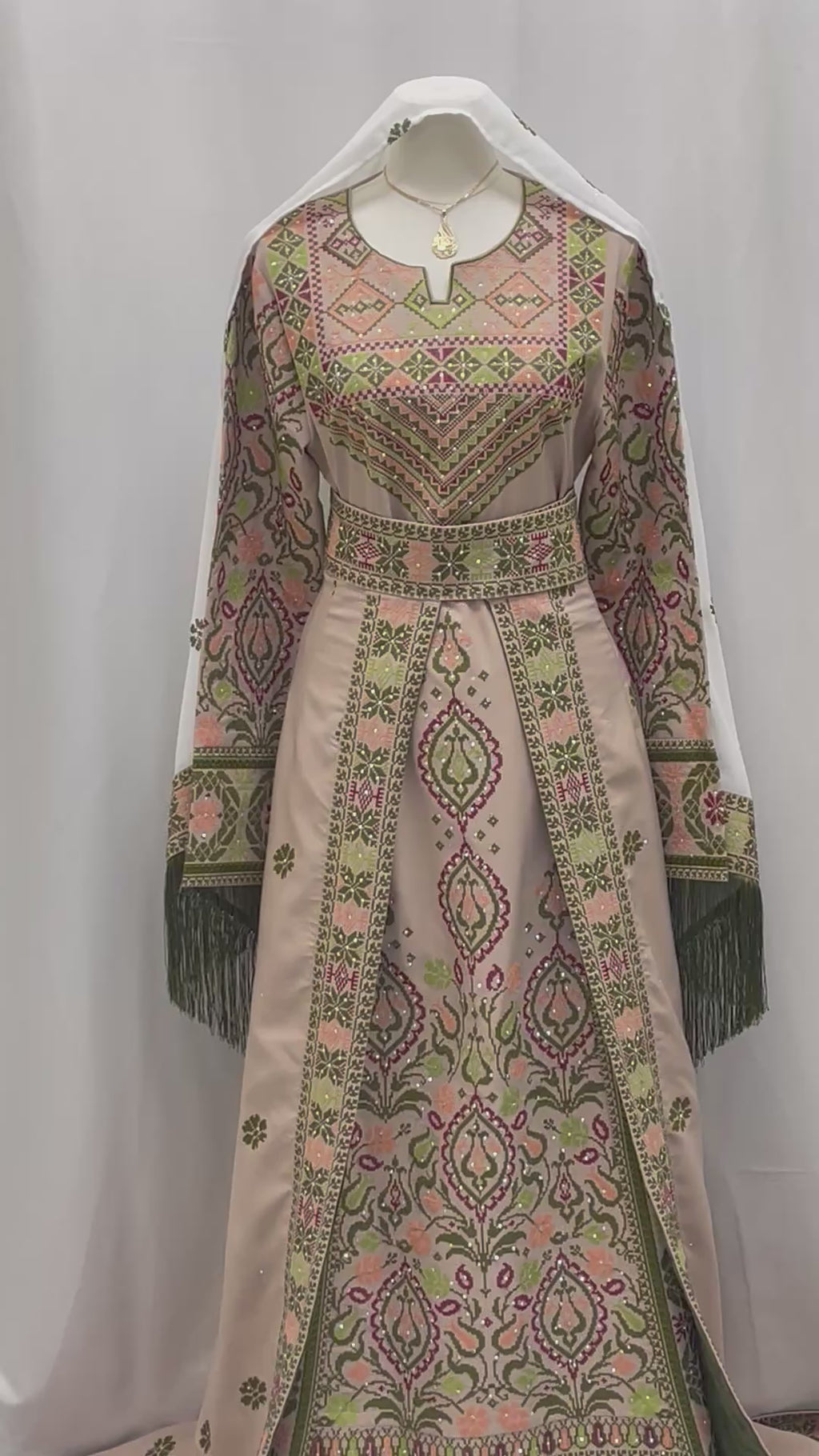 ثوب زفاف فاخر مطرز بتطريز أخضر ياقوتيّ - ثوب زفاف فاخر مطرز بكثافة بدرجات الأخضر والوردي والخوخي. يمكن ارتداء هذه القطعة متعددة الاستخدامات بأسلوبين: إما كقطعة مستقلة أنيقة، أو مع الشات المطرز القابل للفصل (غطاء التنورة) لإطلالة عروس ملكية. يُكمله حزام من الساتان وشال مطرز، ليُجسد أناقة تراثية وفخامة خالدة.