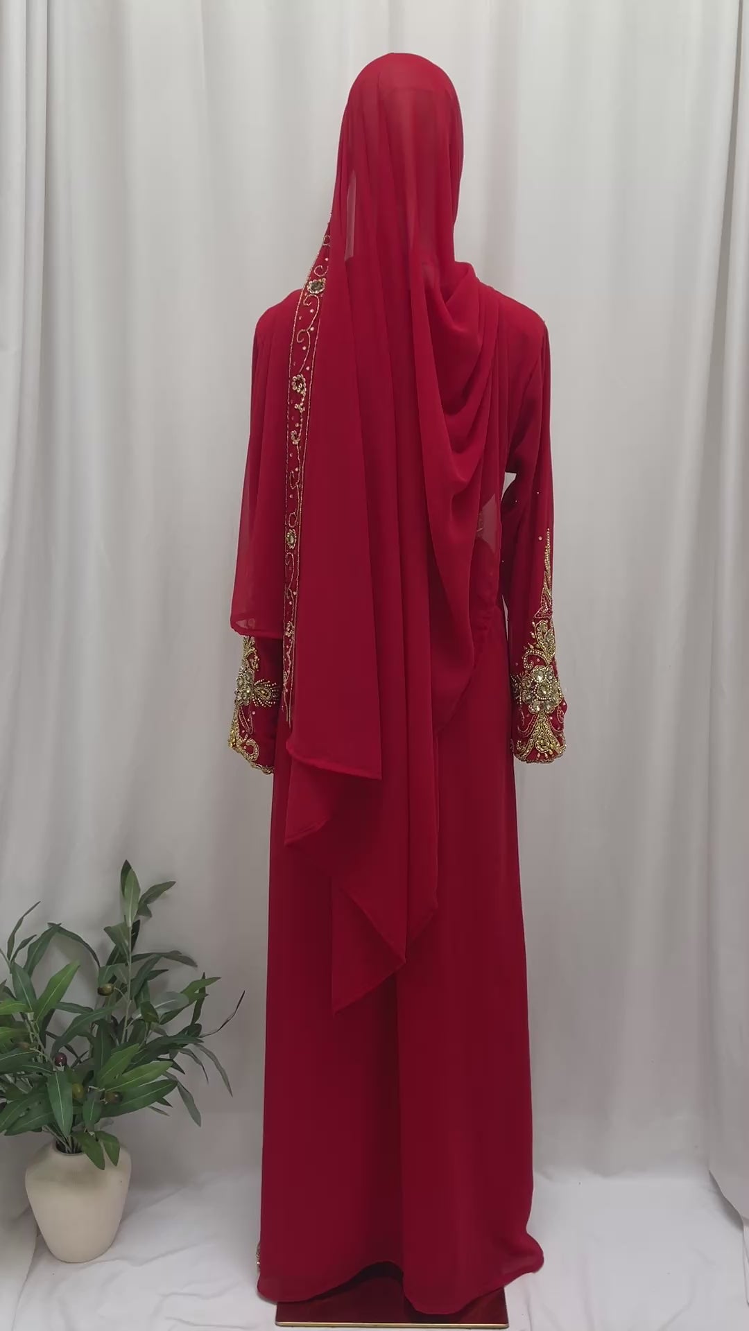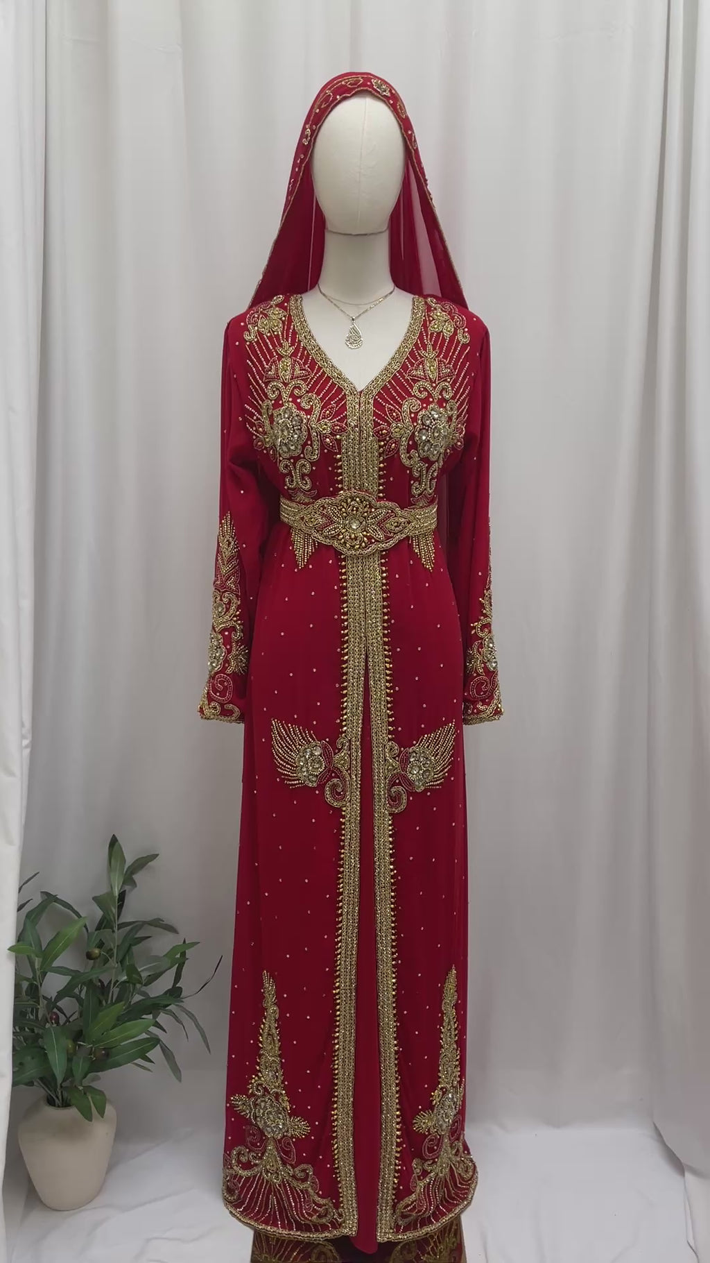 A luxurious red kaftan adorned with exquisite gold embroidery, inspired by rich oriental artistry. The design features detailed embellishments across the bodice, sleeves, and hem, creating a regal and captivating look.