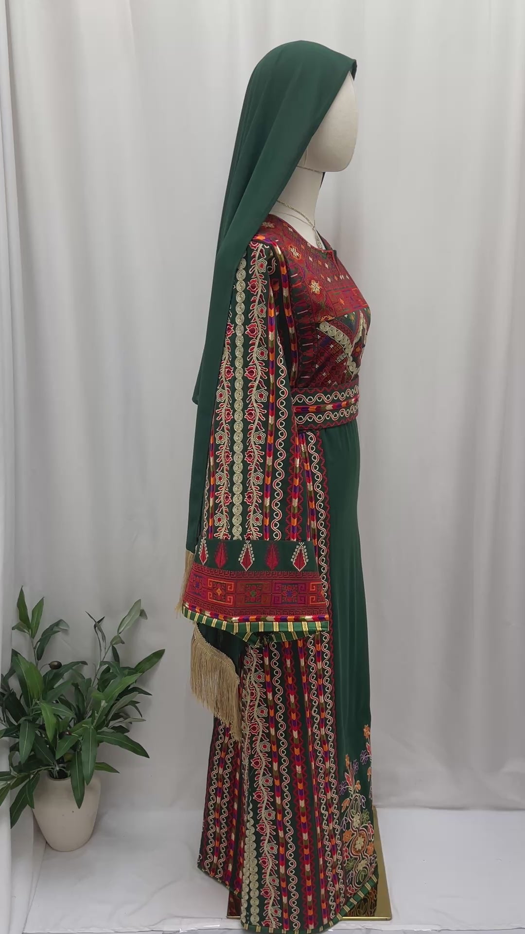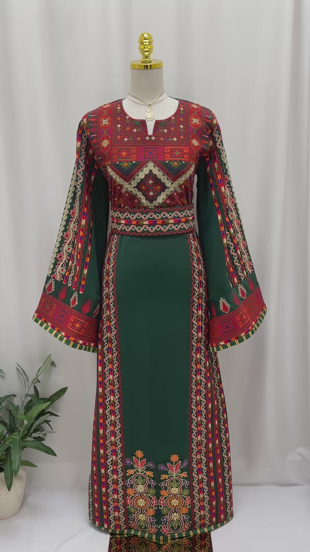 ثوب فلسطيني مطرز بتصميم تراثي فاخر باللون الأخضر الغامق مع تطريزات غنية بالألوان الدافئة على الصدر، الأكمام، والجوانب. يتميّز بقصّة مستقيمة وأكمام واسعة مزخرفة تضيف لمسة أنثوية راقية.
