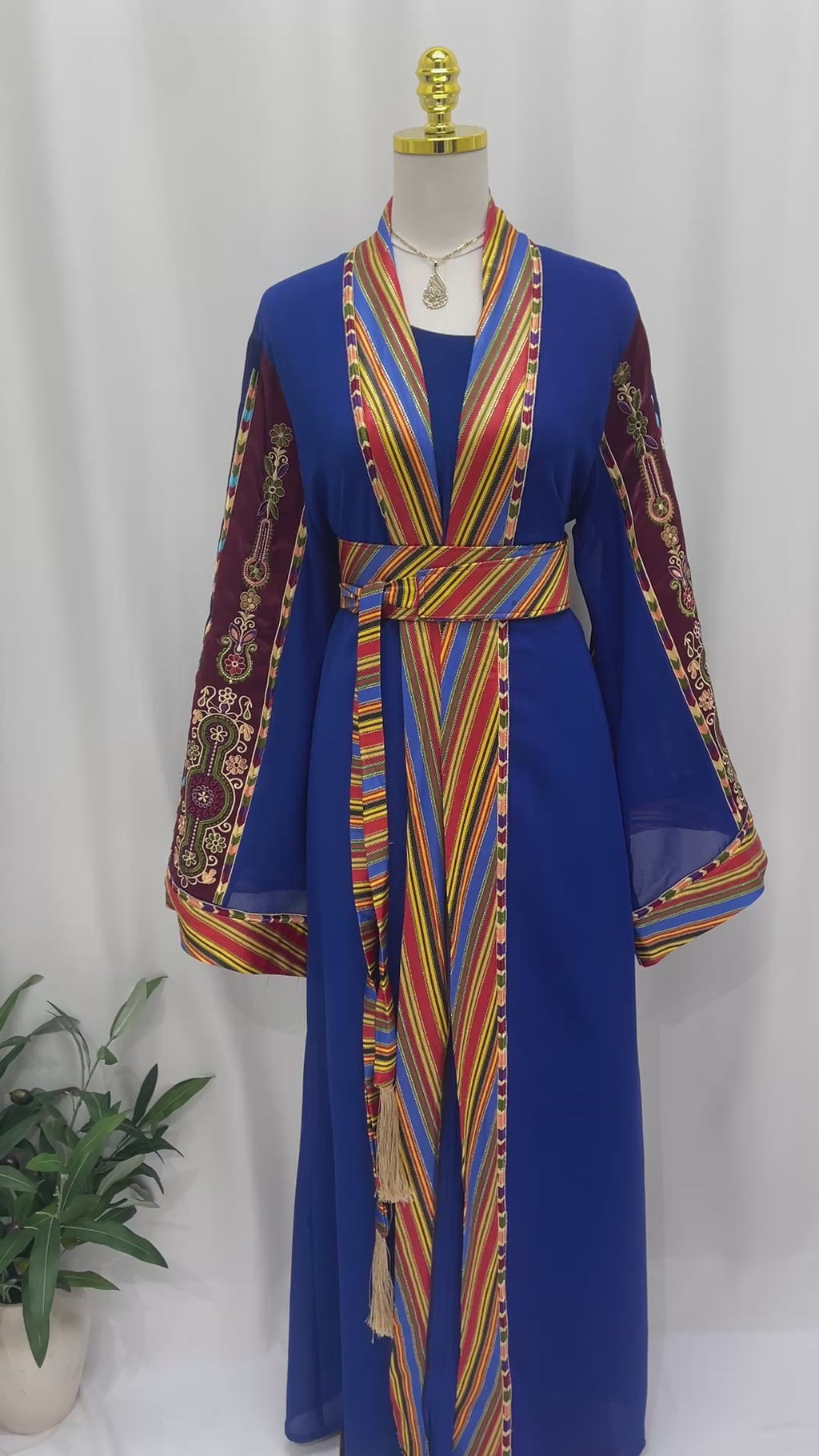 Royal Malak Open Abaya – A luxurious open-front chiffon abaya in royal blue, featuring heritage-inspired embroidered sleeves and a colorful woven Saaya belt that accentuates the waist beautifully. Comes with a matching Lycra inner dress for comfort and elegance—a perfect fusion of tradition and modern sophistication, ideal for elegant occasions.