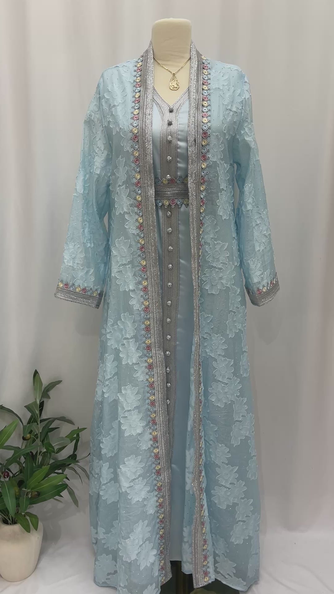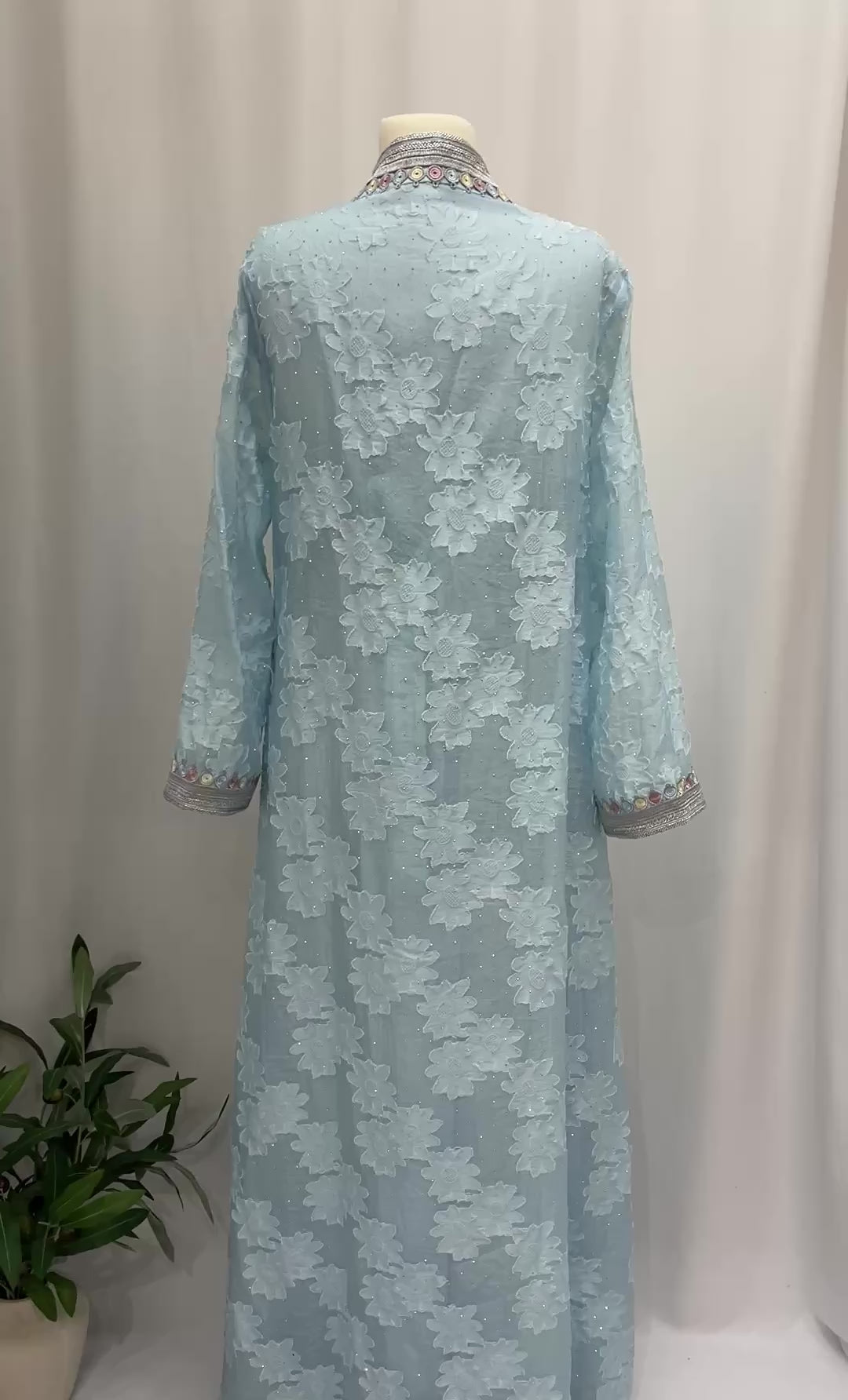 A soft sky-blue abaya made from sheer floral lace fabric. Designed with elegant silver trim and delicate detailing for a graceful, feminine look. Perfect for special occasions and elegant gatherings.