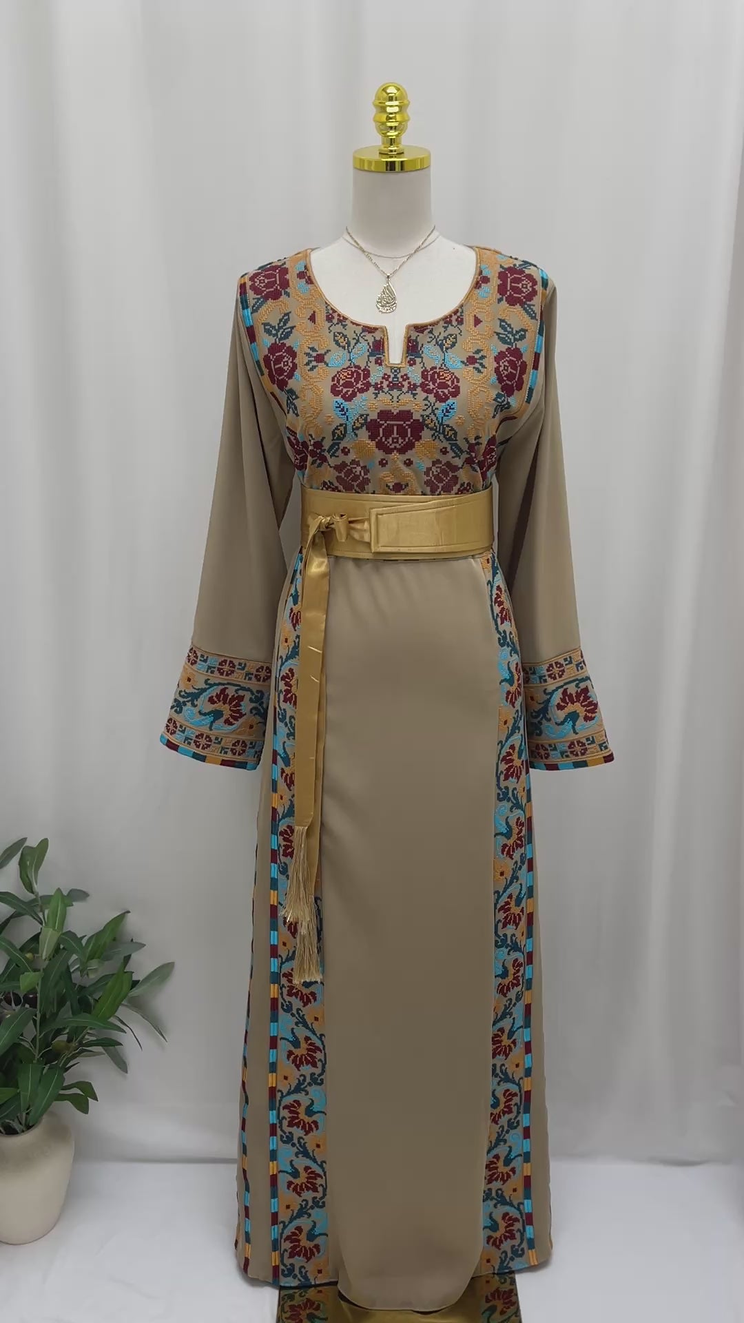 ثوب تراثي أنيق يجمع بين البساطة والفخامة. يتميز بقماش بيج ناعم مع تطريزات مستوحاة من النقوش الفلسطينية بألوان العقيق، الأزرق السماوي، والذهبي. الأكمام والجانبين مزخرفين بتطريز متناسق يبرز جمال التصميم.