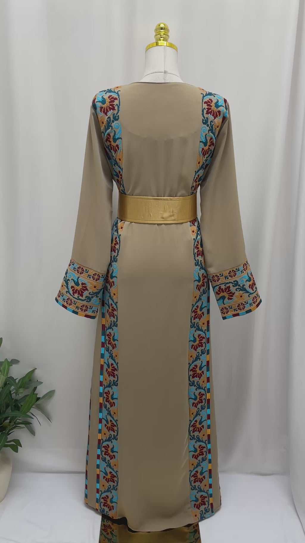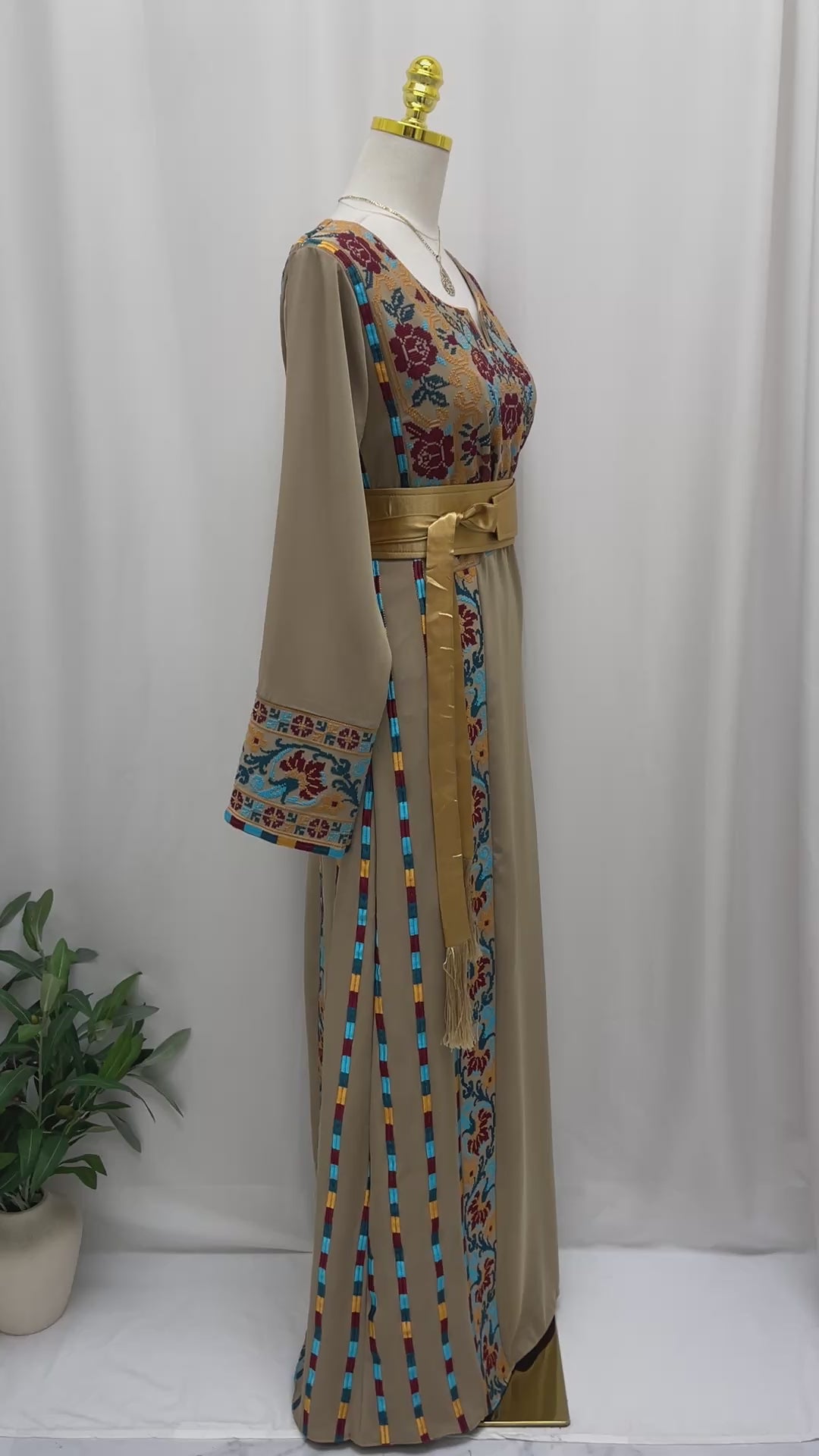 An elegant heritage-inspired thobe featuring soft beige fabric adorned with traditional Palestinian-style embroidery in shades of garnet red, turquoise blue, and golden tones. The embroidered sleeves and side panels create a graceful silhouette.