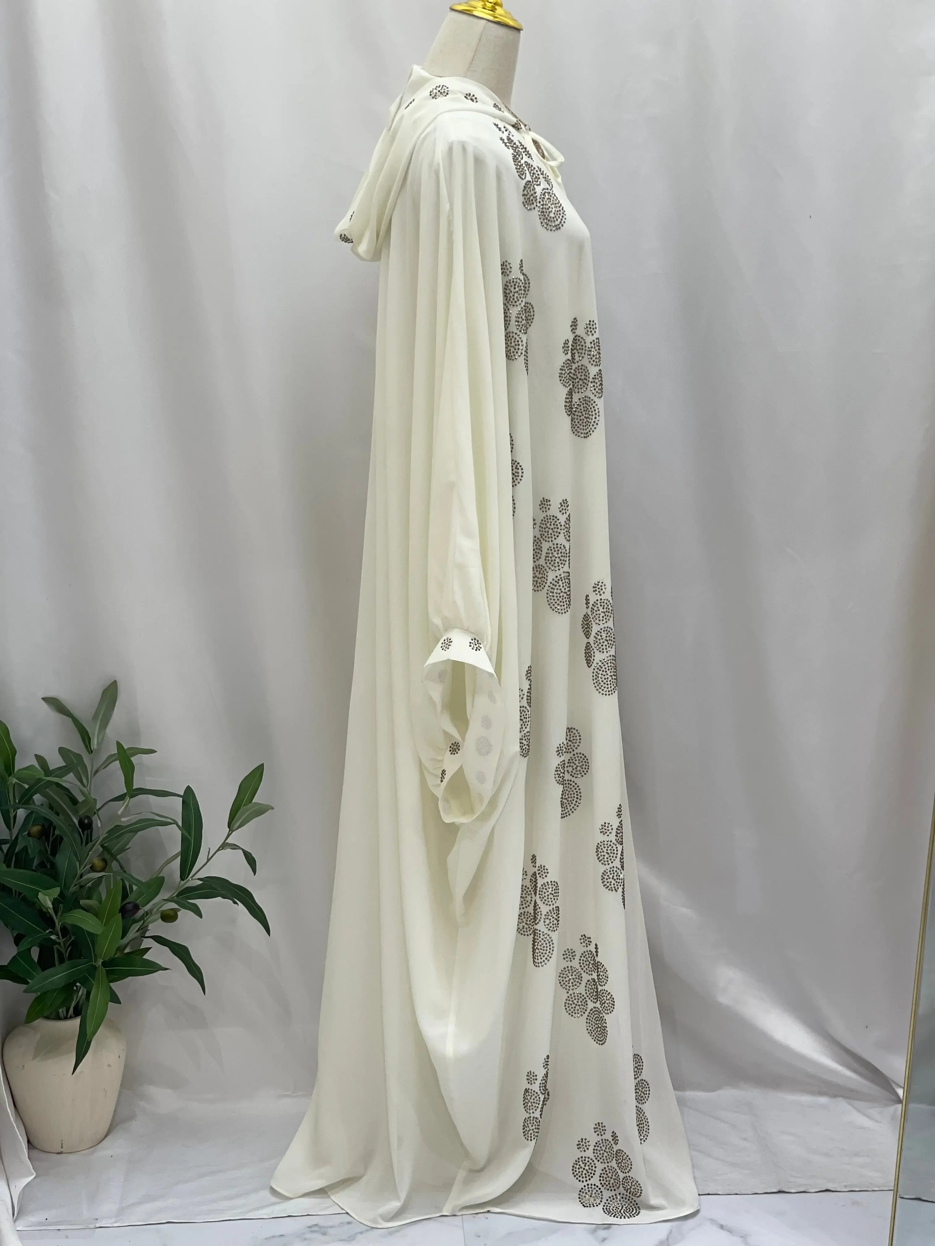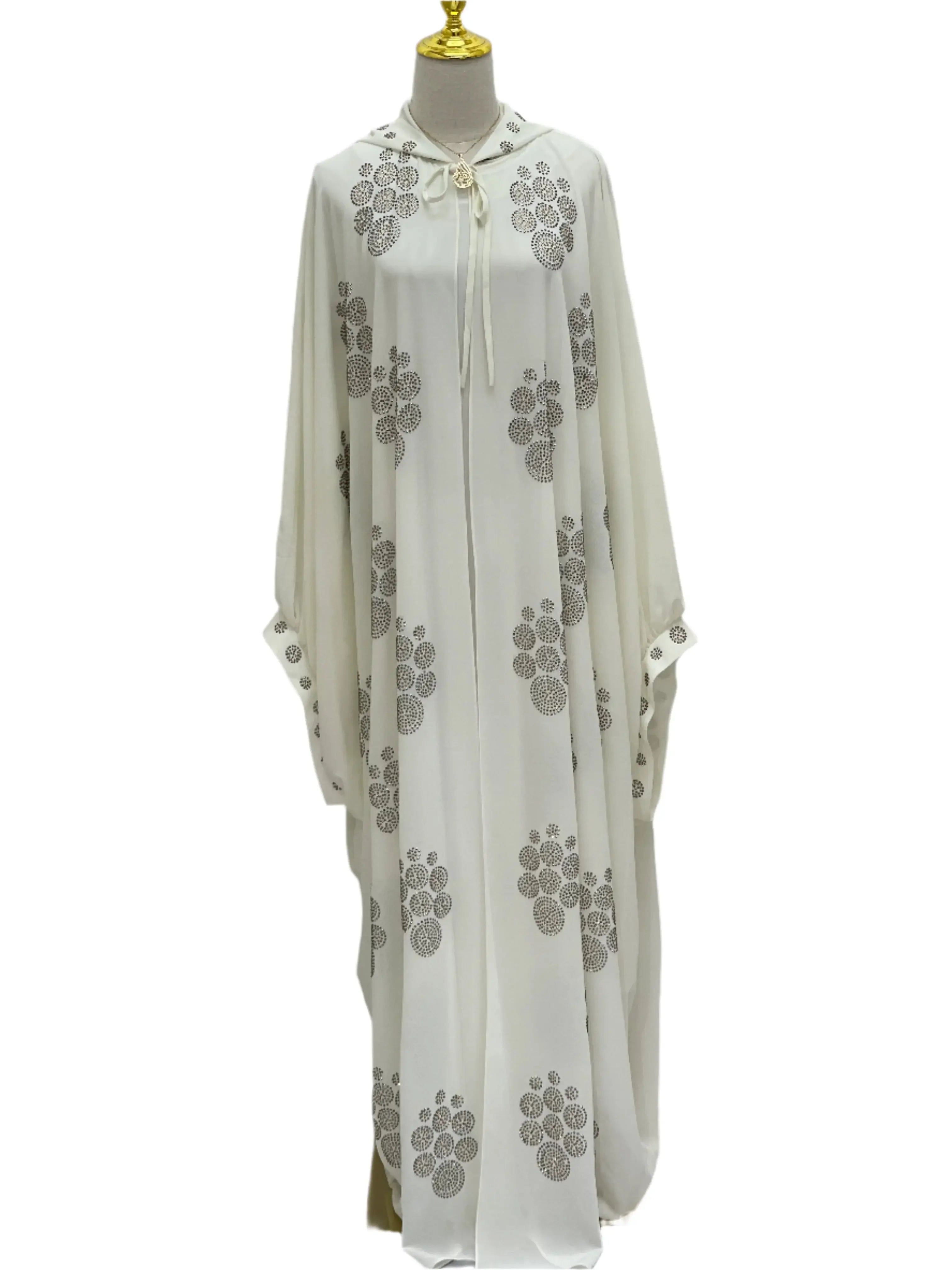 Classic white abaya from Palestinian Elegance with full-length design and front zipper closure Palestinian Elegance classic white abaya with long sleeves and modest high neckline on mannequin
