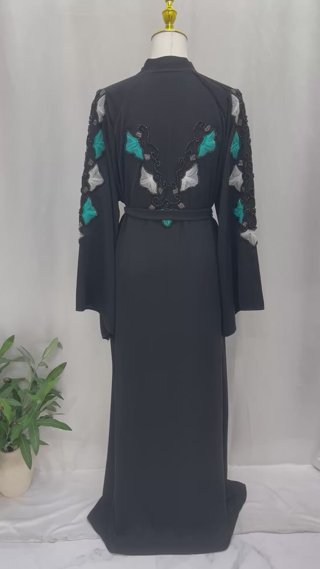 Palestinian Elegance elegant black abaya with turquoise and white embroidered sleeves and a belted waist