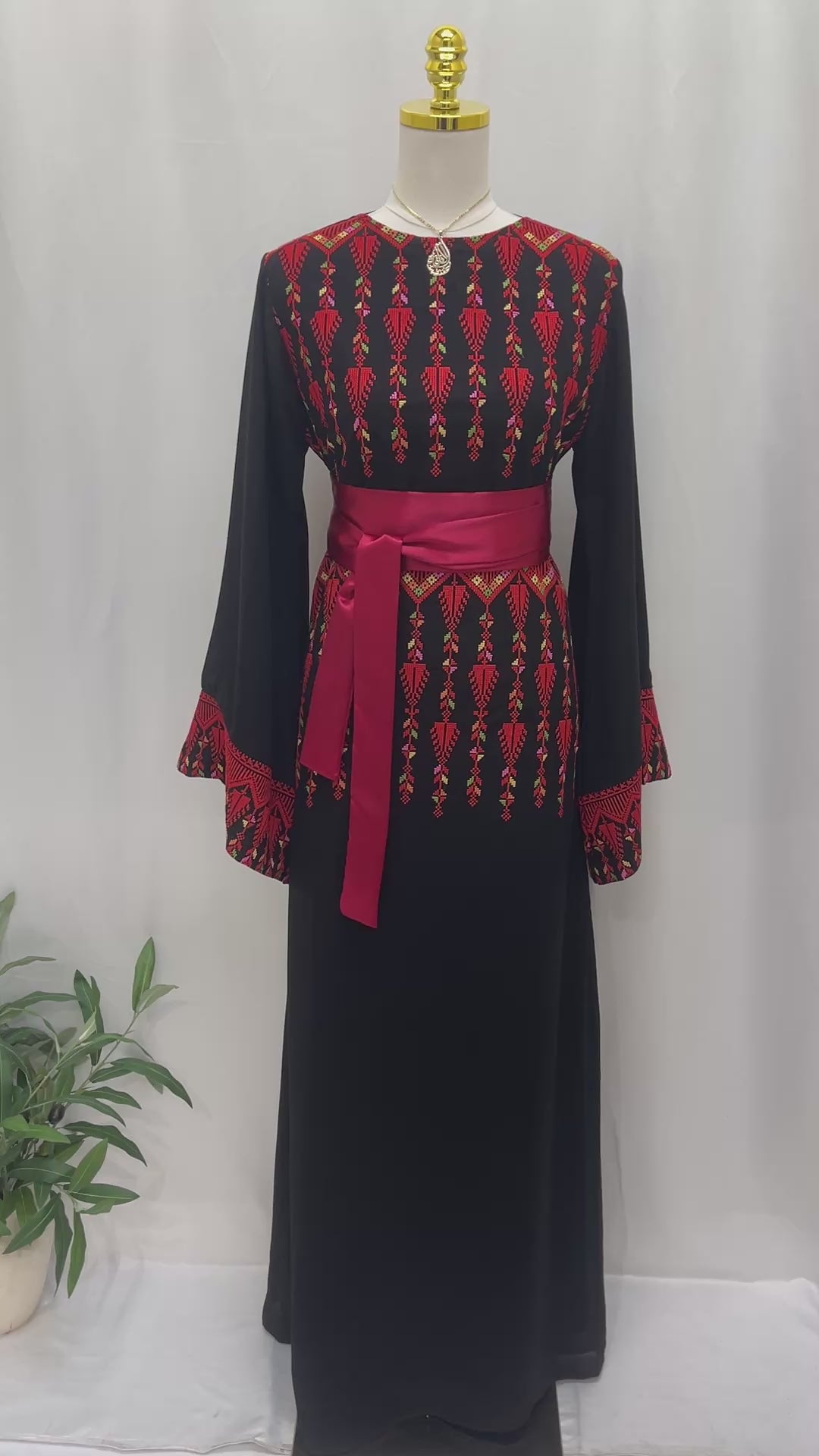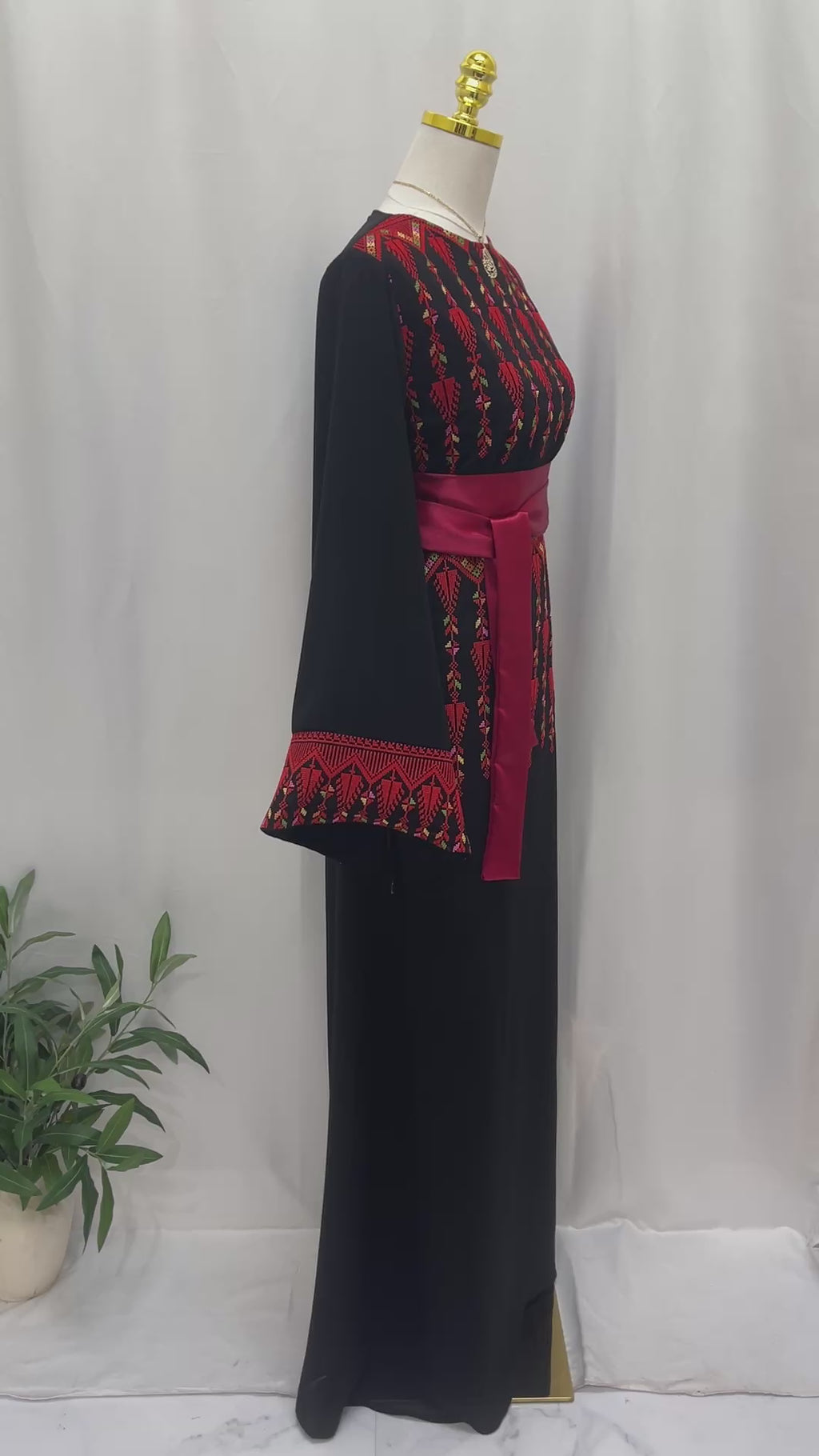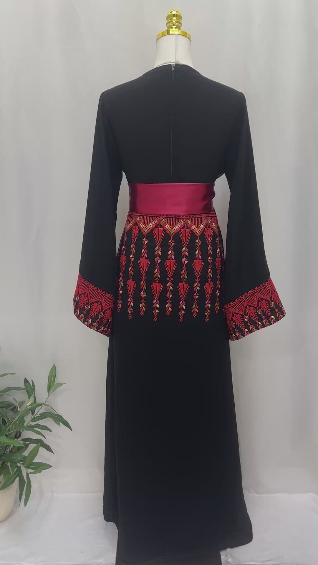 A beautifully crafted Palestinian embroidered thobe made from elegant black fabric, featuring intricate red embroidery inspired by traditional heritage motifs. The wide embroidered sleeves add a graceful, feminine touch, while the wide satin belt in deep red accentuates the waist for a refined, regal silhouette. Perfect for special occasions and cultural celebrations, this thobe blends timeless tradition with modern elegance.