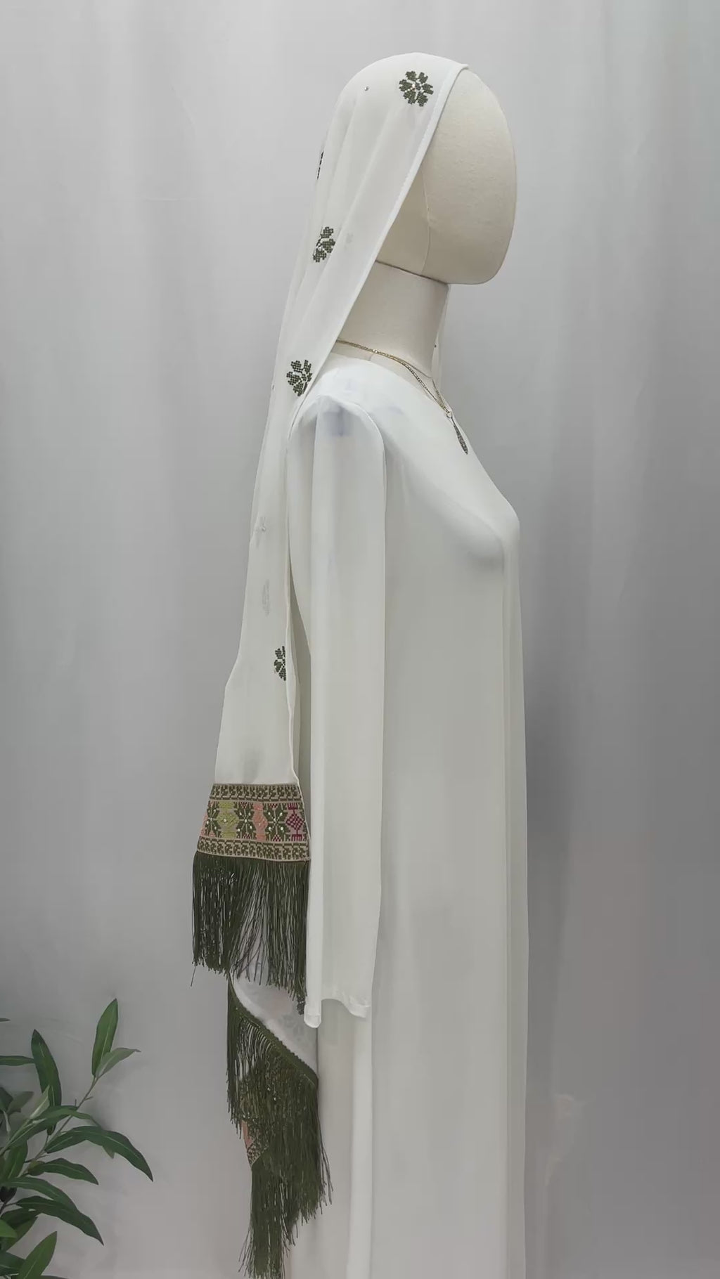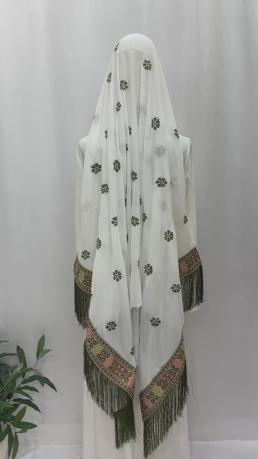 شال شيفون أبيض مطرّز بنقشات خضراء متناثرة، مزين بأطراف مطرزة تراثية بألوان الزيتوني والزهري مع شراشيب خضراء أنيقة.