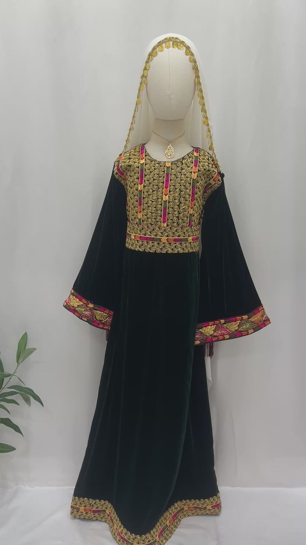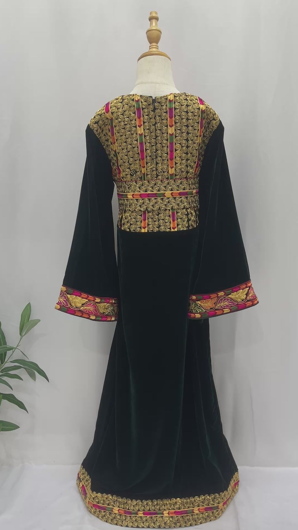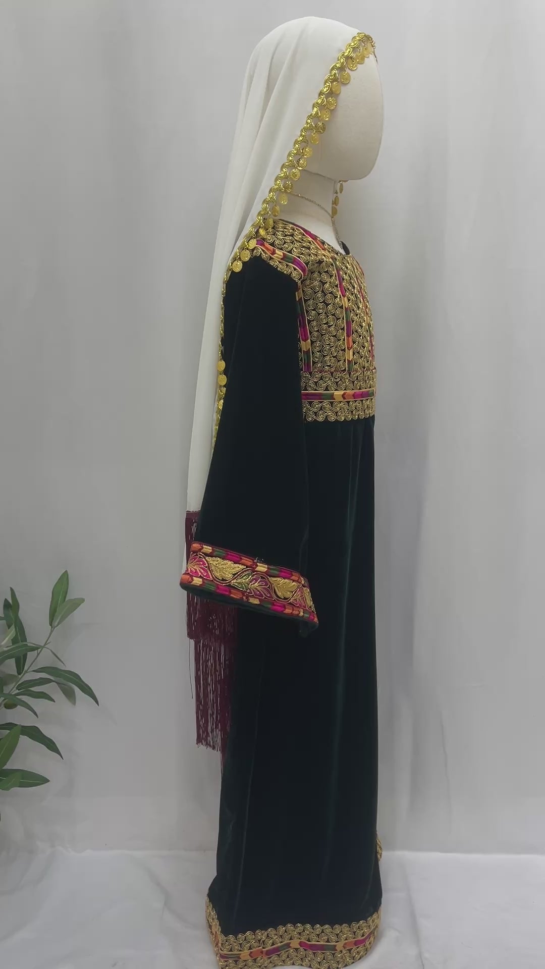 ثوب بناتي فاخر مصنوع من قماش المخمل الناعم بلون زمردي غني، مزين بتطريز قصب ذهبي مع لمسات لونية زاهية تضفي عليه لمسة تراثية فخمة. يتميز بأكمام واسعة مطرزة، ويأتي مع شال تراثي أنيق وحزام مطرز لإطلالة كاملة تجمع بين الأصالة والرقي. مثالي للمناسبات المميزة والأعياد