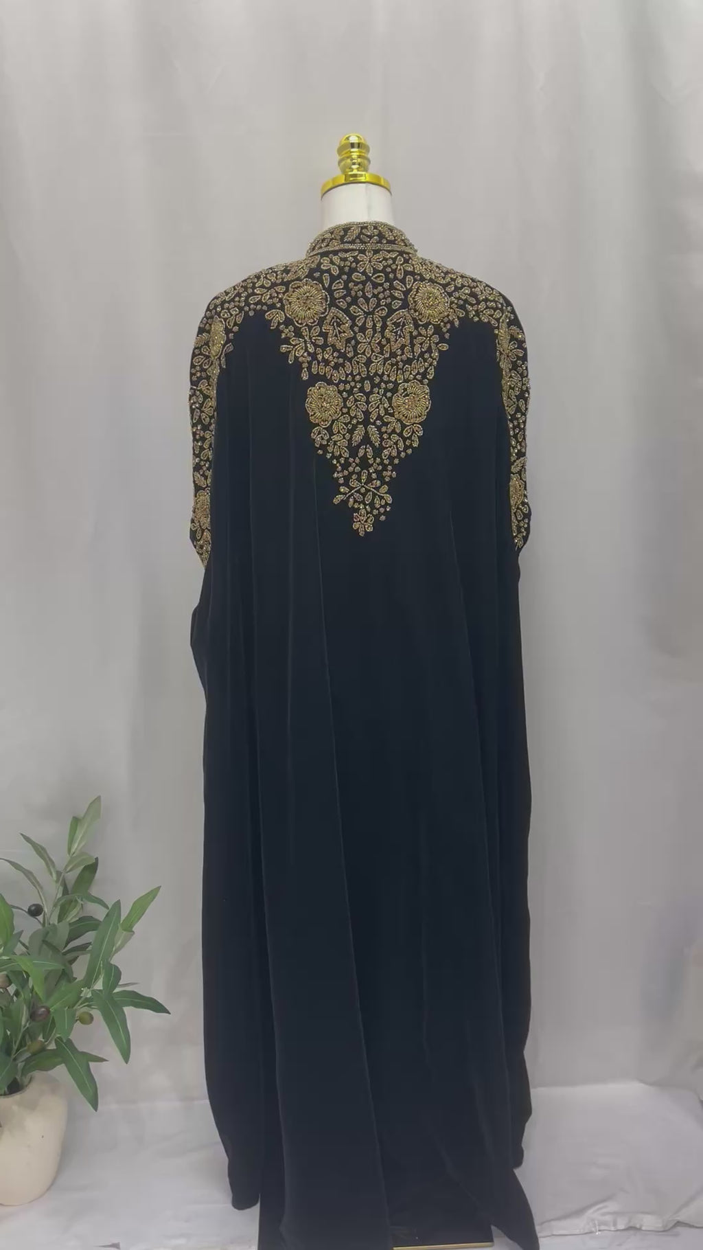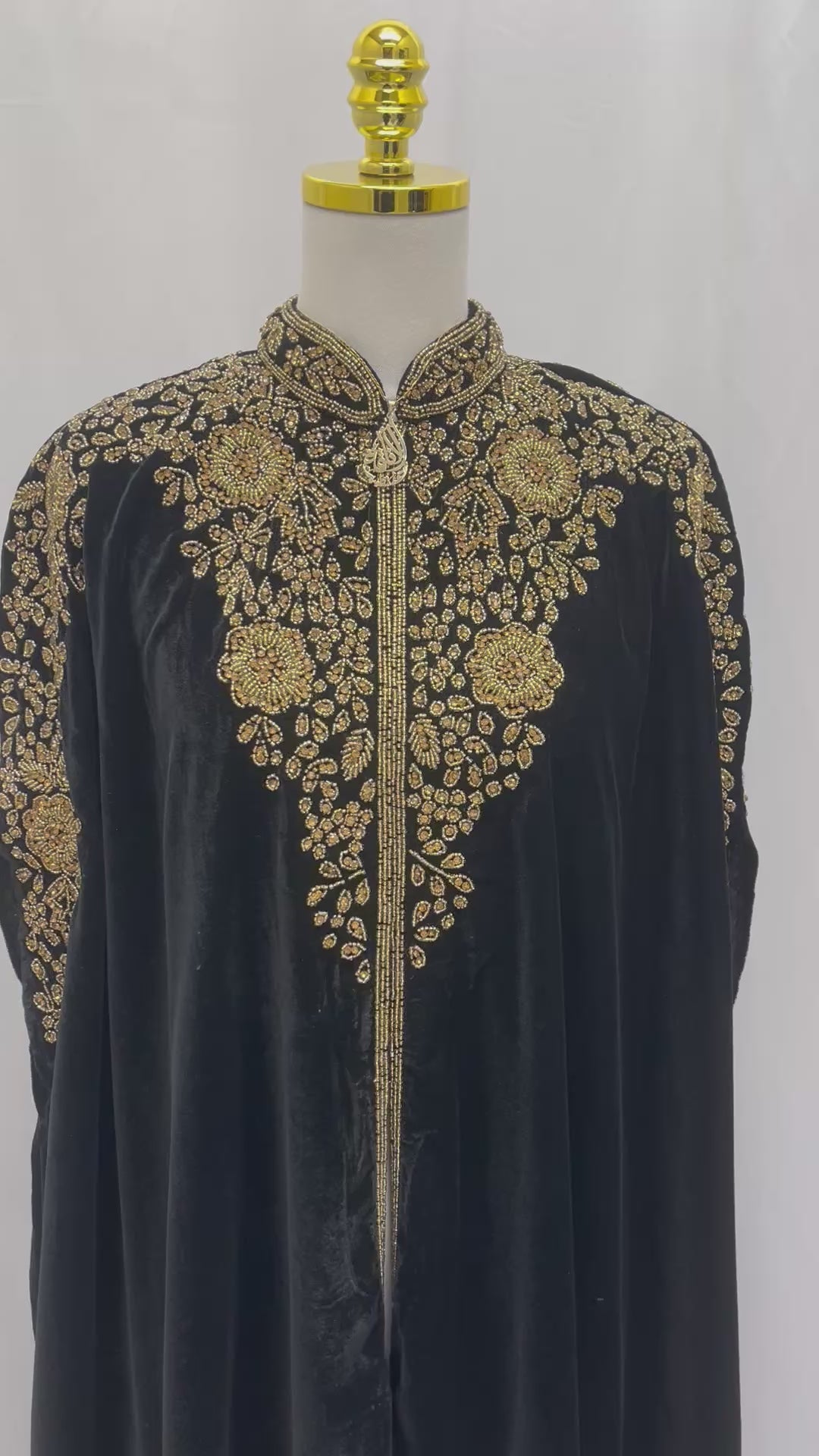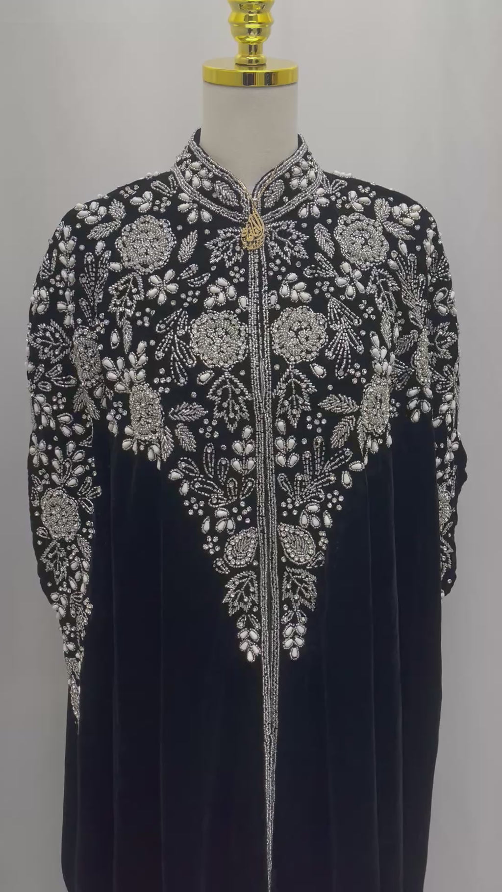 The Luxury Black Blooming Velvet Embellished Cape brings style to any wardrobe. Designed by Palestinian Elegance, this piece features intricate traditional embroidery on soft black velvet. The Velvet Embellished Cape looks rich and elegant from every angle. Each stitch highlights the artistry of Palestinian craft. The floral patterns create a luxurious appearance that stands out in gatherings.