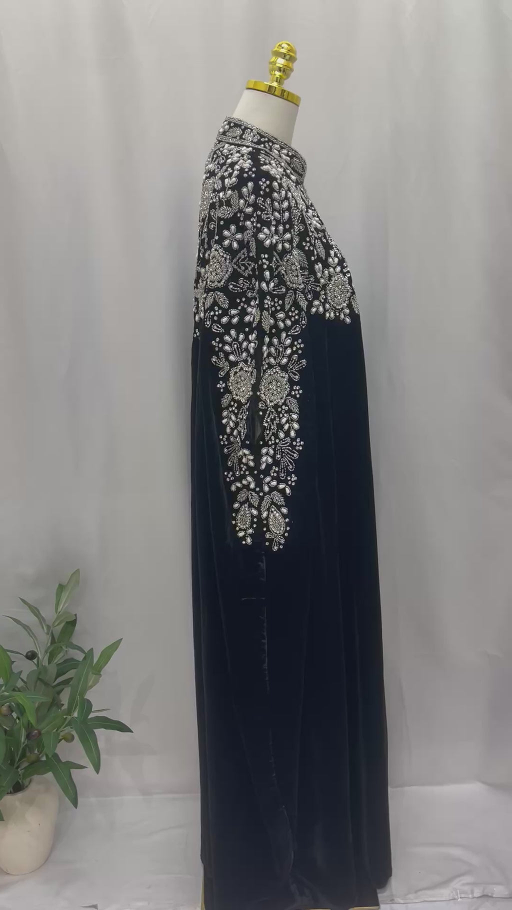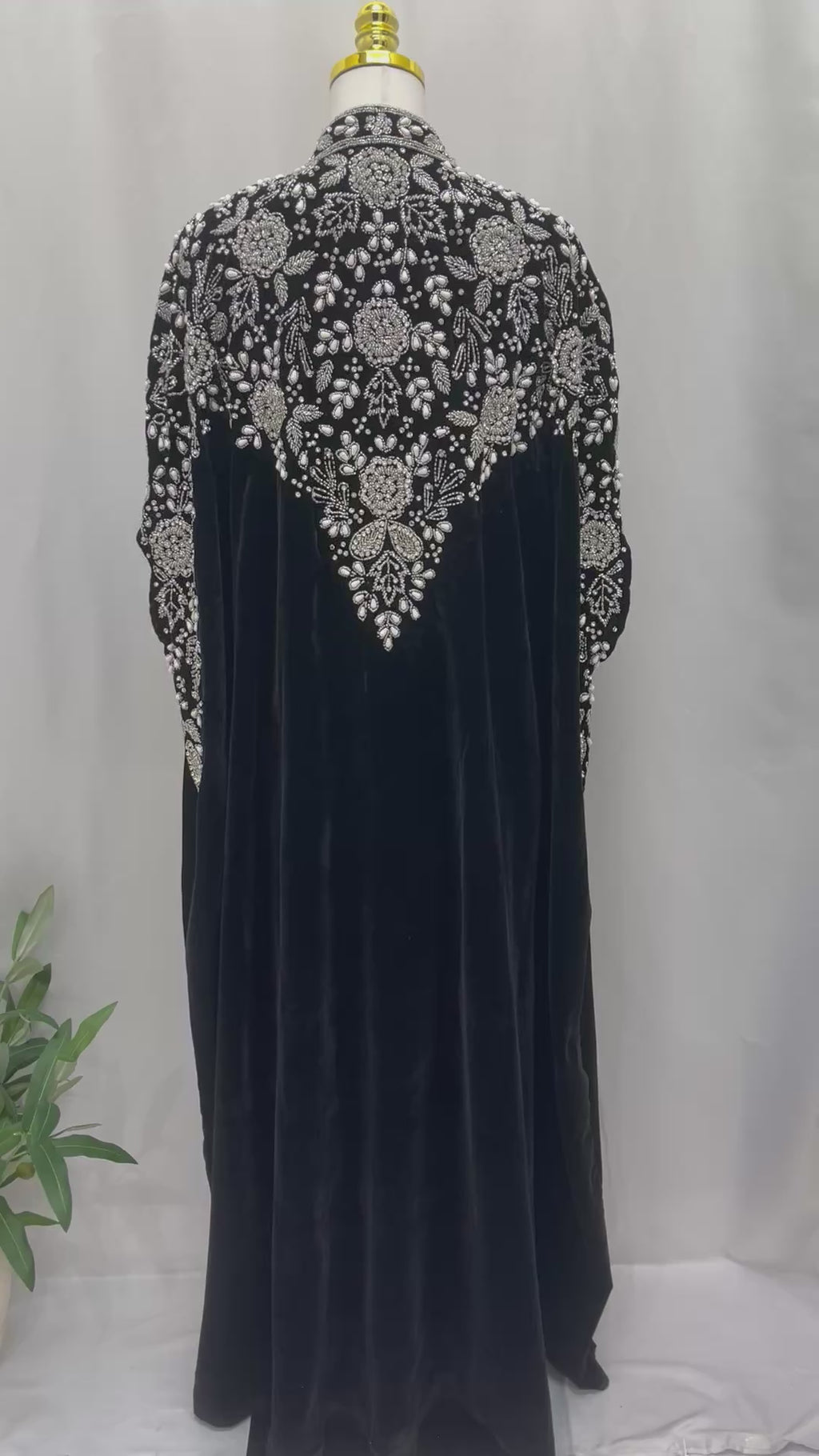 The Velvet Embellished Cape feels smooth against the skin. The material drapes gracefully, creating an effortless, modest silhouette. The front opening adds ease for layering over dresses, abayas, or kaftans. Silver-tone threads catch the light with subtle shimmer. The long cape design offers both comfort and coverage.