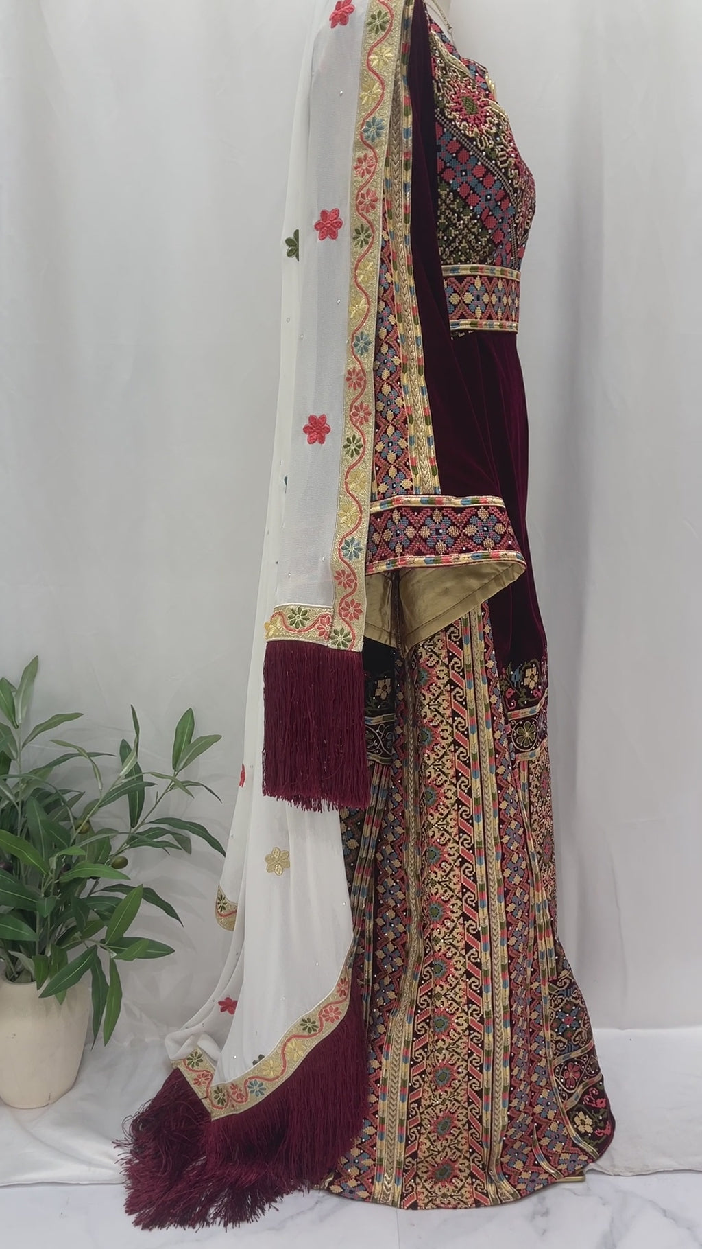 A luxurious Palestinian velvet thobe, richly adorned with authentic traditional embroidery. The set includes an embroidered thoub shawl, a matching embroidered belt, and an orchard overskirt, creating a regal ensemble perfect for brides and special occasions.