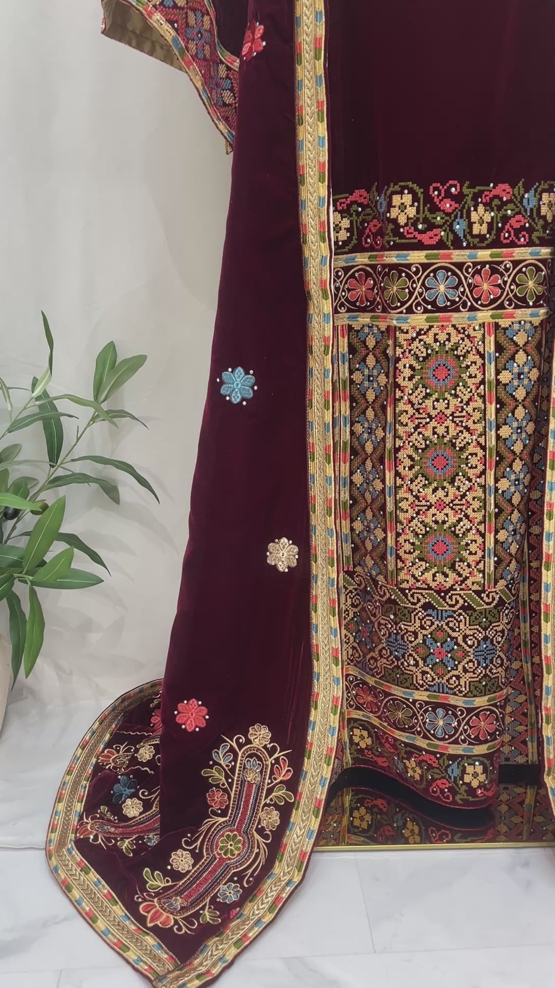 ثوب فاخر من المخمل المطرز بجودة عالية، مزين بتطريز تراثي فلسطيني أصيل. يأتي الطقم متكاملًا مع شال مطرز، حزام مطرز بنفس النقشة، وشاحط ليمنح إطلالة ملكية تناسب العروس والمناسبات المميزة