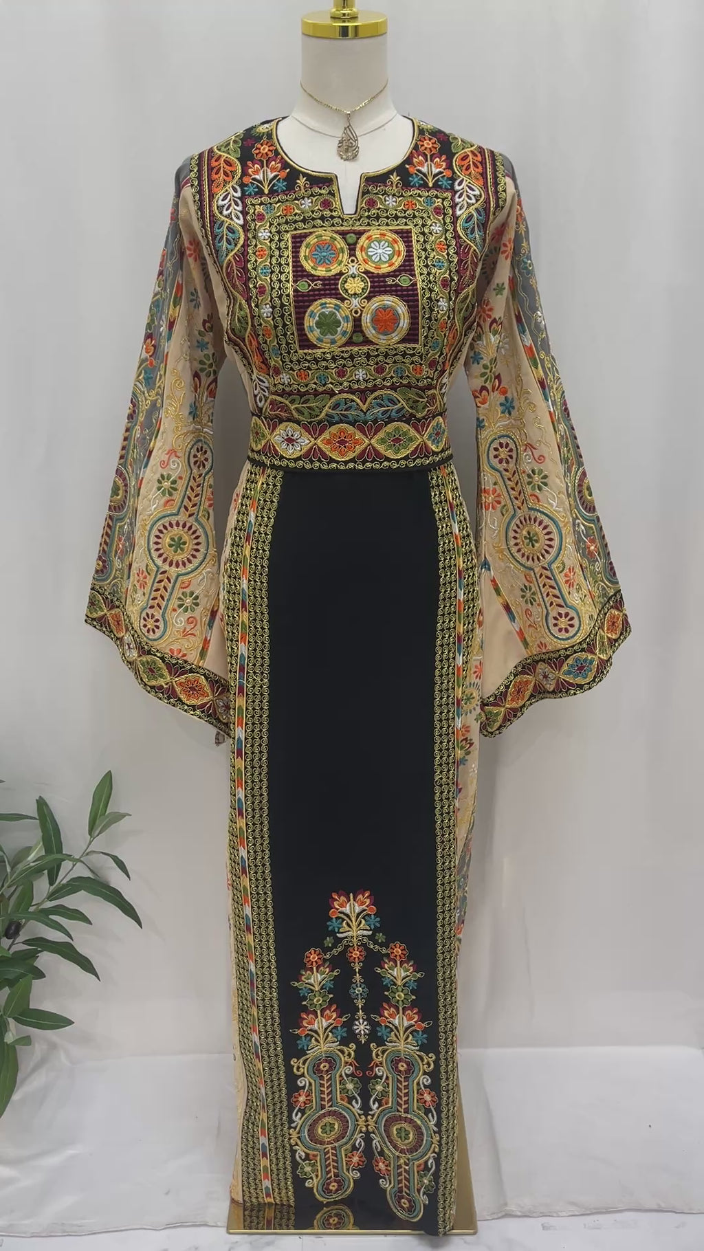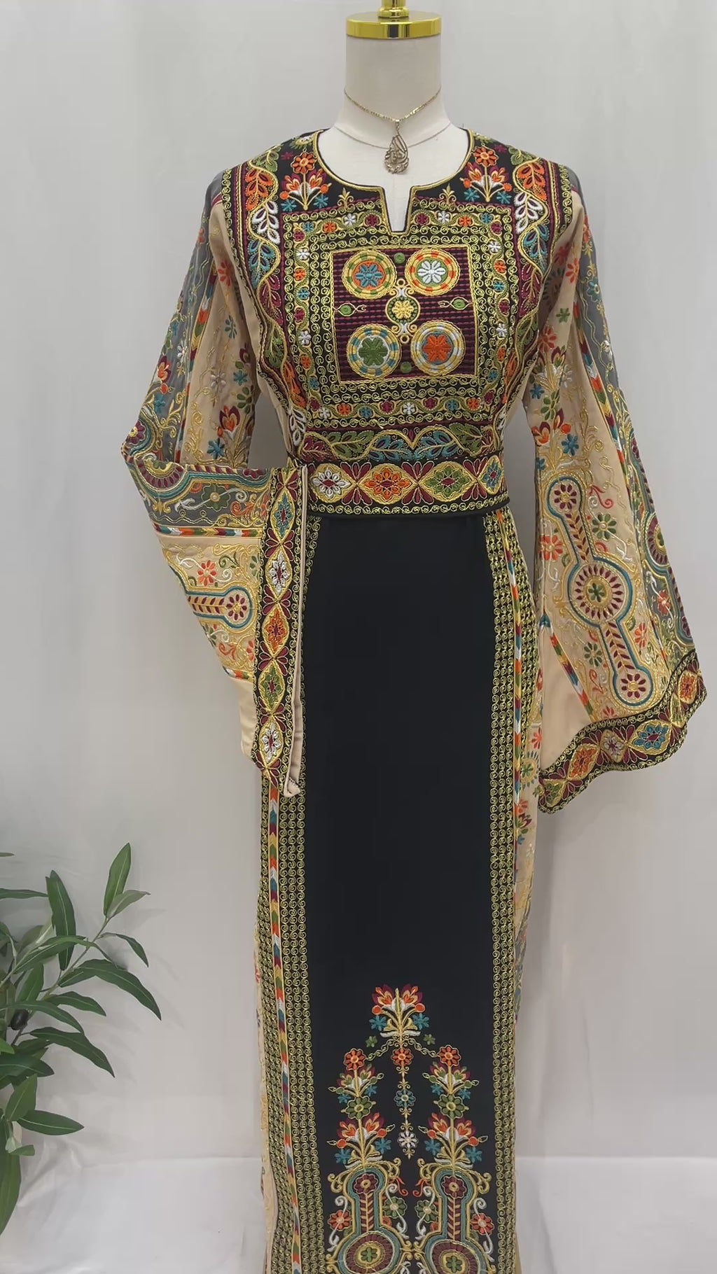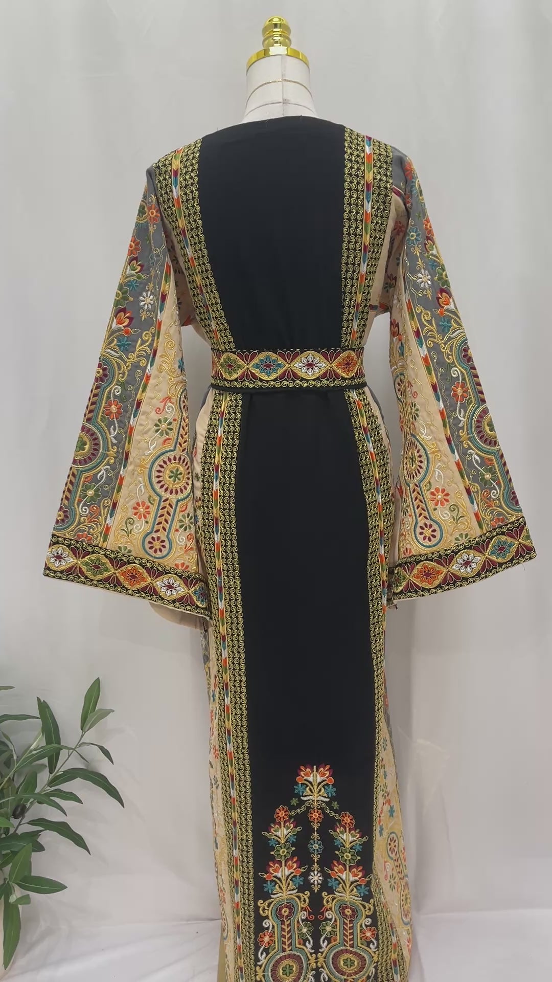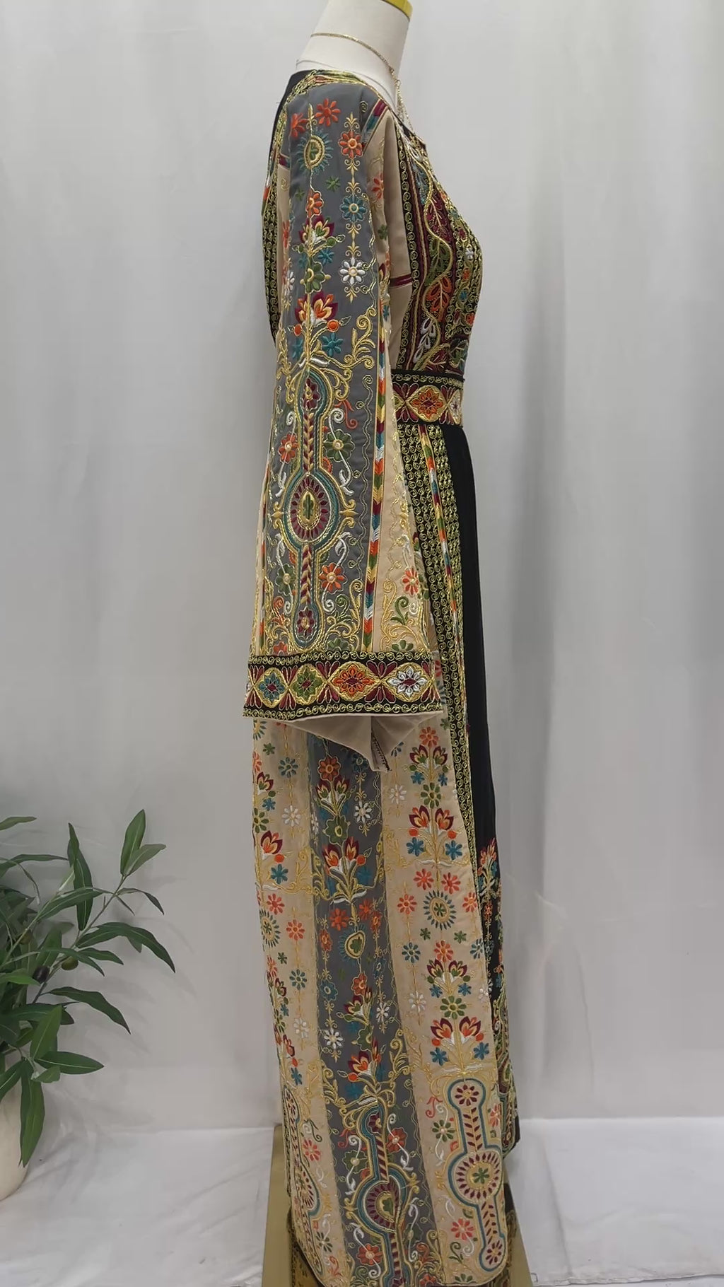 Rafif Embroidered Thobe by Palestinian Elegance side view on mannequin showing intricate multicolor Palestinian embroidery