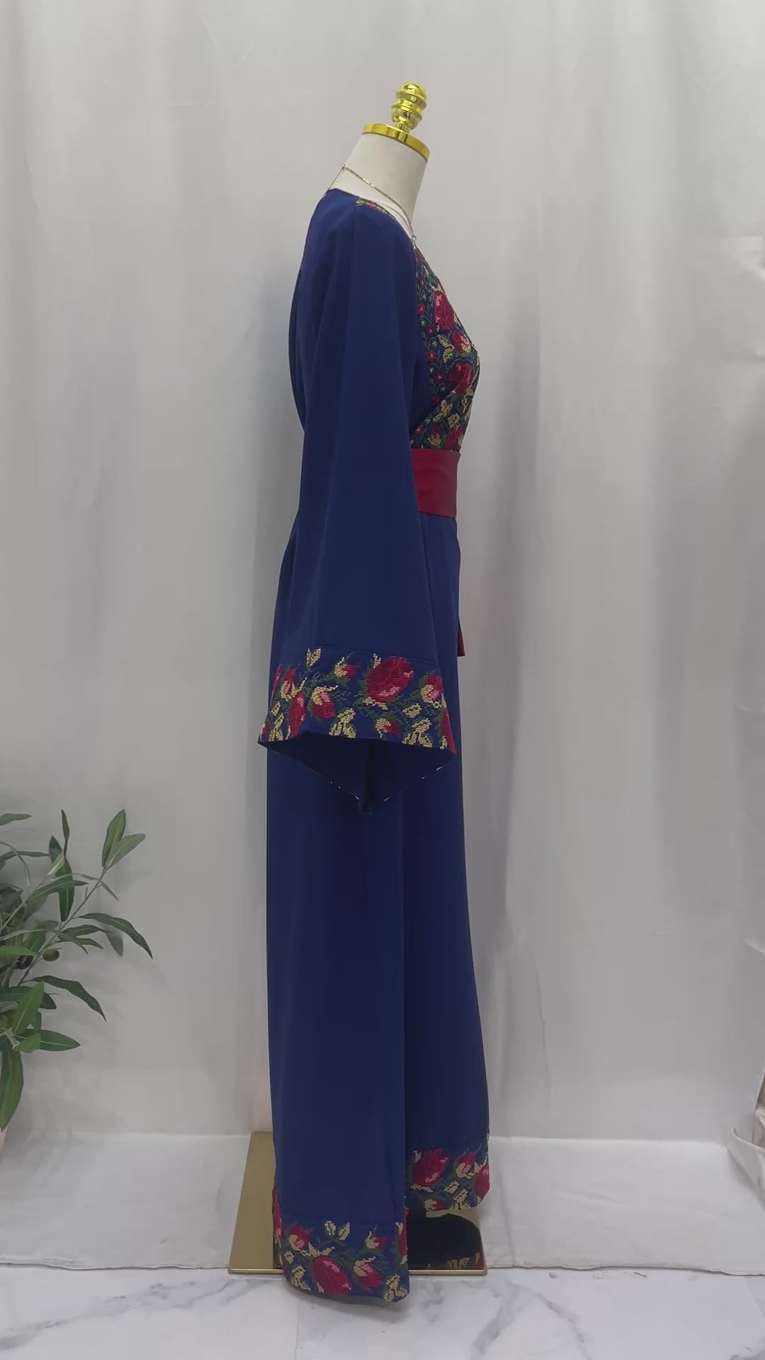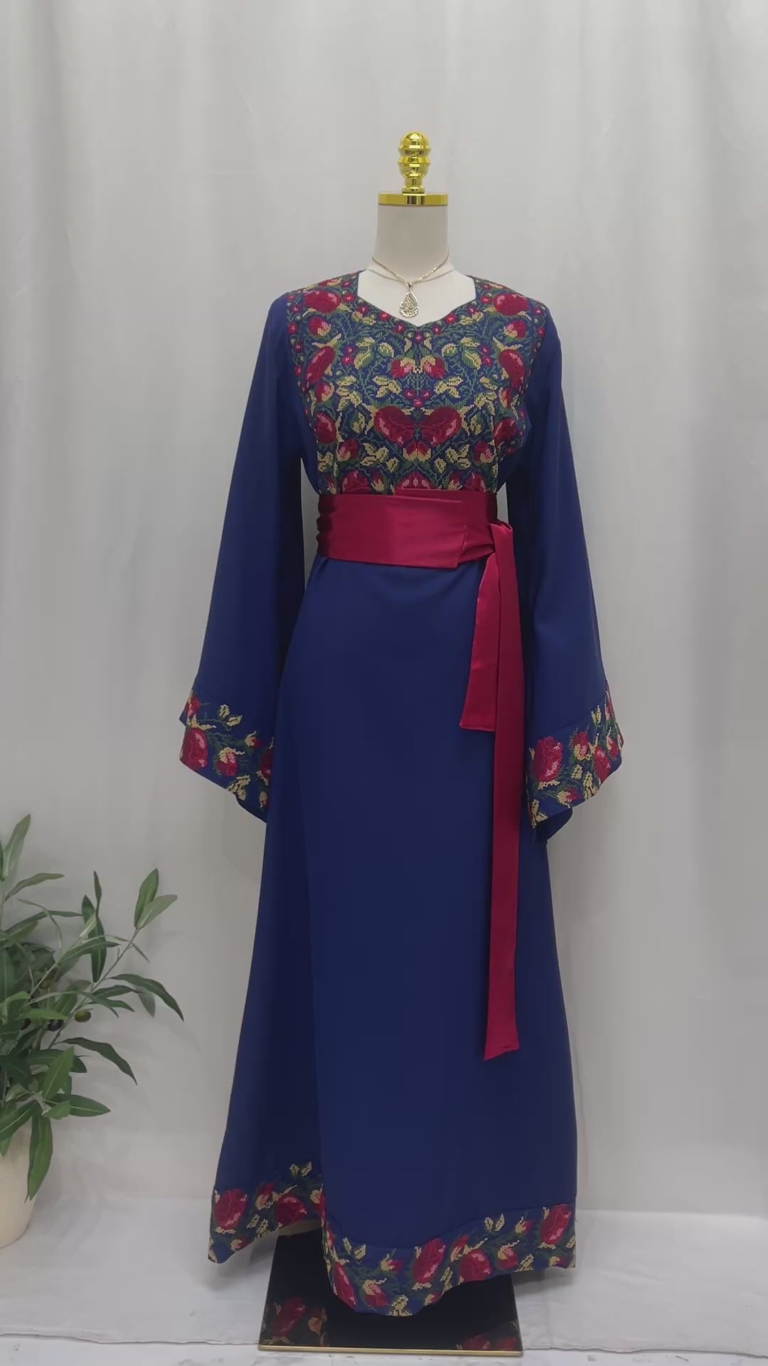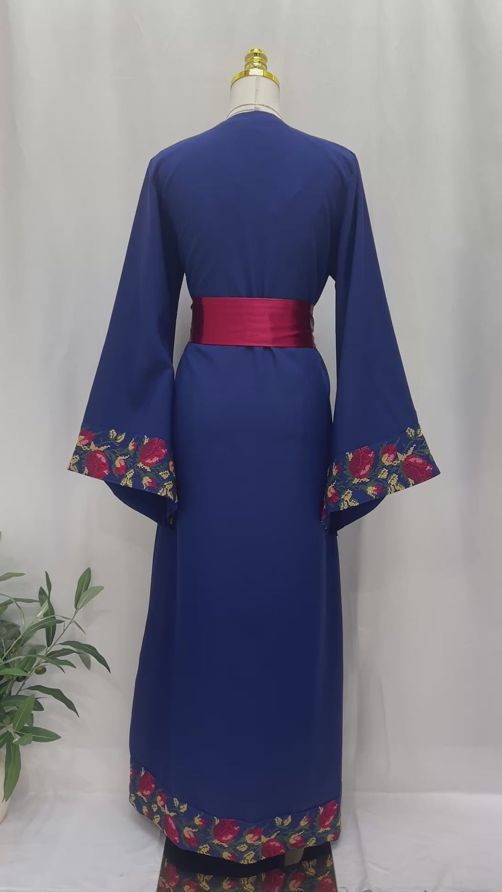 An elegant Royal-blue thobe that blends simplicity with heritage. Decorated with delicate floral machine embroidery on the chest and sleeves, it adds a subtle touch of charm. The design includes a removable satin maroon belt that highlights the waist, balancing modern elegance with traditional style. With its flowing fabric, full length, and wide sleeves, this piece is perfect for refined outings or intimate occasions, embodying heritage with a soft contemporary twist.