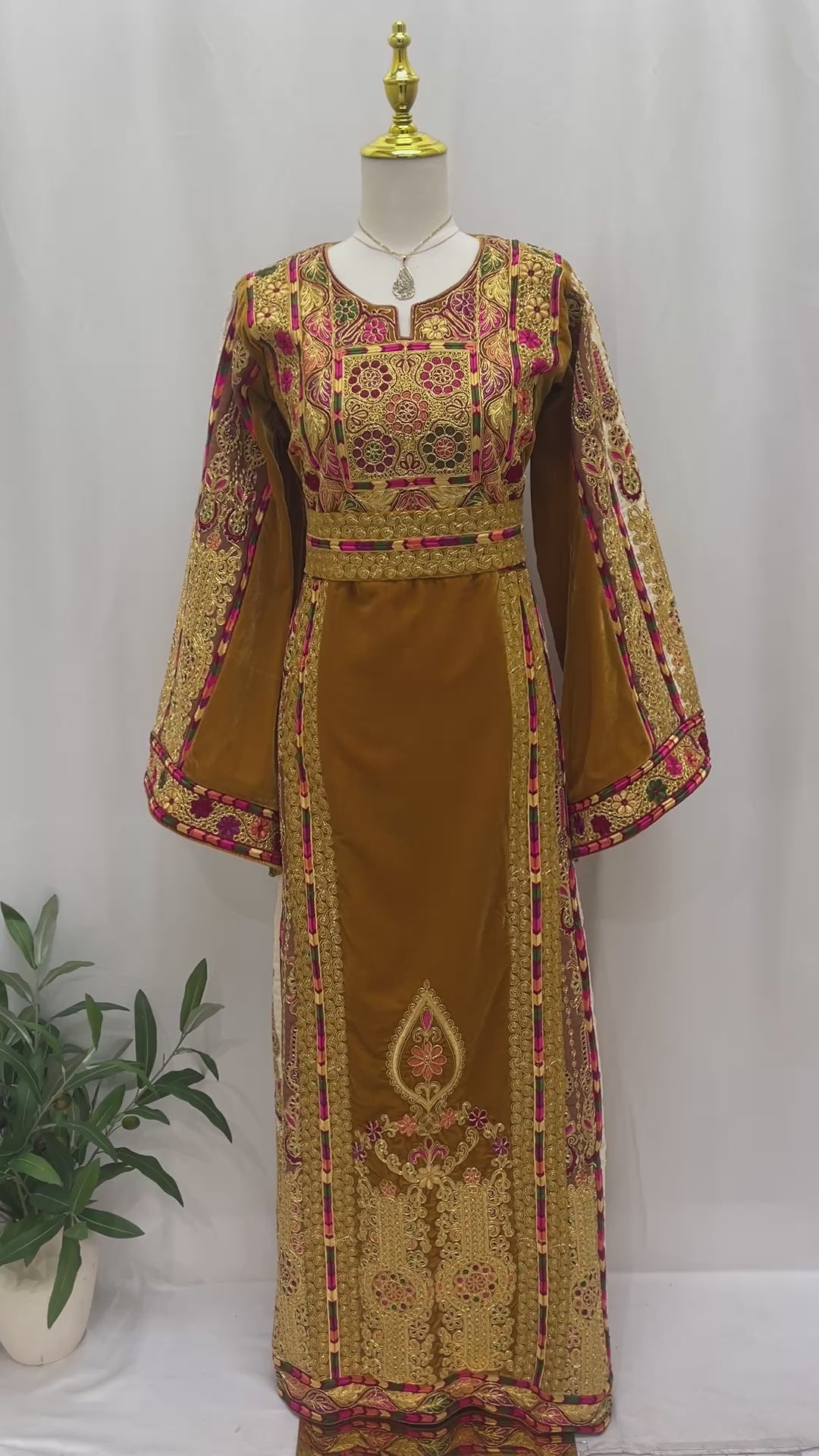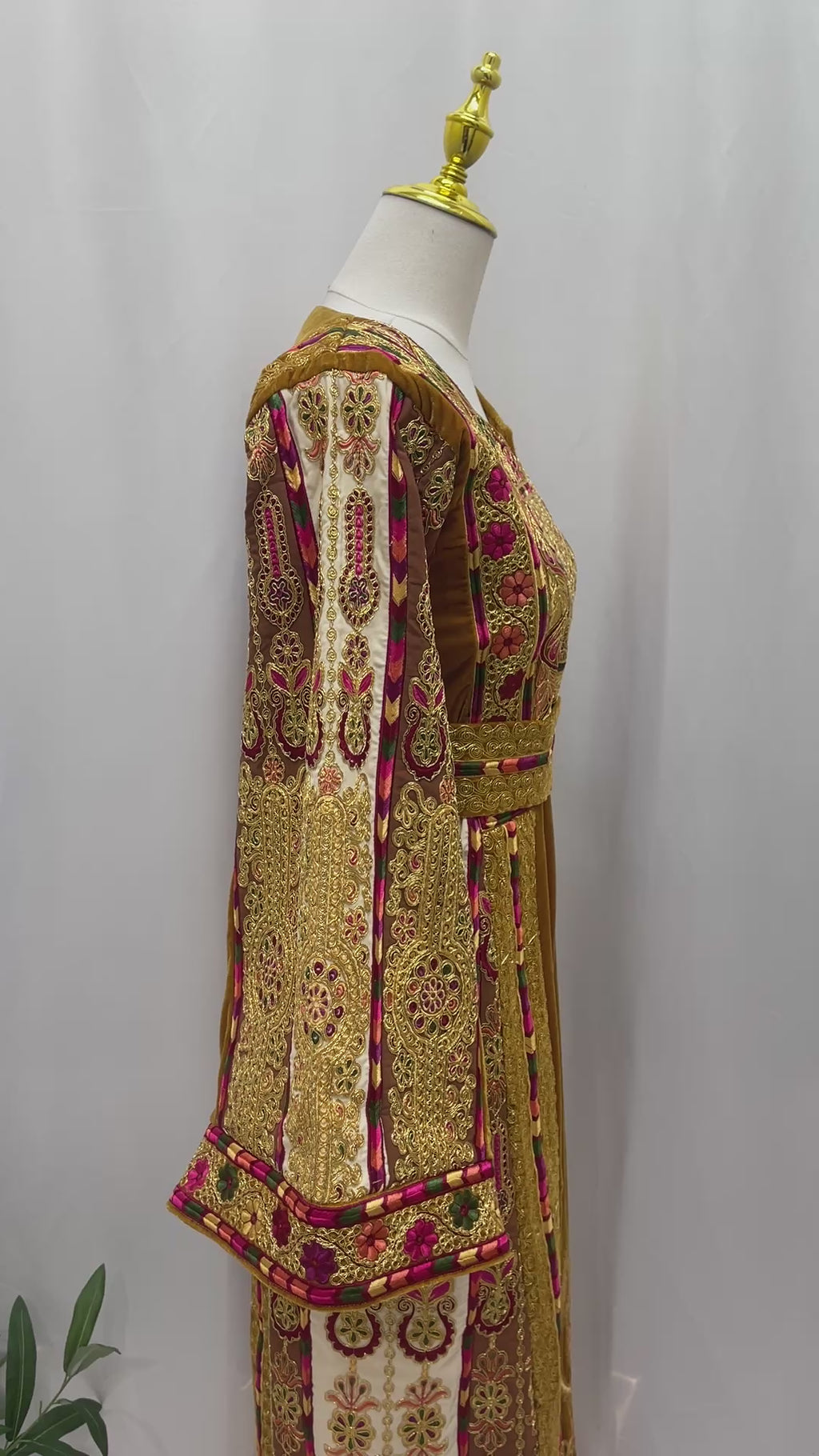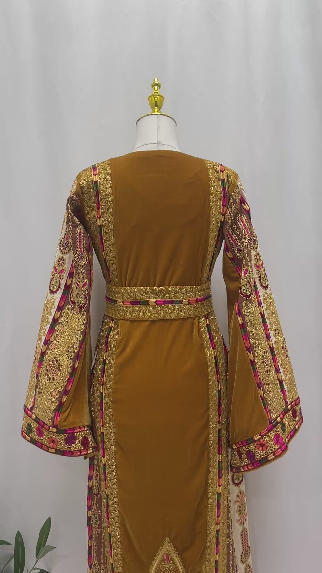 Experience heritage and style with the Mustard Brown Velvet Traditional Malaka Embroidered Thoub from Palestinian Elegance. This beautiful piece features intricate hand embroidery inspired by classic Palestinian patterns. The rich velvet fabric gives a soft, luxurious feel against the skin.