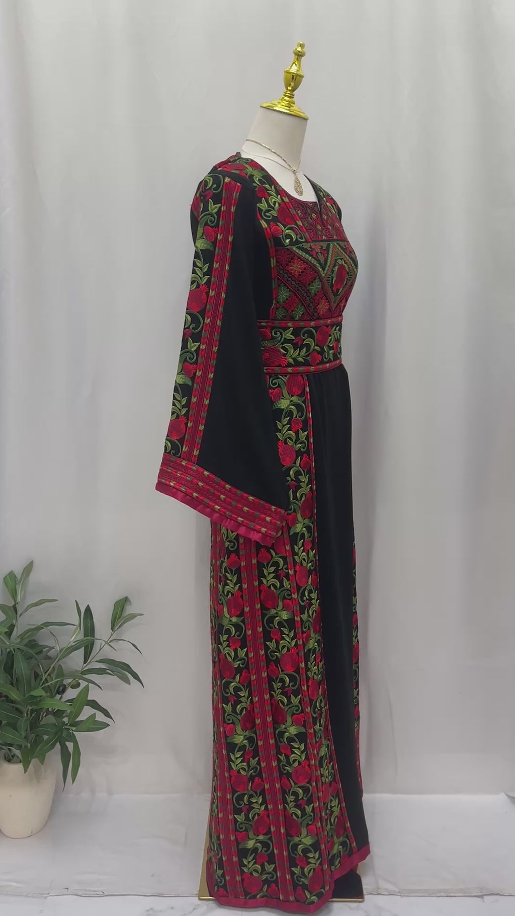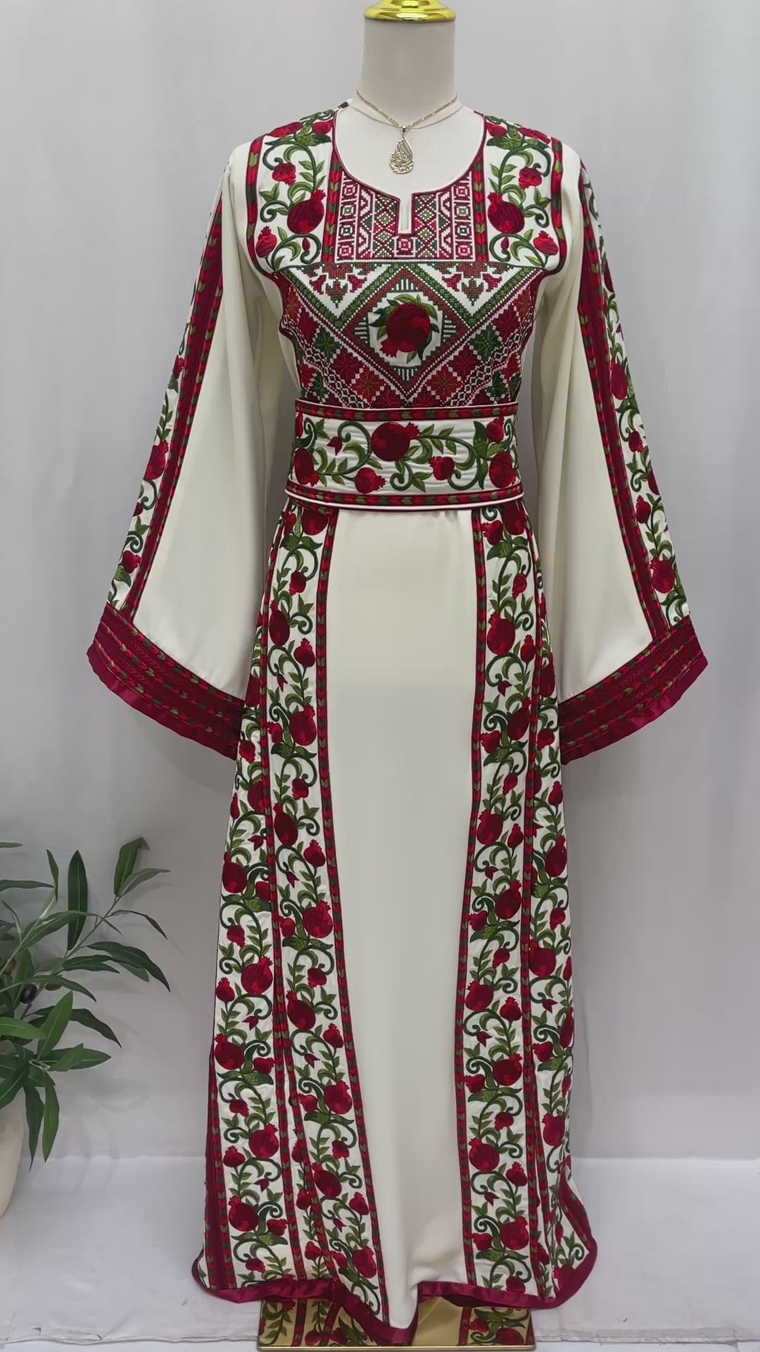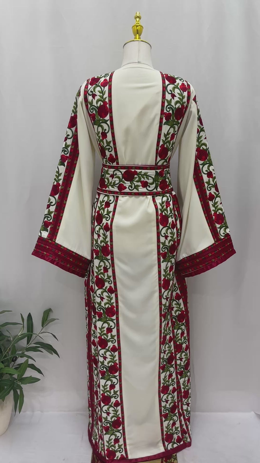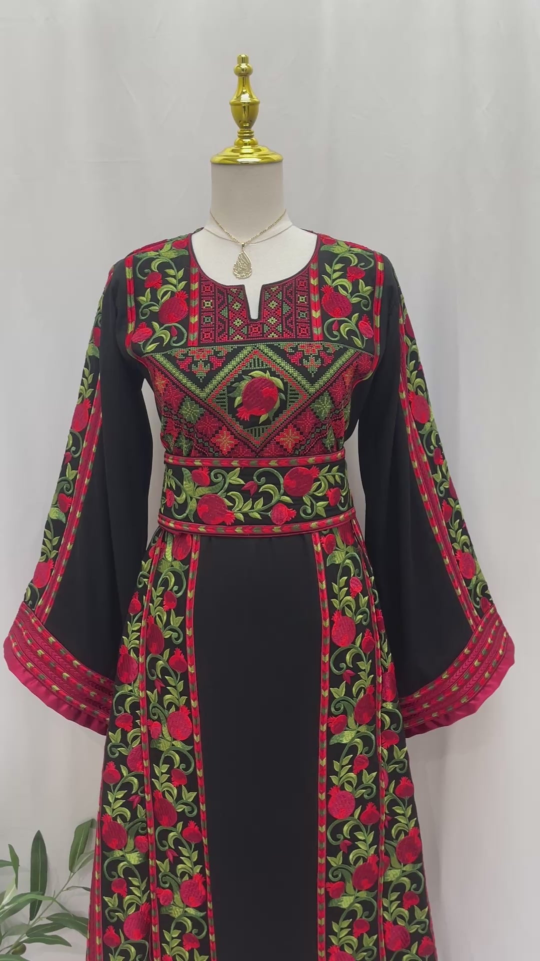 Where heritage meets elegance — this exquisite Palestinian thobe blooms with pomegranate motifs, each stitch a story of prosperity, beauty, and blessing. Deep crimson and lush green threads dance across the fabric like a garden in full bloom, creating a masterpiece of tradition and timeless grace.