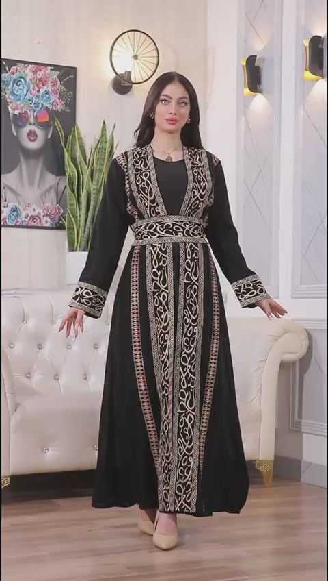 Step into timeless style with the Basma Arabic letters with heritage embroidery Bisht. This open abaya blends classic charm with modern comfort. Each thread is inspired by Palestinian heritage. The elegant patterns bring history to life. Embroidery is rich and detailed along the front and sleeves. Fabric feels soft and light. It moves easily with your stride.