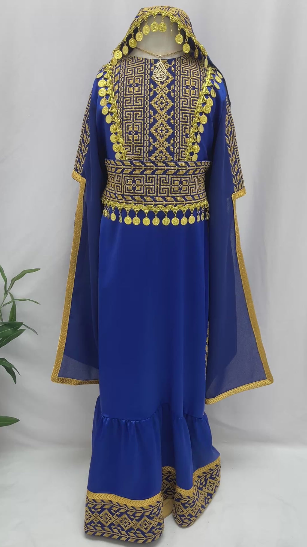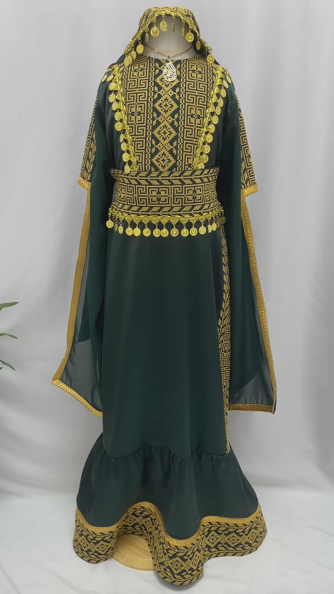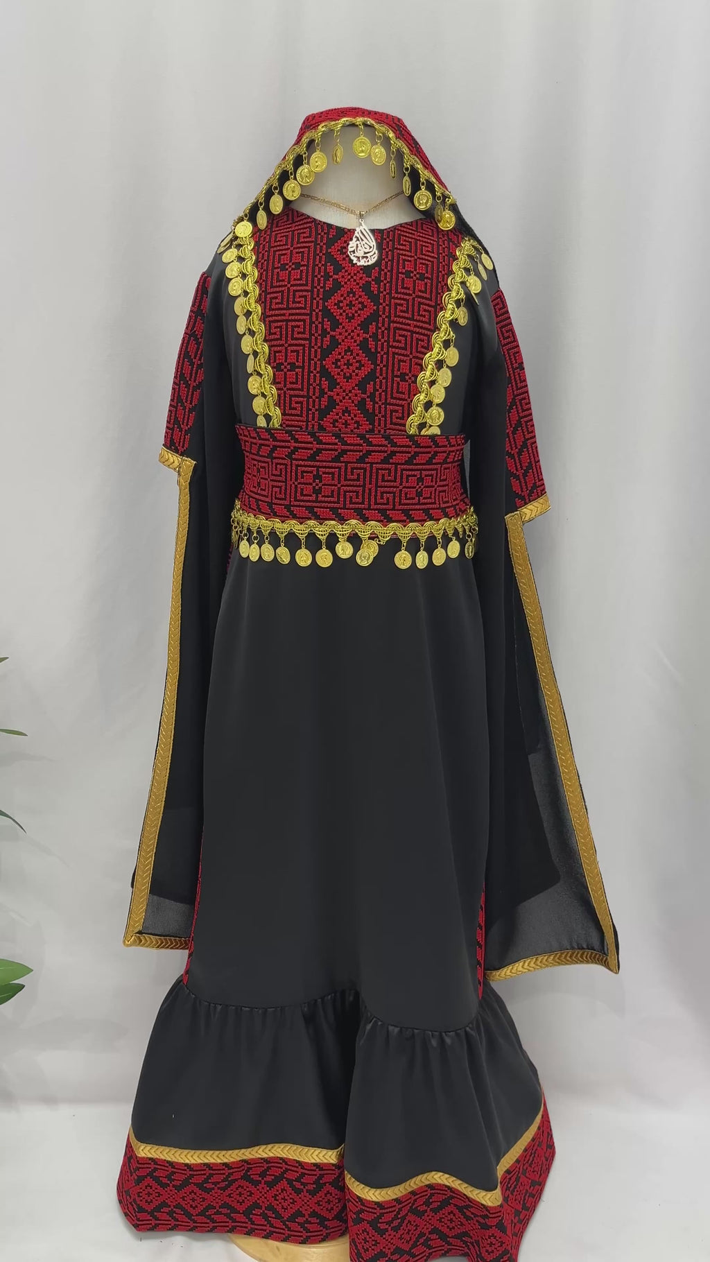 A graceful traditional Palestinian-inspired thobe designed specifically for girls. This Coin Embroidered Girls Thobe features rich geometric embroidery combined with elegant coin detailing. It reflects a timeless heritage that connects culture with modern elegance and charm.