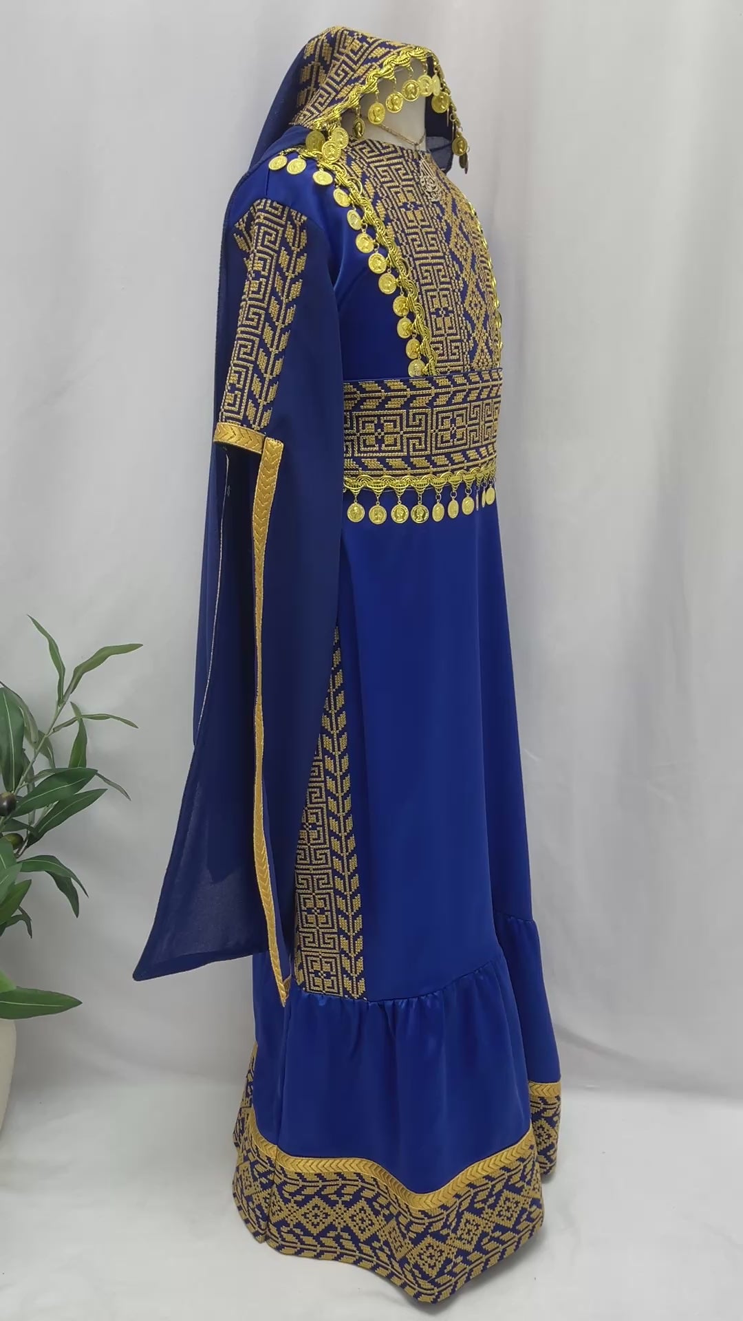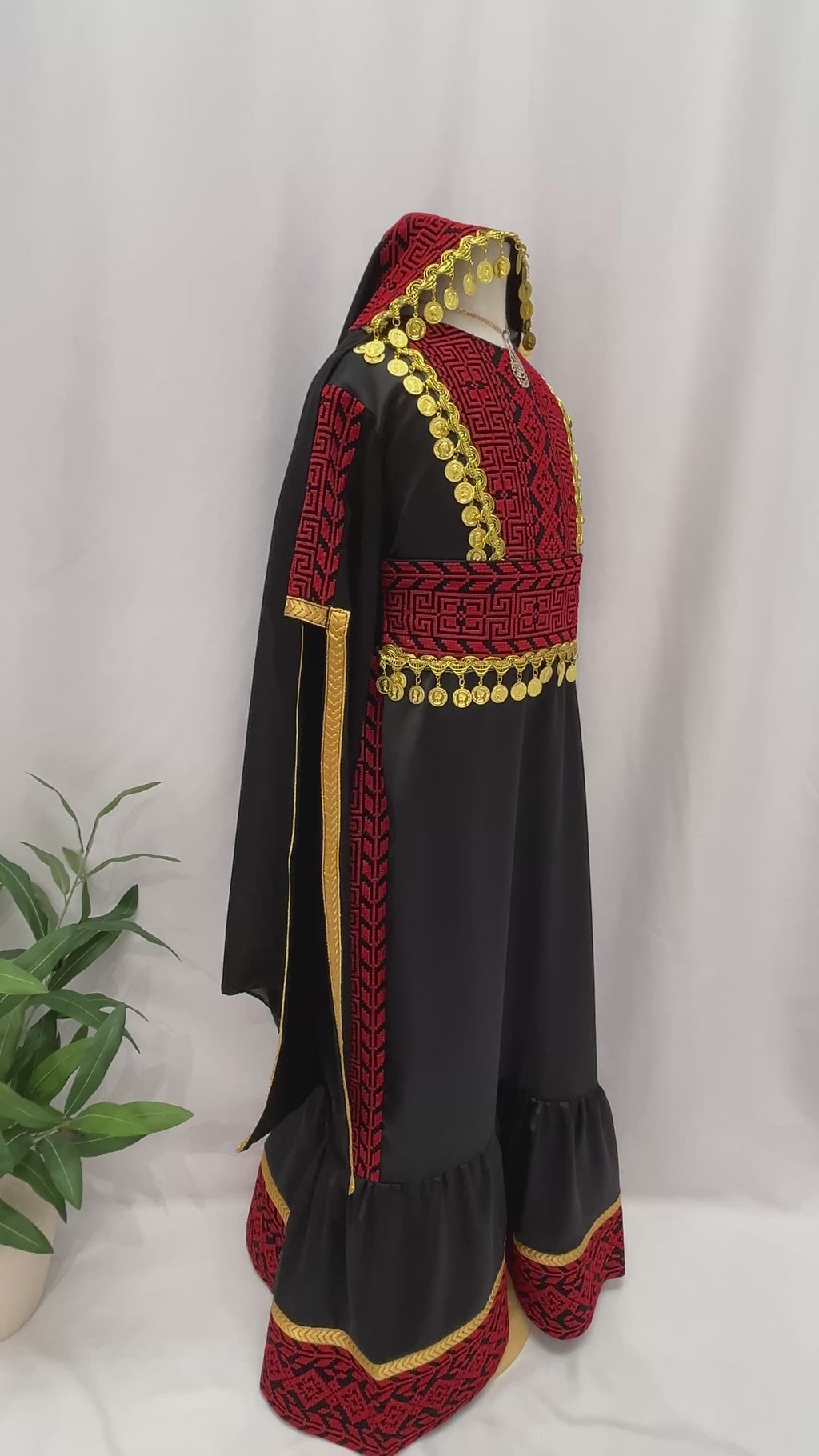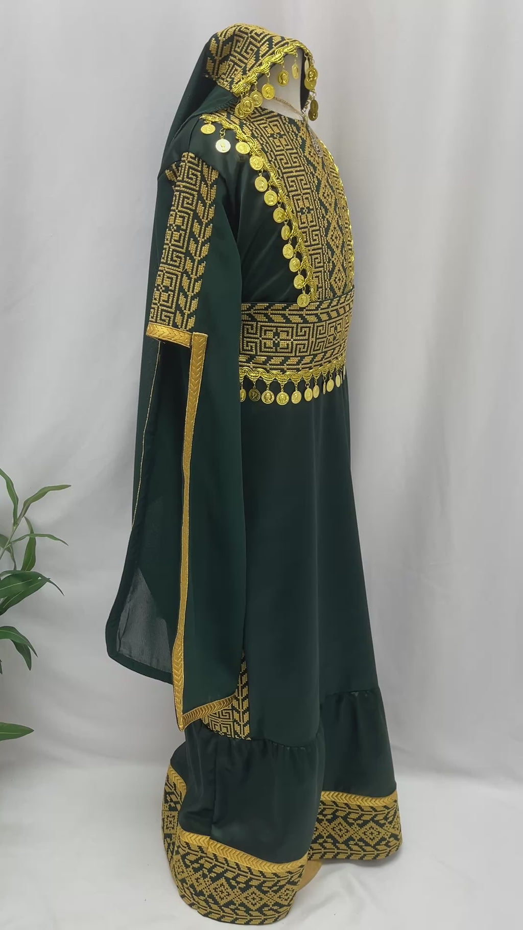 A graceful traditional Palestinian-inspired thobe designed specifically for girls. This Coin Embroidered Girls Thobe features rich geometric embroidery combined with elegant coin detailing. It reflects a timeless heritage that connects culture with modern elegance and charm.