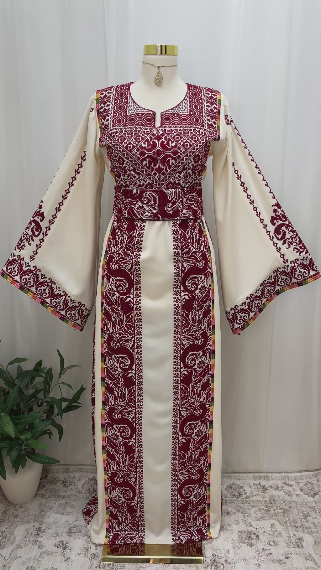 Designed with wide flowing sleeves and a structured silhouette, the thobe is accented with rich embroidered panels across the bodice, sleeves, and front. A matching embroidered belt defines the waist, adding elegance while preserving a strong, regal presence.