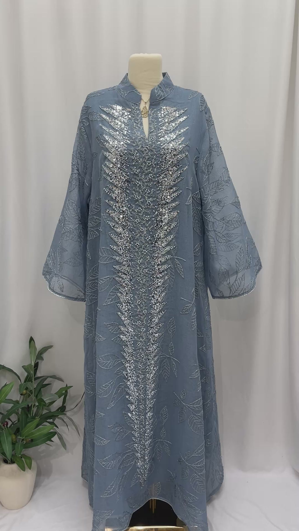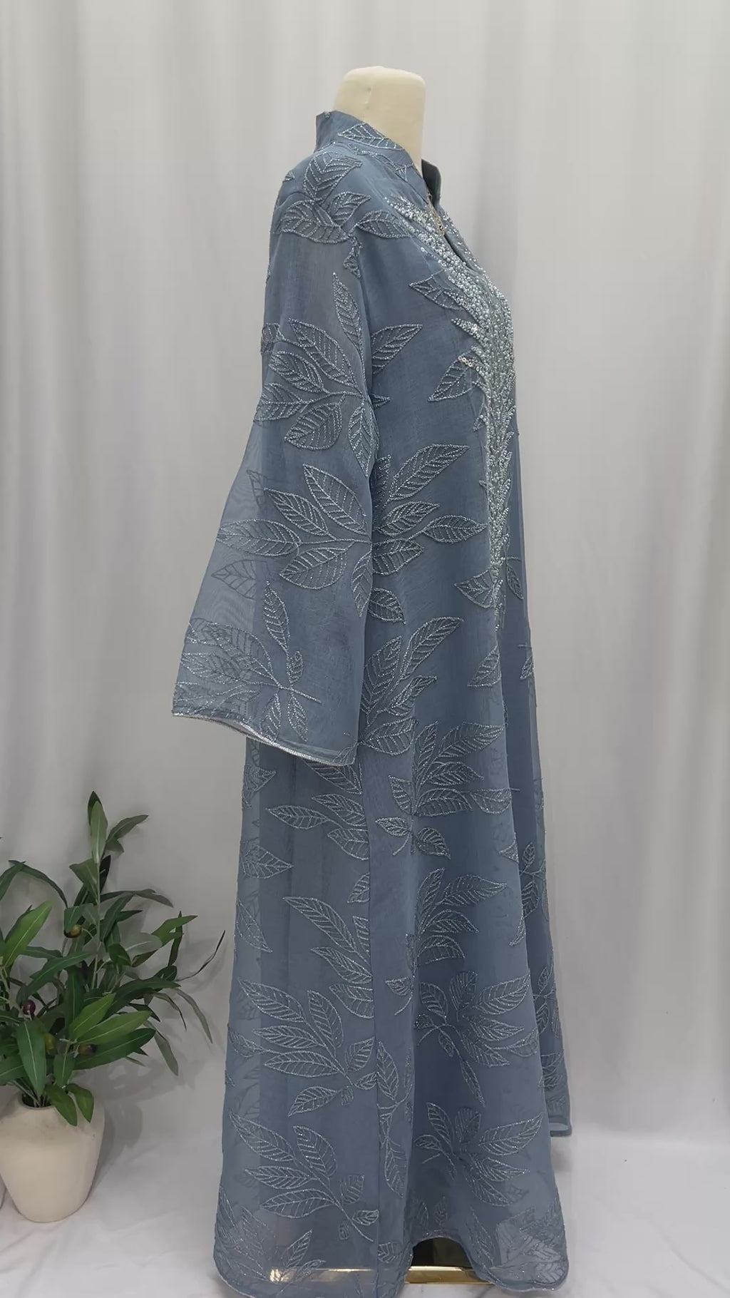 Available in three distinctive colors, the Elegance kaftan is designed to complement a variety of skin tones and preferences. Choose from Steel Blue, Ivory, or Gray—each offering its own subtle charm. The color palette enhances the garment’s delicate leaf pattern and sequin accents, contributing to an overall refined look.