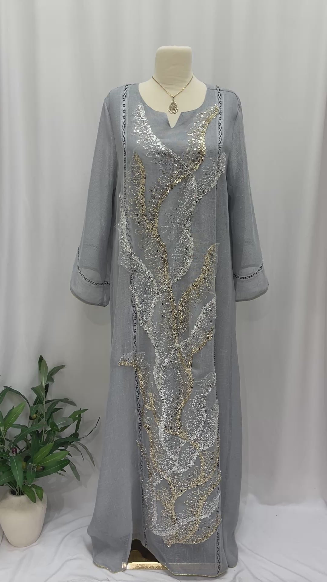 In summary, the Elegance kaftan is more than just a piece of clothing; it is a celebration of grace, style, and tradition. Its combination of delicate leaf motifs and shimmering silver sequins captures true elegance. Add this exquisite kaftan to your wardrobe and enjoy its versatile charm for years to come.