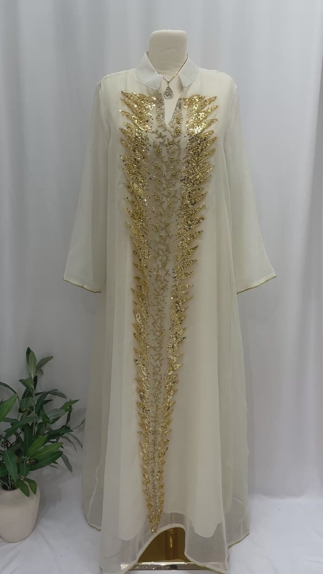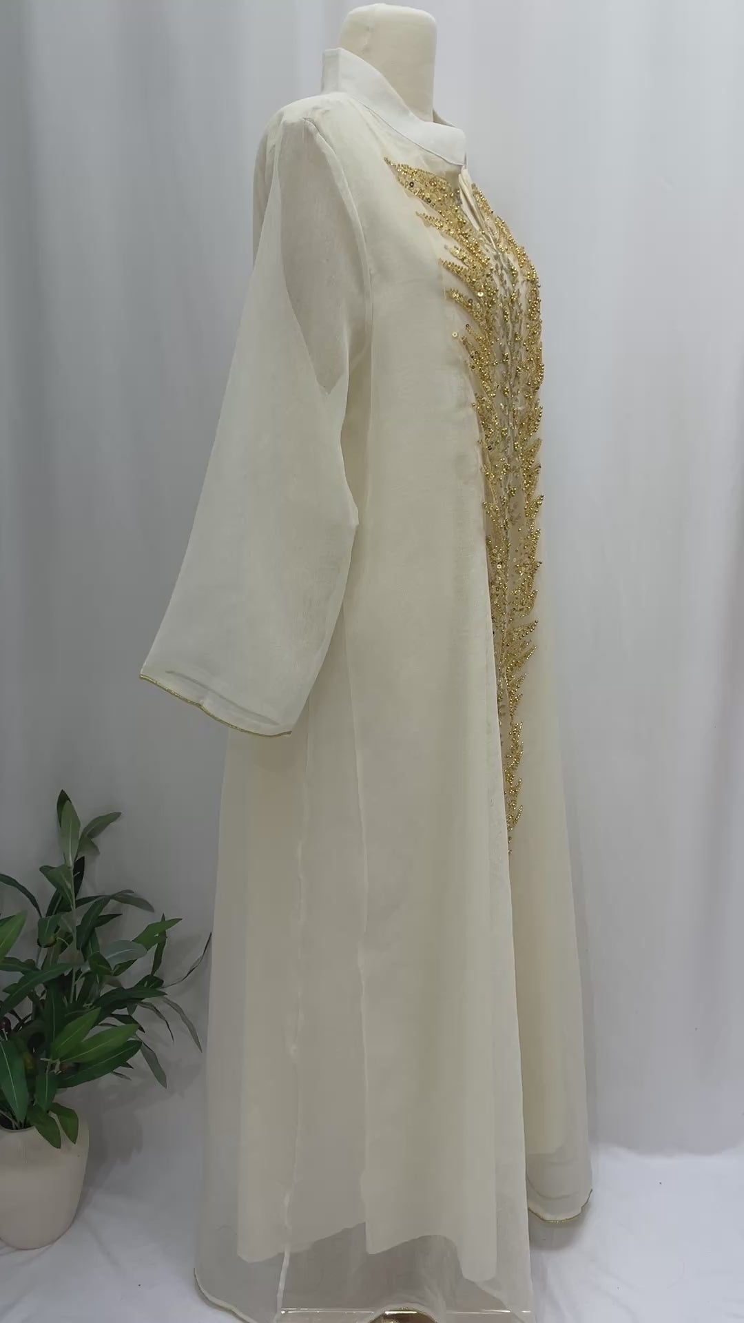 The Elegance kaftan combines modern design with classic touches for a truly unique look. Its sheer fabric is soft and breathable, making it ideal for warm weather events. The subtle leaf pattern enhances texture without overwhelming the design. This kaftan flows gently with every movement, embodying grace and poise.