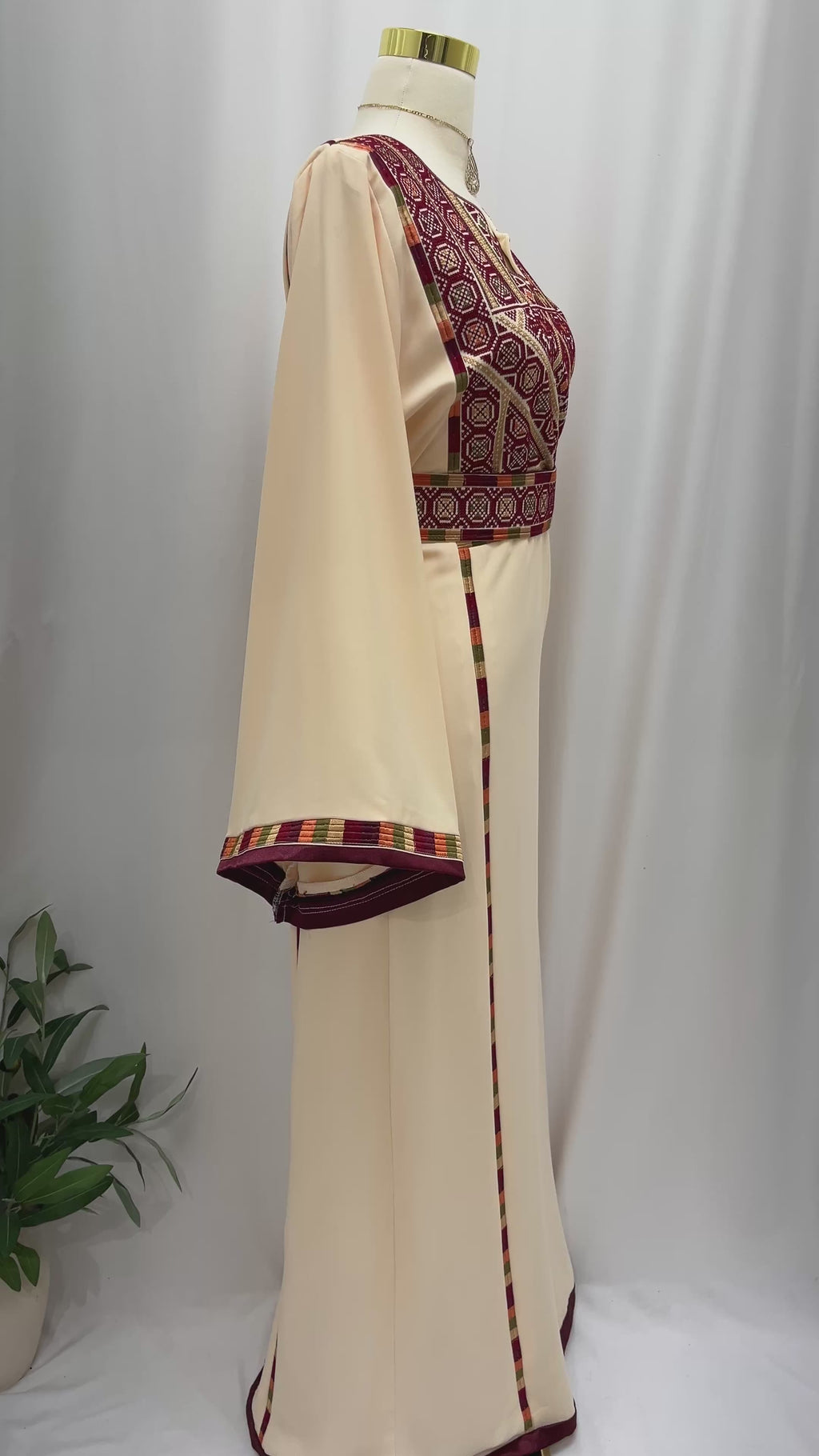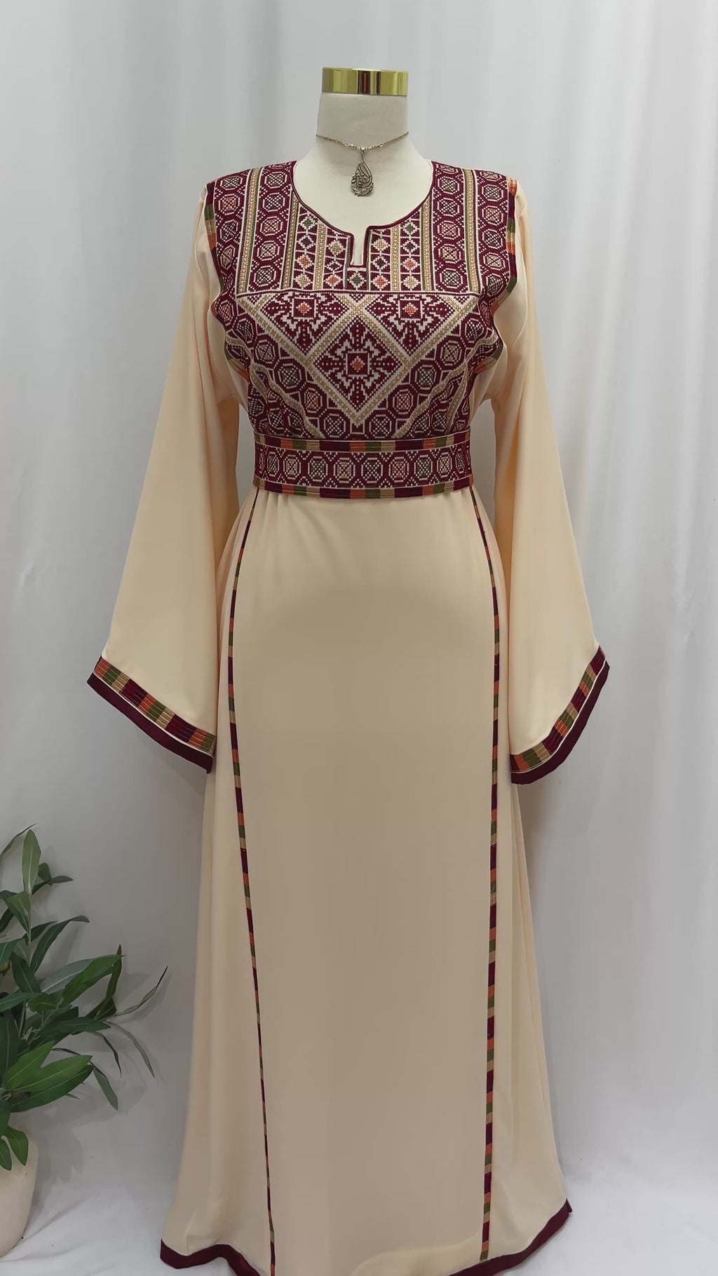 The bodice of this thobe features traditional Manajel embroidery. This intricate design creates a timeless and graceful look that celebrates Palestinian craftsmanship. The embroidery work is precise, with patterns reminiscent of classic motifs seen in heritage clothing. These hand-crafted embroideries add authenticity and charm to the dress, making it perfect for cultural events.