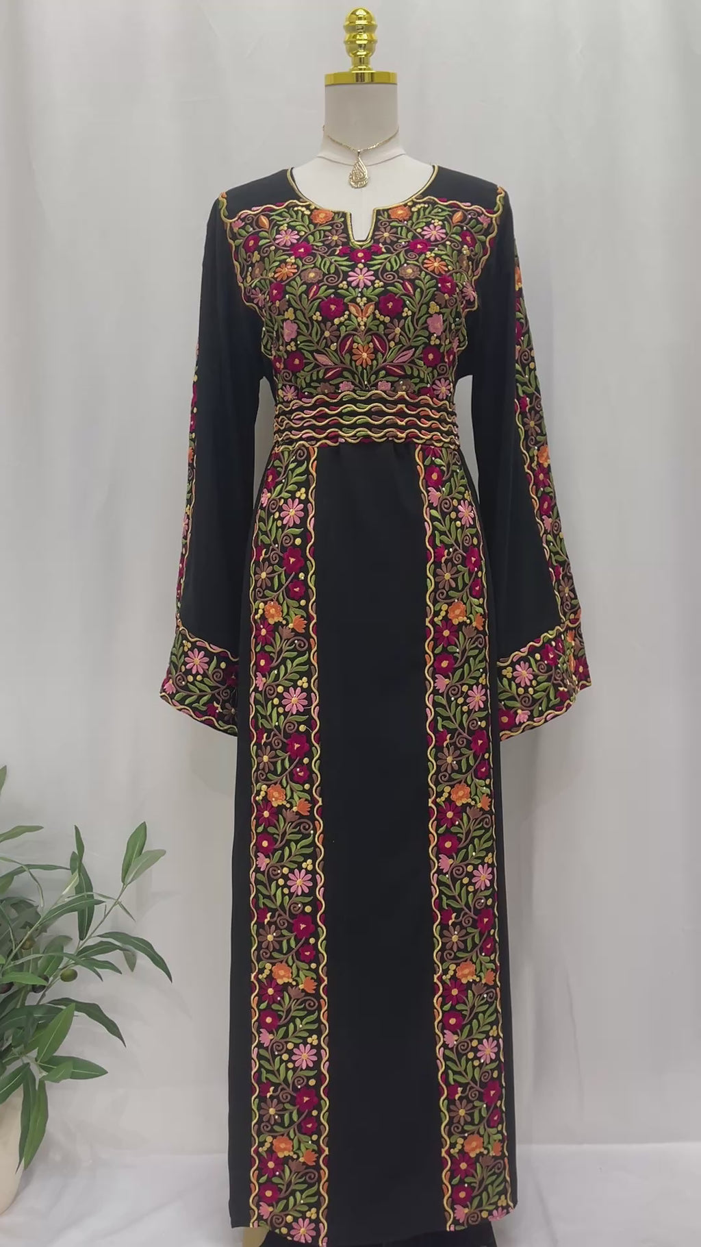 Floral Essence Embroidered Thobe is a stunning traditional Palestinian embroidered dress. It features vibrant floral motifs in shades of pink, green, and orange. These colors beautifully contrast with the elegant black fabric, creating a visually rich and timeless piece. The intricate embroidery covers the bodice, sleeves, and panels, showcasing the skillful craftsmanship behind this design. This dress merges cultural heritage with a touch of feminine grace, making it a great choice for special occasions.