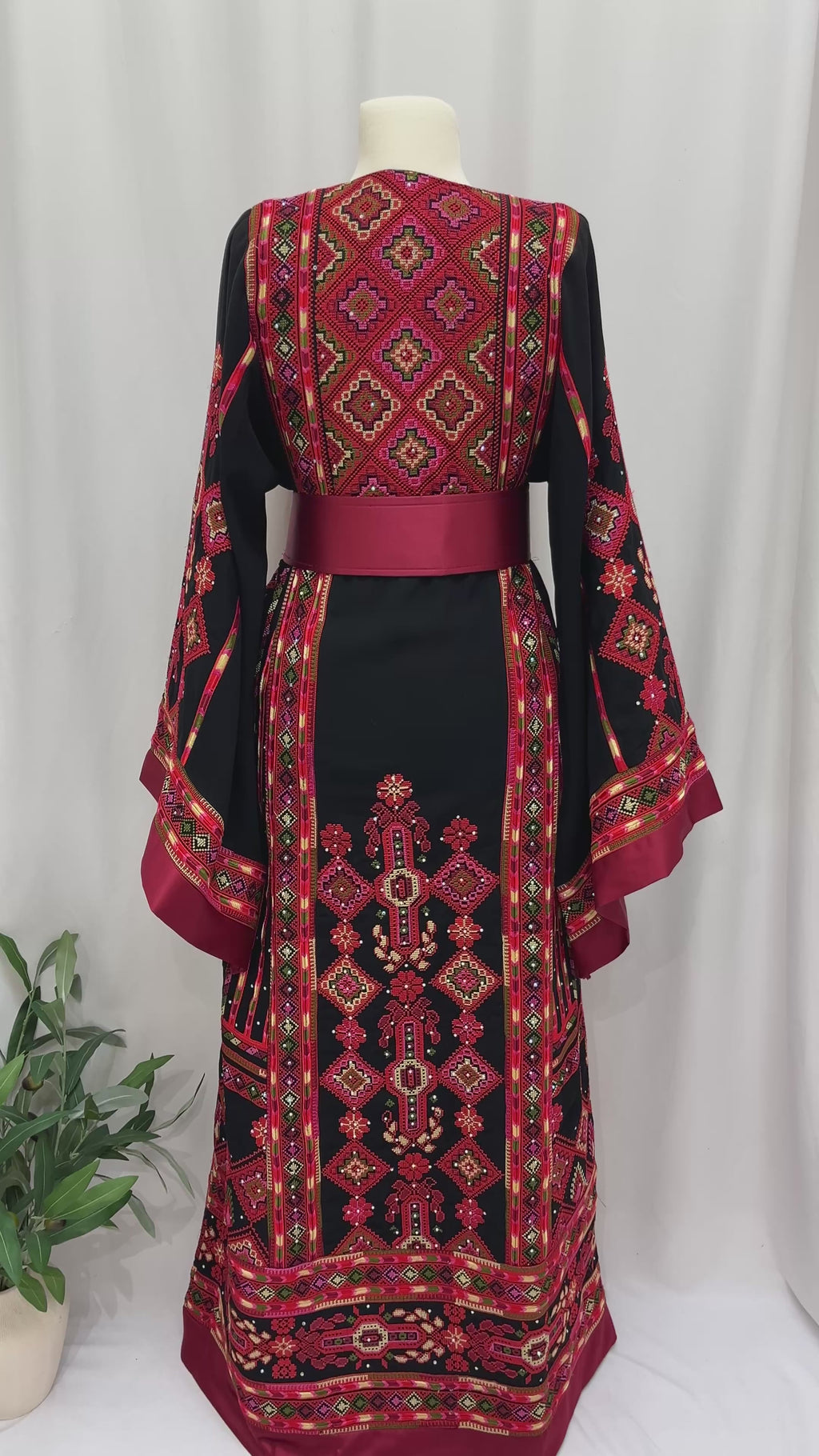 Fully Embroidered Thobe is a striking traditional Palestinian garment. It is designed in a style known for its dense, all-over embroidery. Every inch of this beautiful piece showcases rich, intricate patterns that cover the front, back, sleeves, and hem. This makes the thobe a true showstopper at any event or gathering.