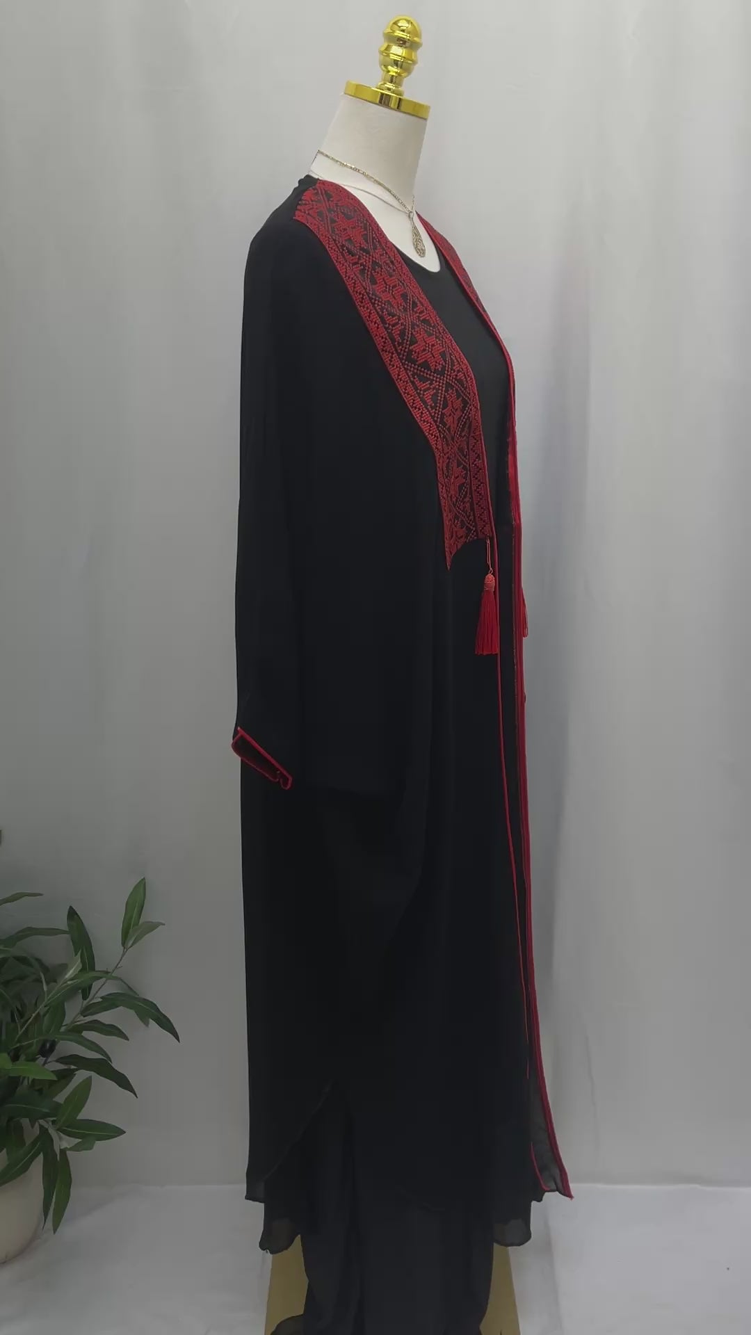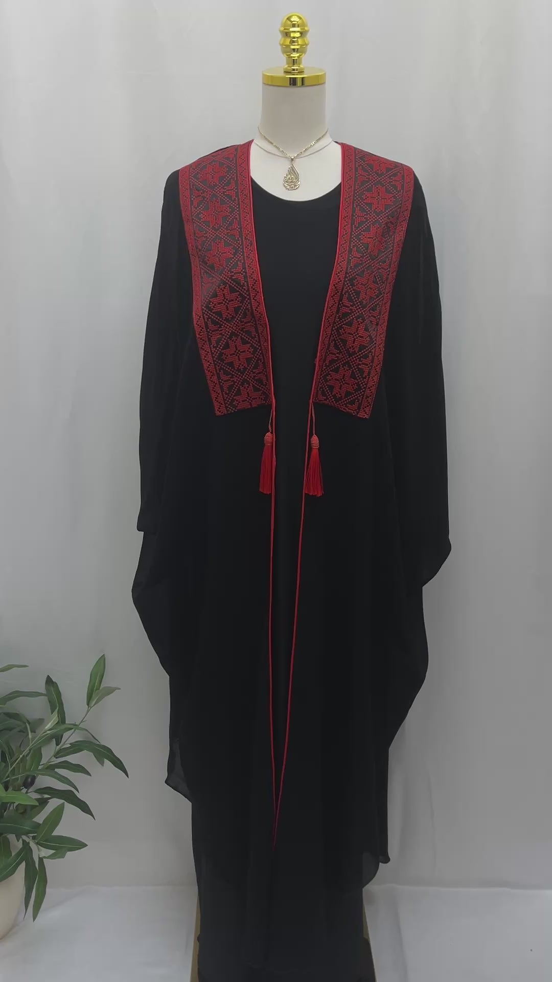 Heritage Black Chiffon Bisht is a stunning garment embroidered with traditional Palestinian red patterns. This bisht features intricate hand embroidery elegantly displayed on the front panel. Made from black chiffon fabric, it offers a lightweight and elegant feel ideal for special occasions. Please note, the inner dress shown in the photos is not included and is available separately.