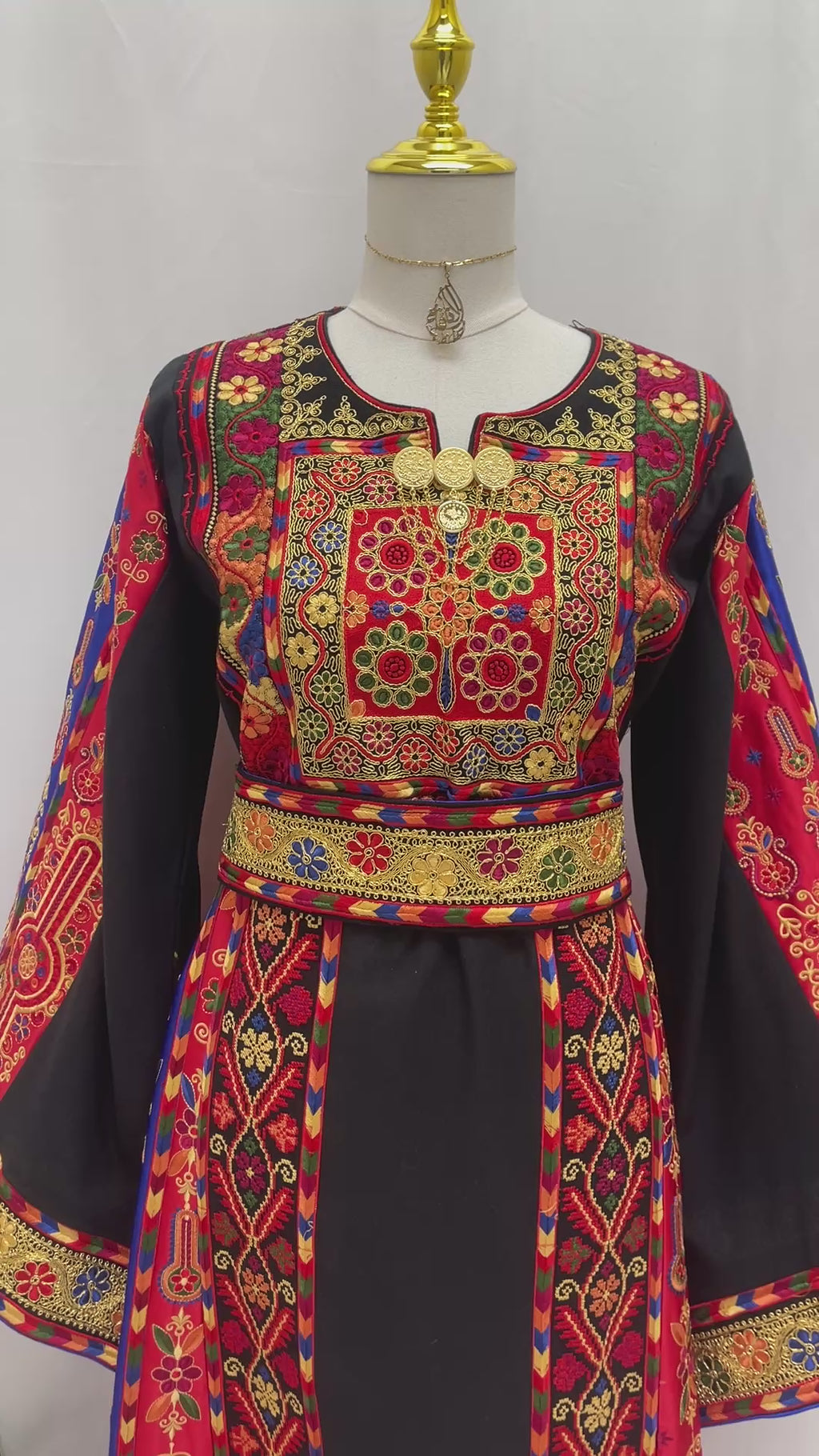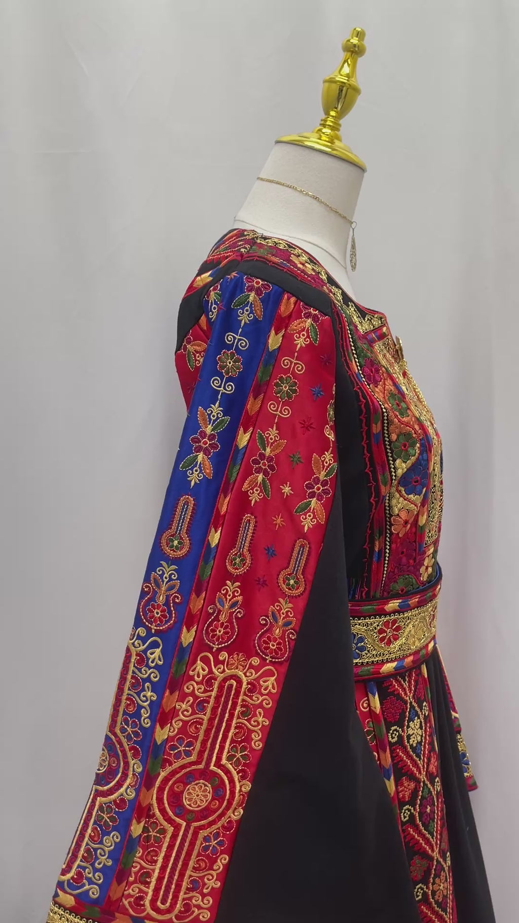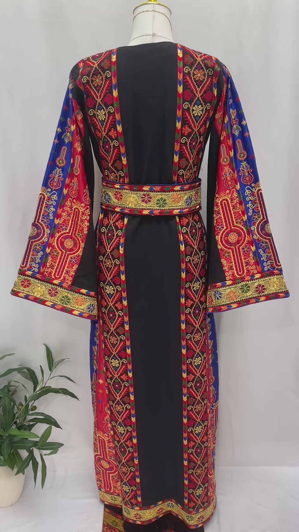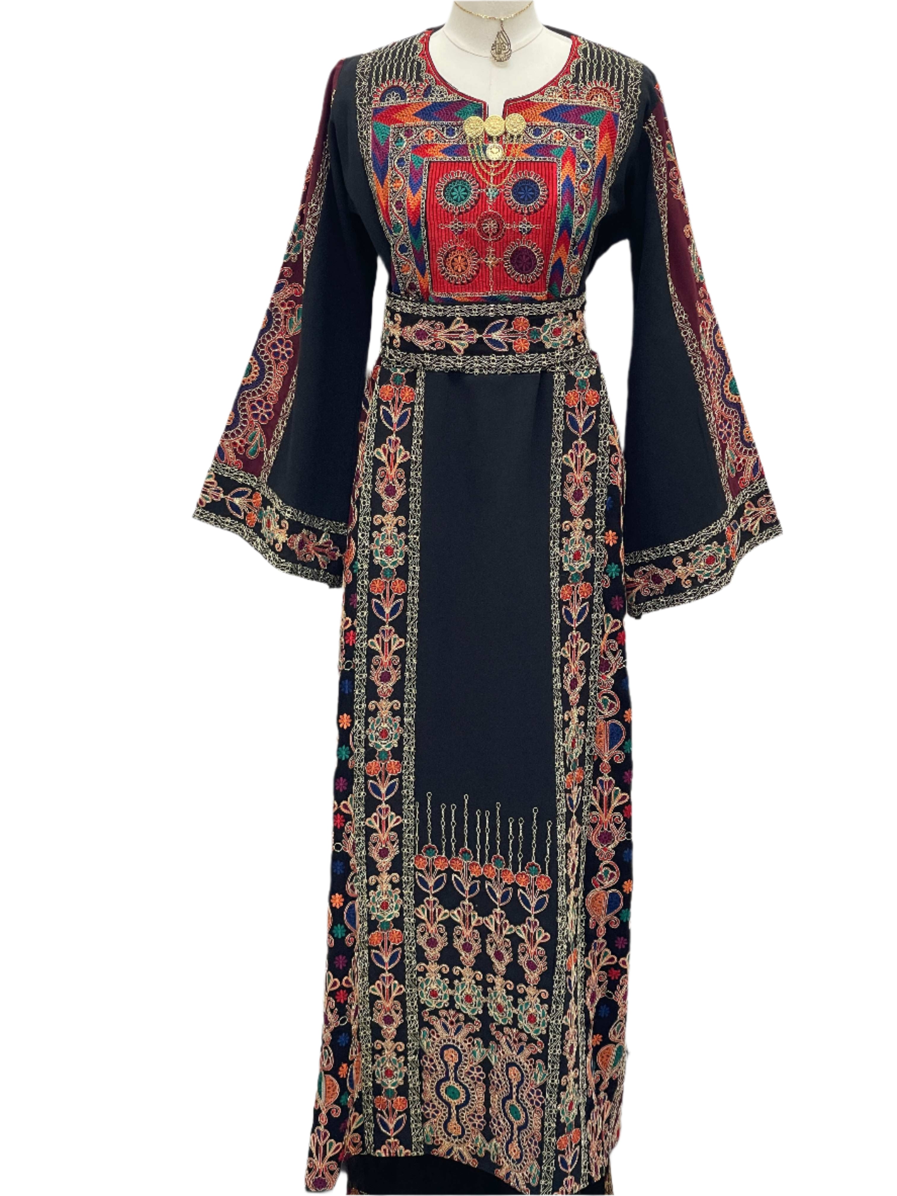 Mona Soft Atmeen Thoub Kasab Embroidery traditional Palestinian dress with intricate red blue and gold embroidery