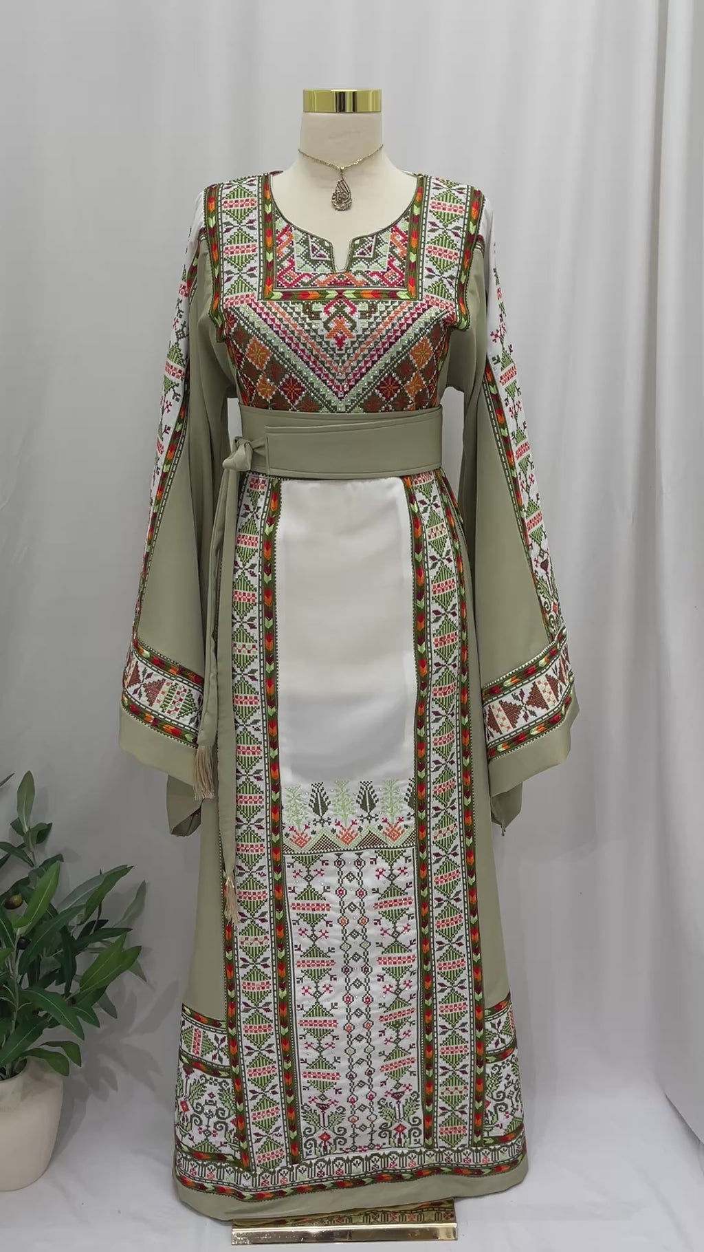 This thobe serves as a wearable tribute to craftsmanship and cultural roots. It links contemporary fashion with ancient Palestinian traditions through detailed embroidered patterns and color selection. The olive tone, sometimes called olio, stands for peace and growth. This color enhances the garment's rich heritage.