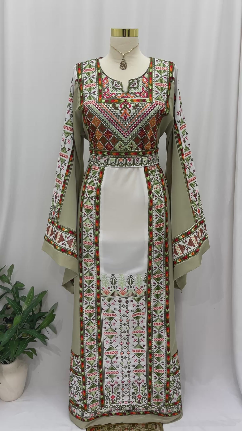 The Olive Heritage Embroidered Thobe is a refined celebration of traditional Palestinian craftsmanship with a modern design twist. This beautiful garment features intricate embroidery inspired by heritage motifs. These patterns are carefully placed on the bodice, sleeves, and front panel to offer a balanced and elegant look.