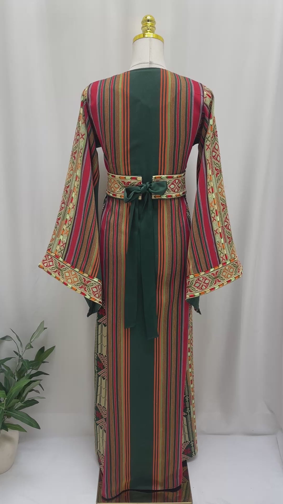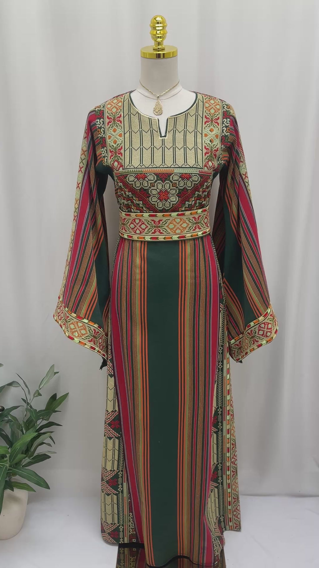 A beautiful Palestinian embroidered dress Majdalawi Heritage Thobe is inspired by authentic Palestinian craftsmanship. This garment features rich geometric embroidery on the bodice and sleeves, combined with traditional striped Majdalawi fabric in warm, earthy tones. The embroidered dress has a fitted waist that enhances the feminine silhouette, while the wide, flowing sleeves add elegance and movement. The cultural essence of this piece perfectly reflects the spirit of timeless heritage fashion. It is an ideal choice for cultural events, special occasions, or anyone who loves designs inspired by Palestinian traditions.