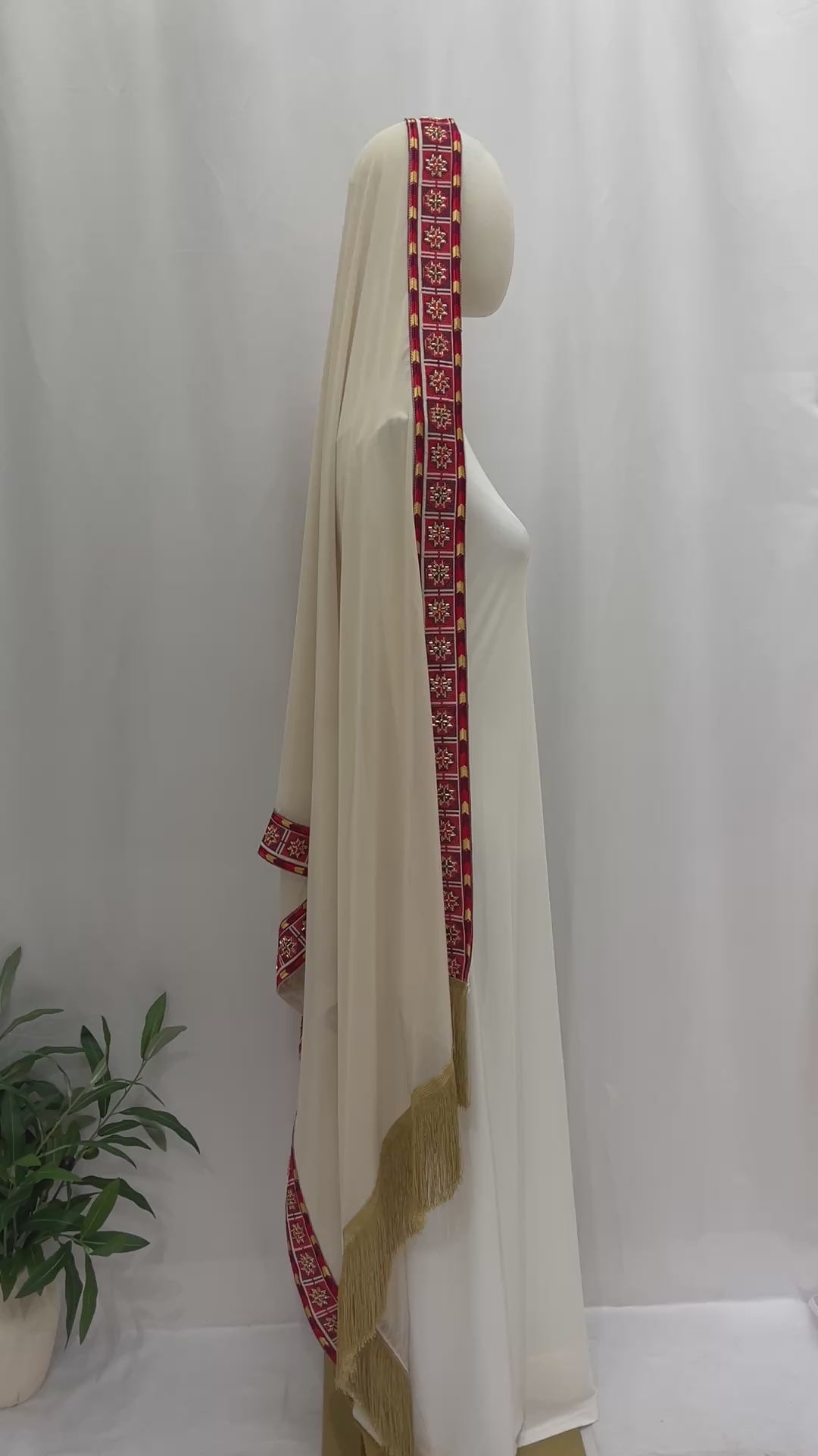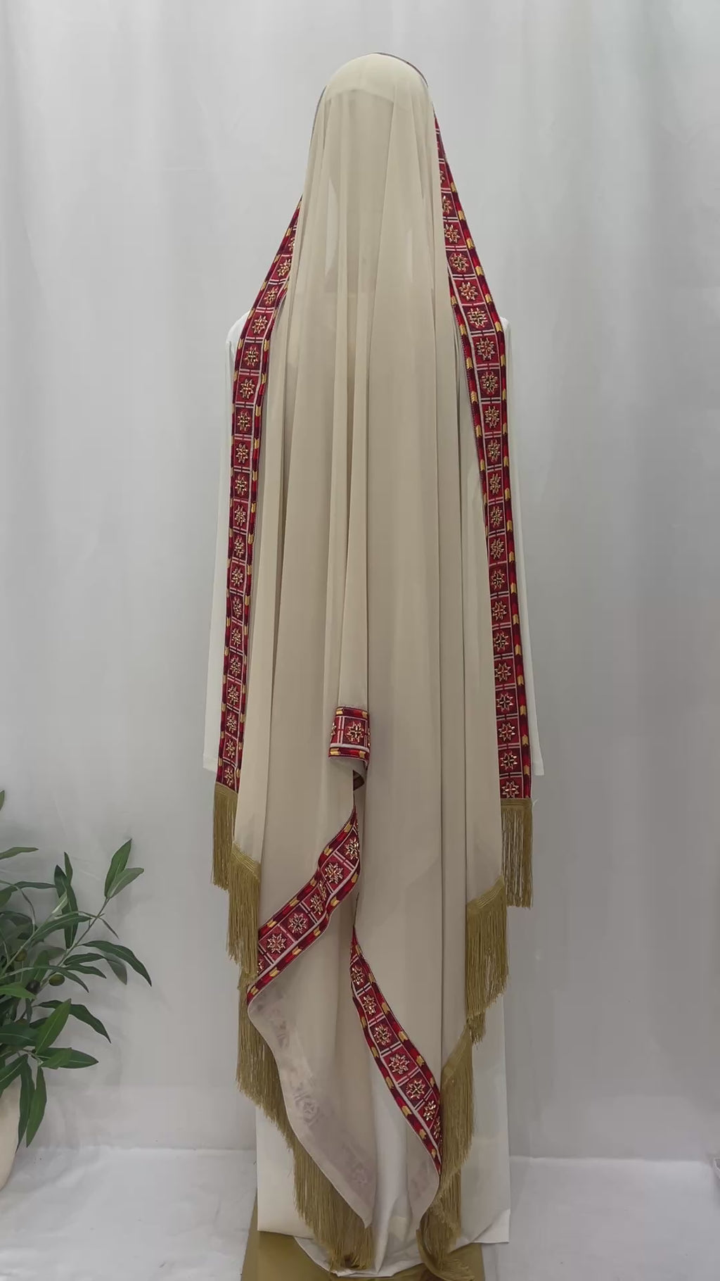 To highlight its design, pair the shawl with dresses, tunics, or long skirts. The long length makes it easy to drape elegantly over shoulders or wrap comfortably for warmth. The red embroidery and golden tassels provide eye-catching details that elevate simple styles. Winter or summer, this shawl remains a signature piece for modest fashion lovers.