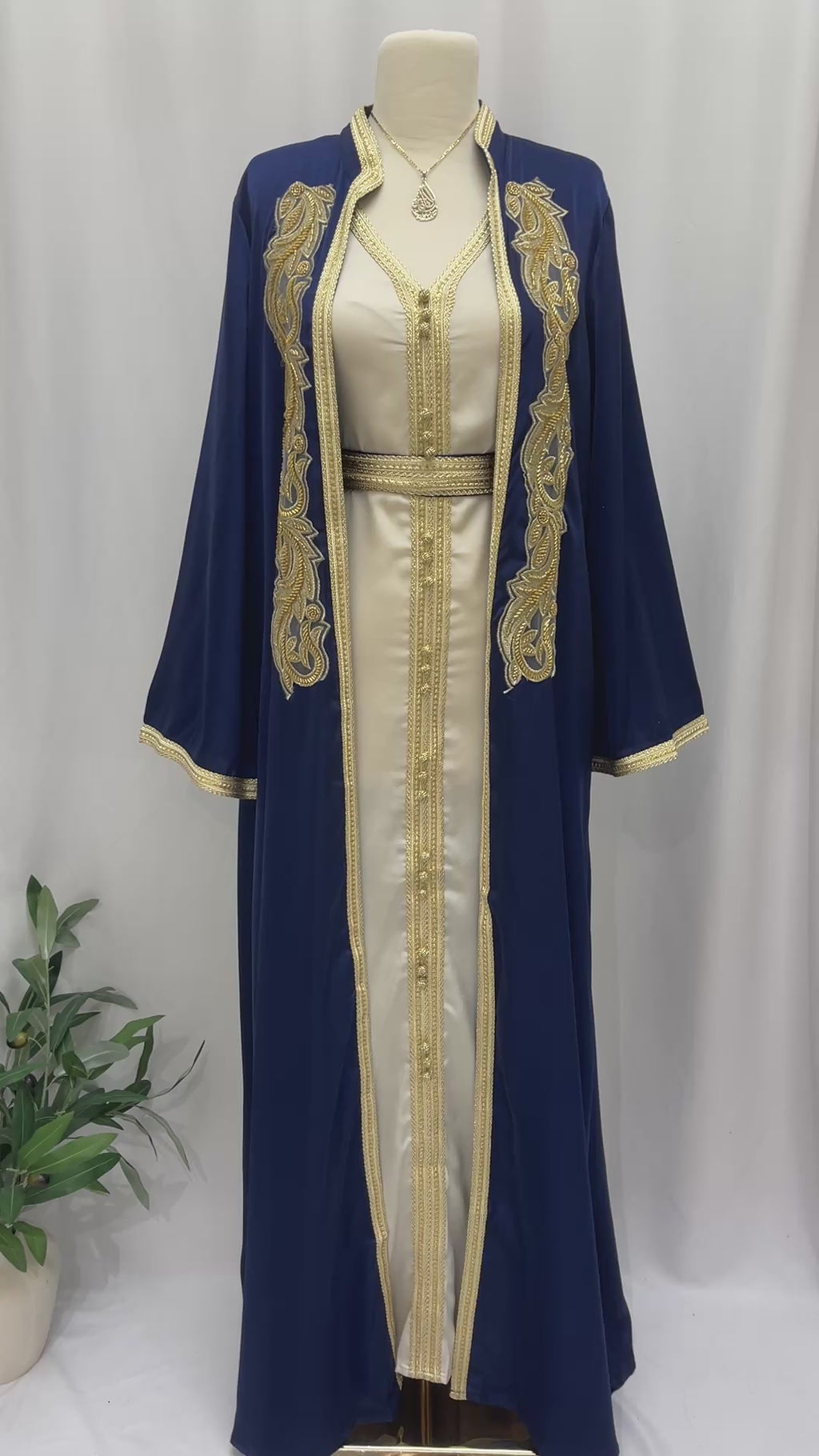 A statement of refined elegance, this luxurious ensemble features a smooth satin inner dress paired with a flowing outer layer in rich sapphire blue. The carefully crafted combination creates a striking visual impact that evokes a sense of royalty and grace. This Royal kaftan is perfect for those who appreciate timeless fashion with a modern touch. It blends tradition and sophistication effortlessly, making it an essential piece for any wardrobe inspired by regal style.
