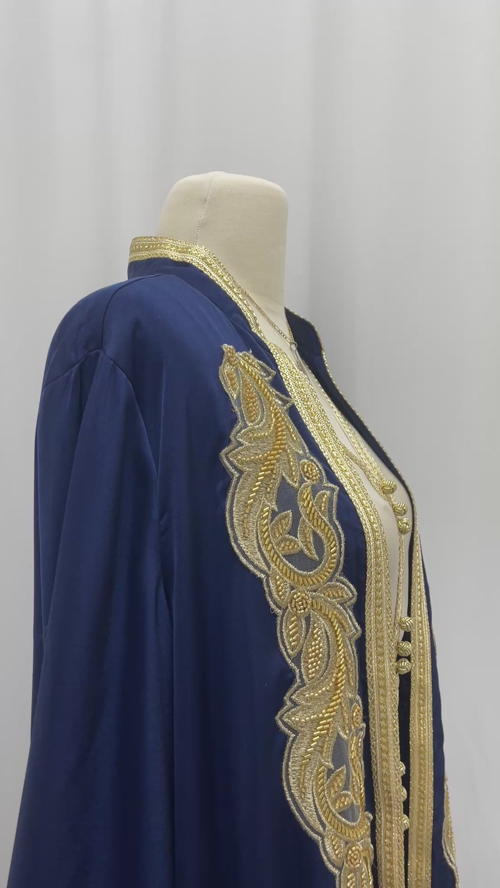Drawing inspiration from the icon of the sea, this kaftan celebrates the majestic qualities of the ocean. The deep blue color resembles the vastness and mystery of the seas, while the gold embroidery mirrors sunlight glistening on the waves. This makes it an extraordinary outfit, perfect for those who want to embody an aura of power and beauty.