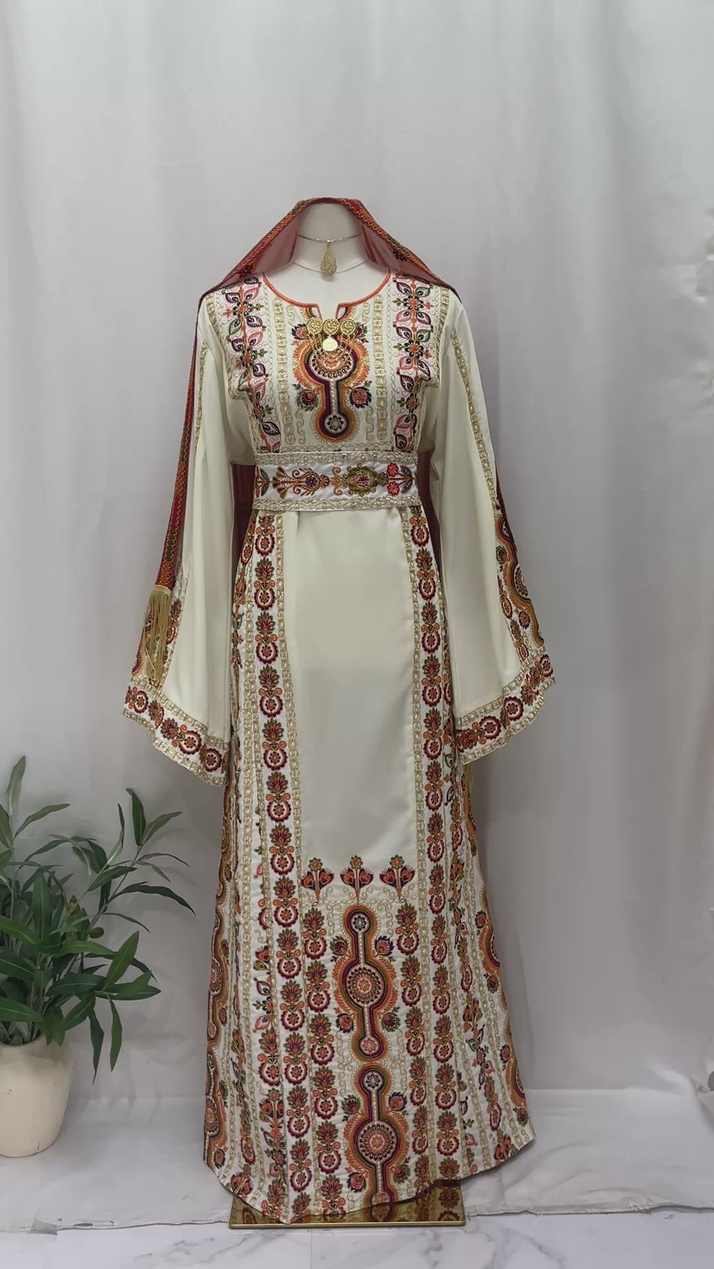 The Salma Ivory Embroidered Thoub from Palestinian Elegance brings tradition and elegance together. This dress features rich embroidery on a soft ivory fabric. Each detail stands out, with bold patterns arranged on the sleeves, bodice, and skirt. The embroidery showcases motifs inspired by classic Palestinian artwork.
