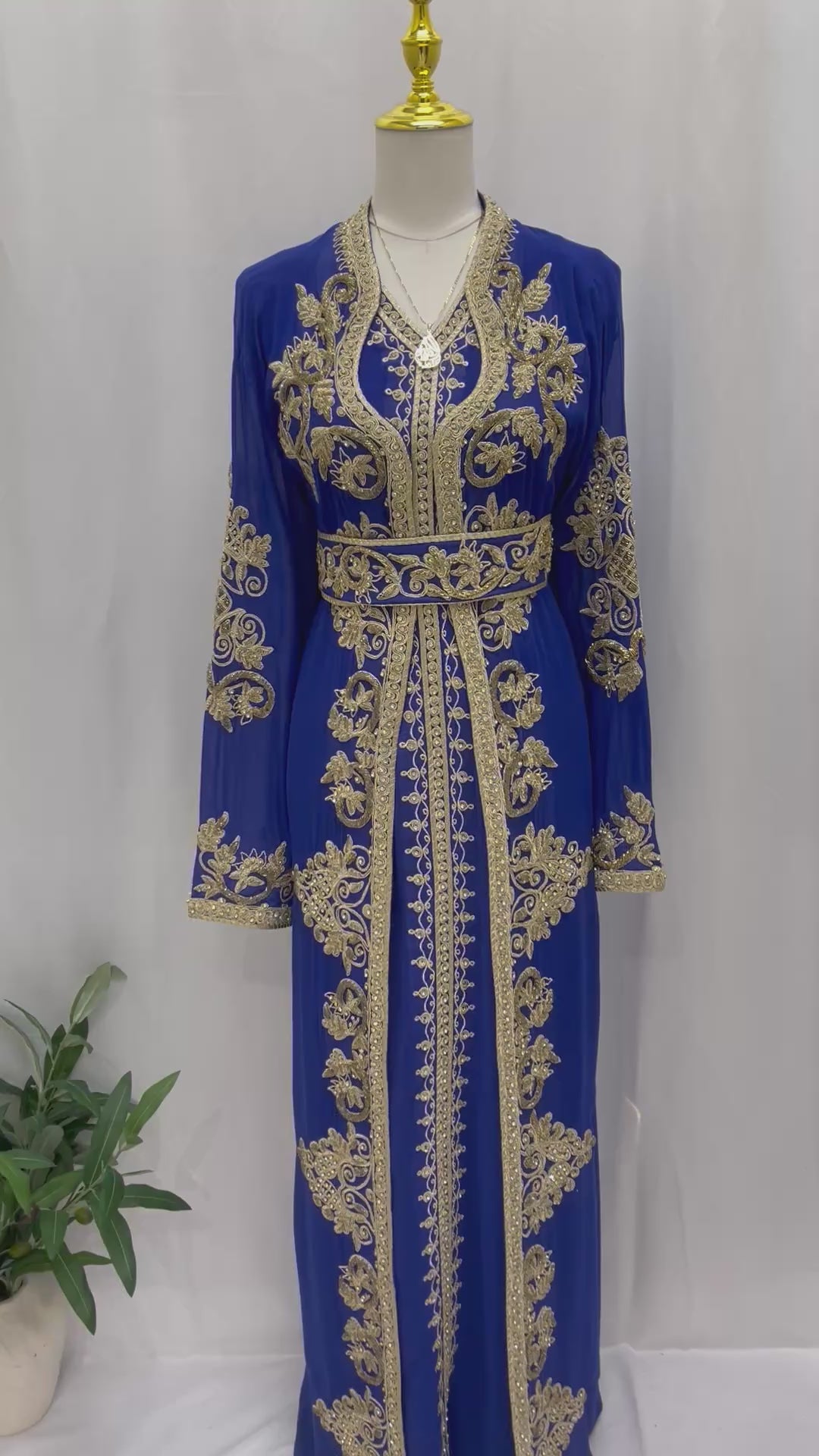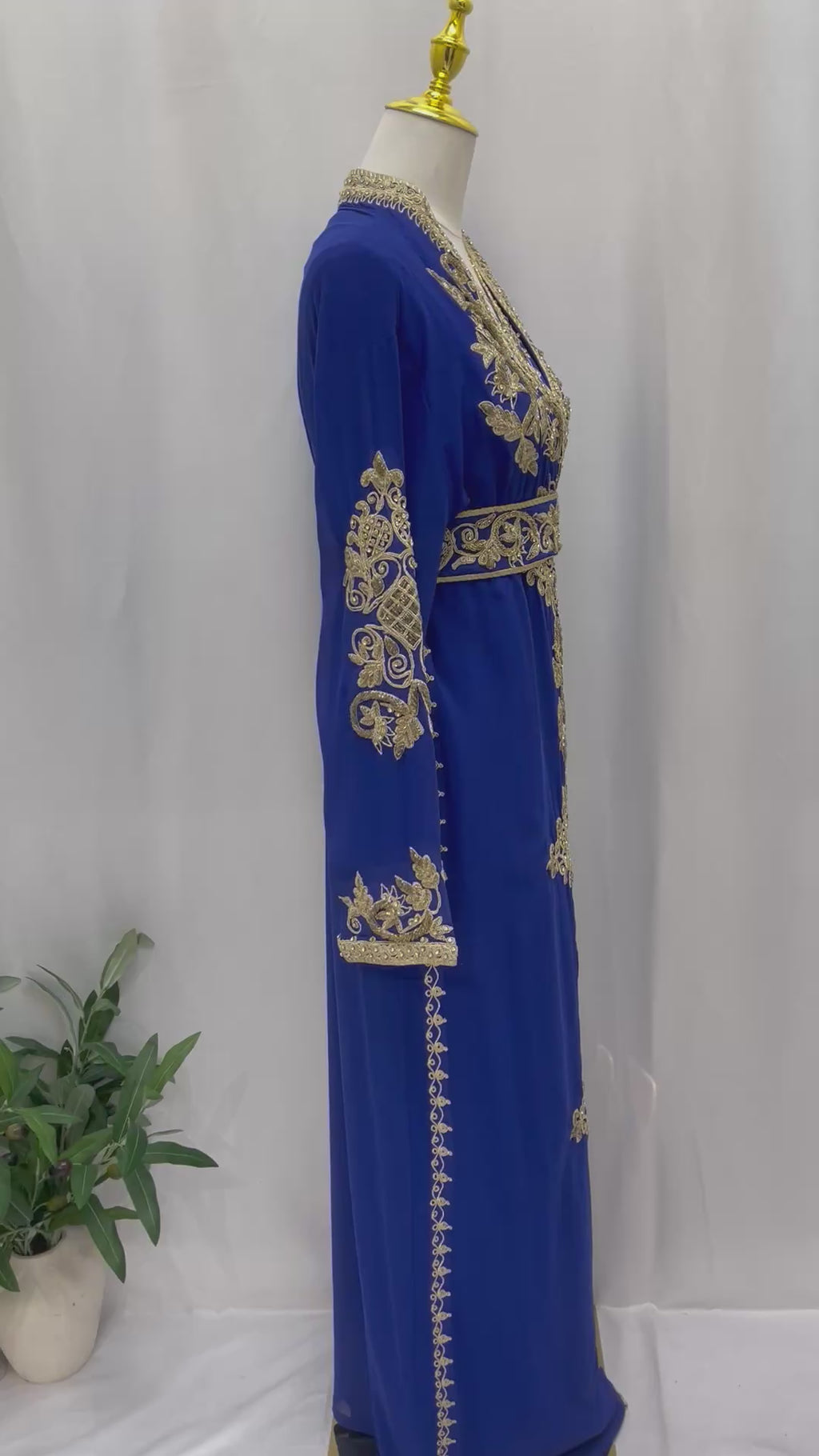 Step into elegance with the Salma Moroccan Style Kaftan from Palestinian Elegance. This stunning piece showcases intricate embroidery along the neckline, sleeves, and front panel. The rich blue fabric combined with golden patterns creates a unique look. Each Moroccan Style Kaftan is crafted to capture tradition and style.