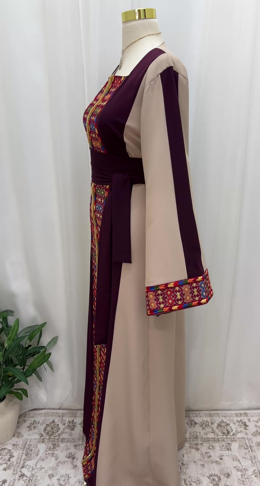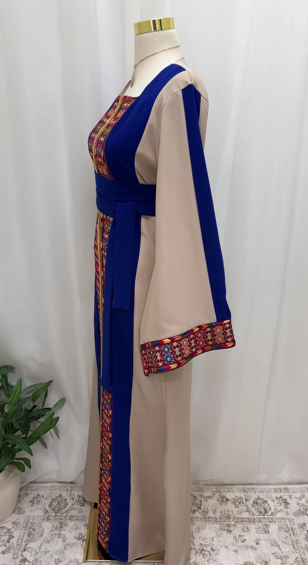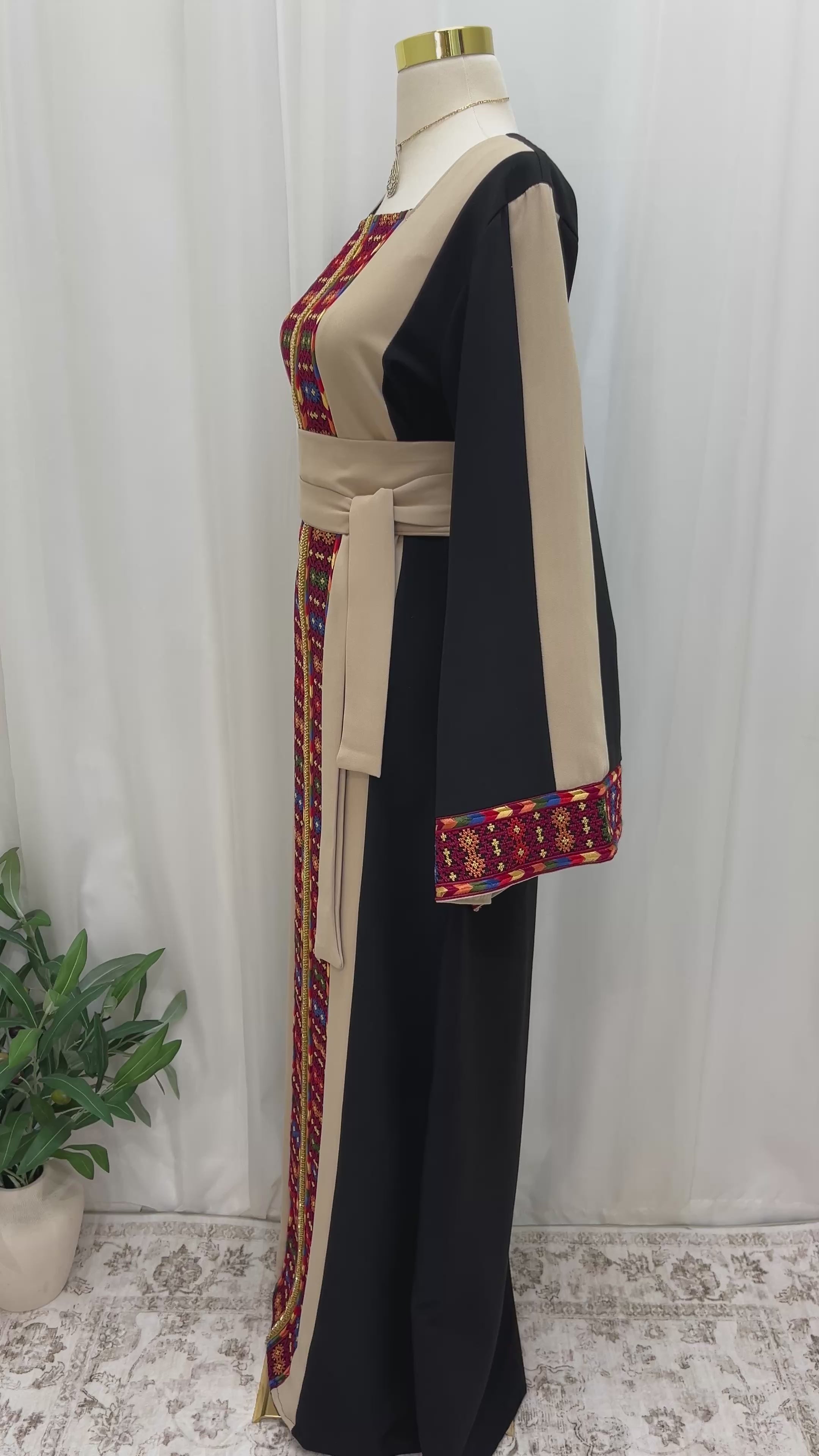 The wide, flowing sleeves of this thobe create elegant movement and comfort for the wearer. These sleeves, combined with the matching wrap belt, define the waist beautifully. The wrap belt can be styled in multiple ways according to personal preference, enhancing the overall look and fit.