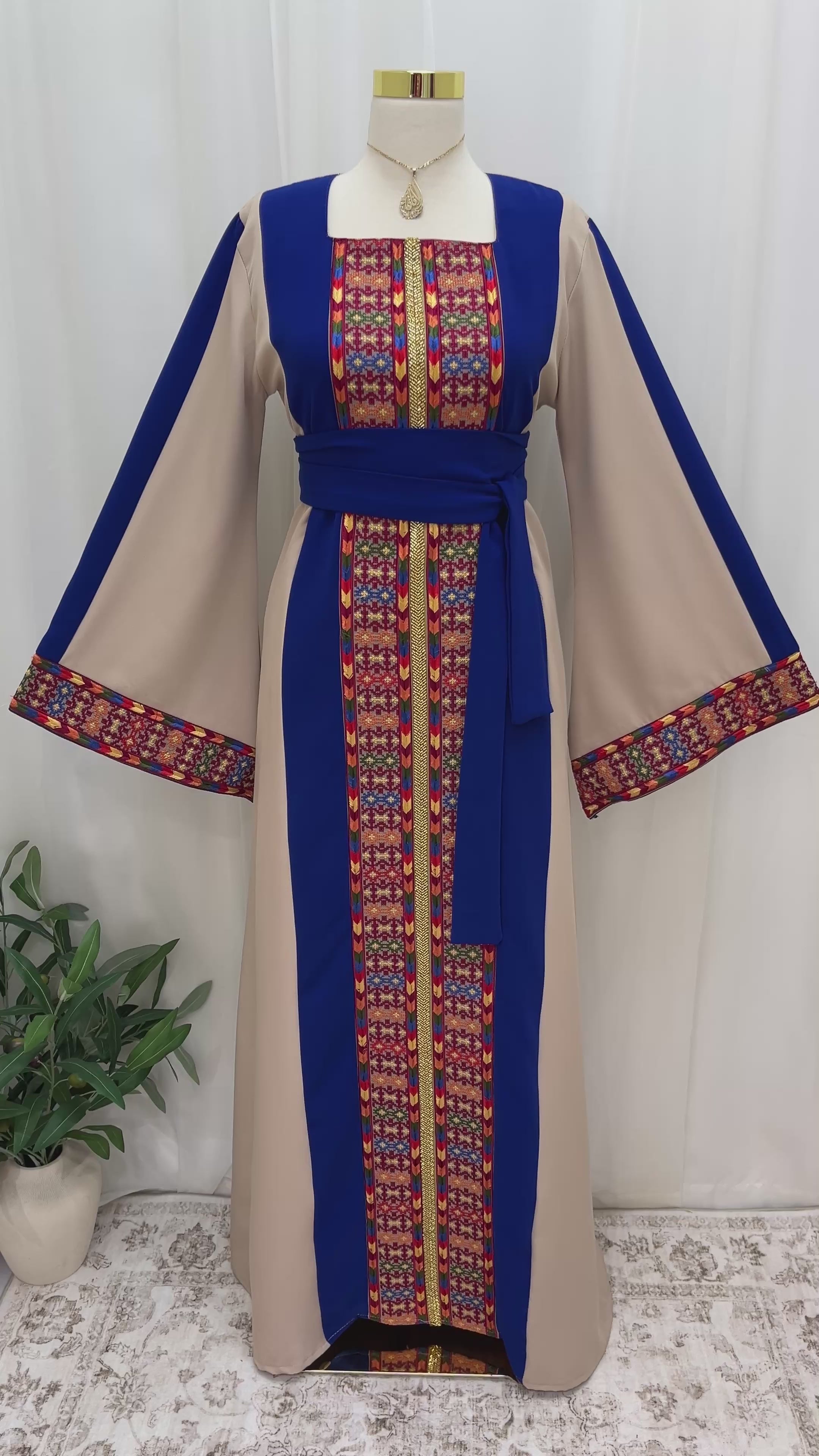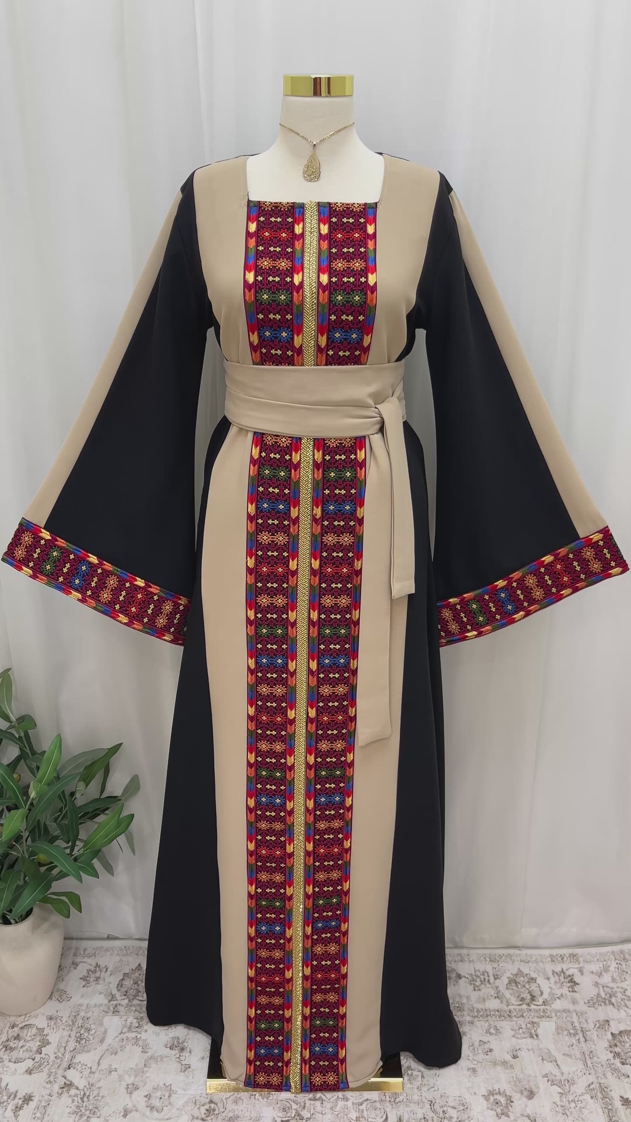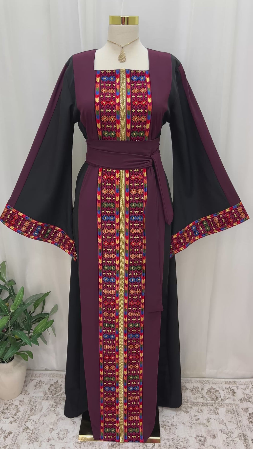 The wide, flowing sleeves of this thobe create elegant movement and comfort for the wearer. These sleeves, combined with the matching wrap belt, define the waist beautifully. The wrap belt can be styled in multiple ways according to personal preference, enhancing the overall look and fit.