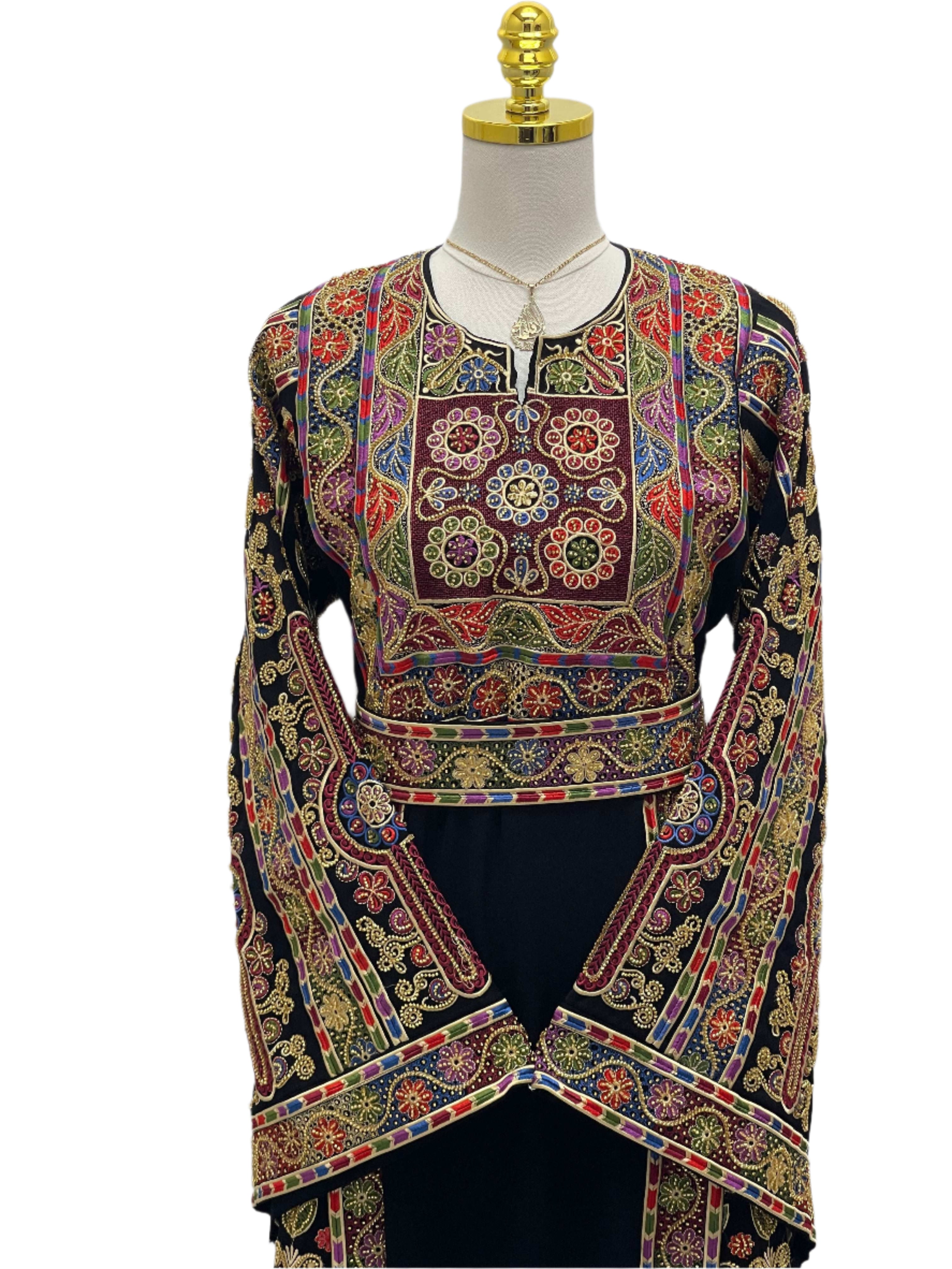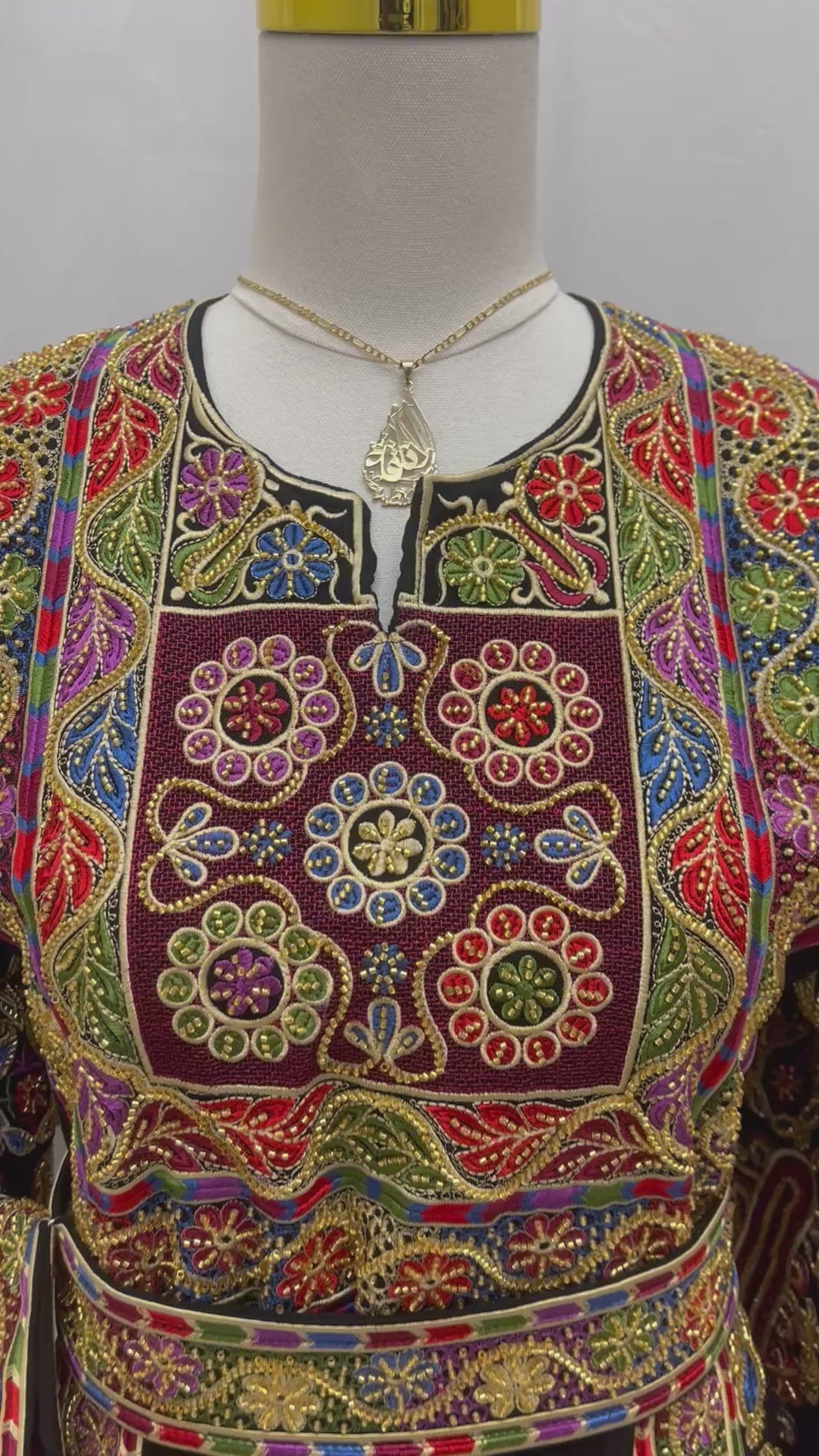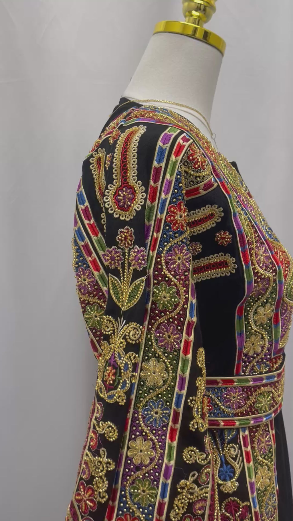 Enjoy free U.S. shipping for orders over $149 at Palestinian Elegance. Wearing the Sofie Heavily Beaded Embroidered Thoub connects you to rich history. It also adds striking beauty to your wardrobe. This thoub stands out in any collection. It is more than just a dress. It is a celebration of cultural heritage and artistry.